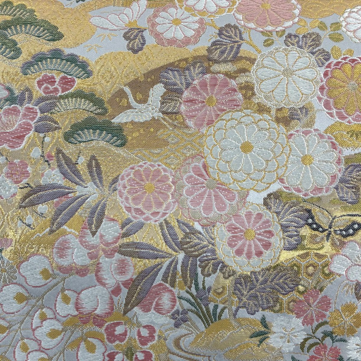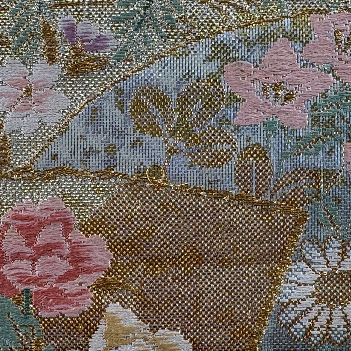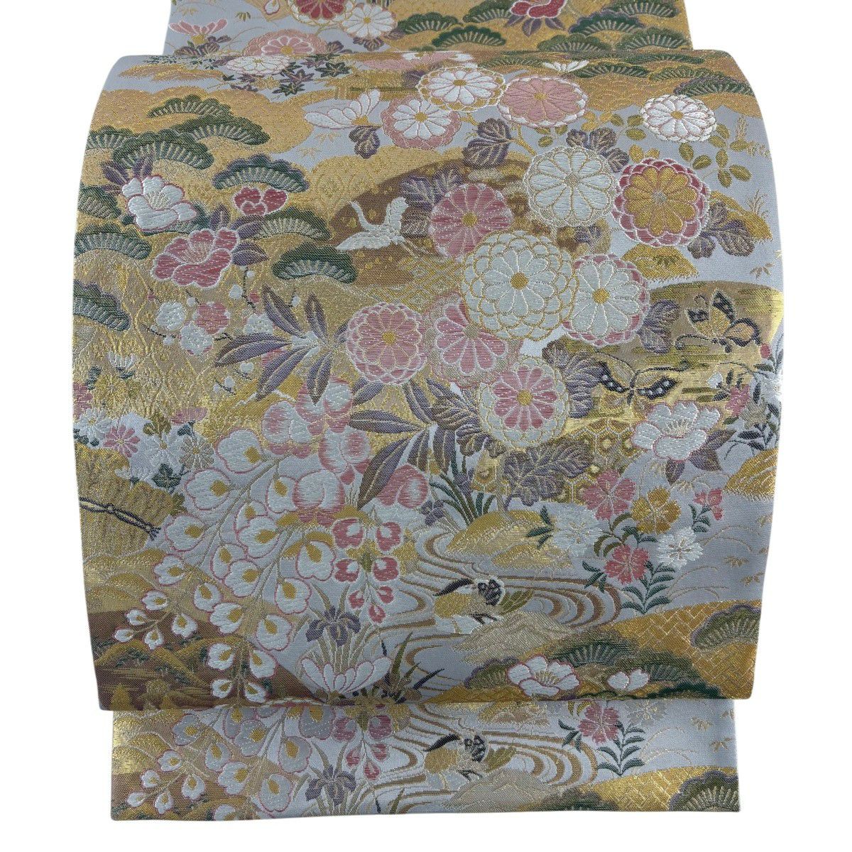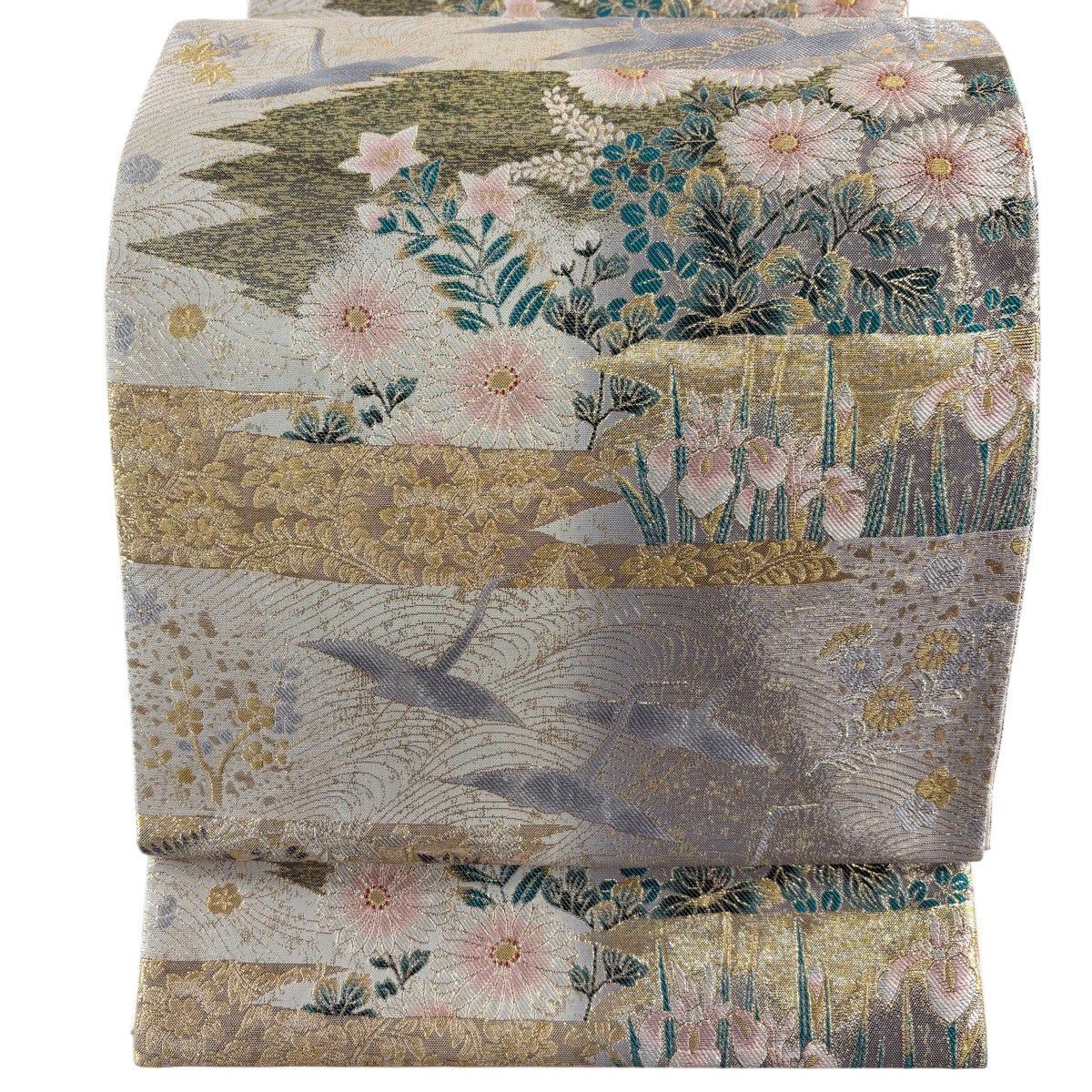 【美品】 袋帯 秀品 花鳥 流水 唐織 箔 灰色 全通 正絹