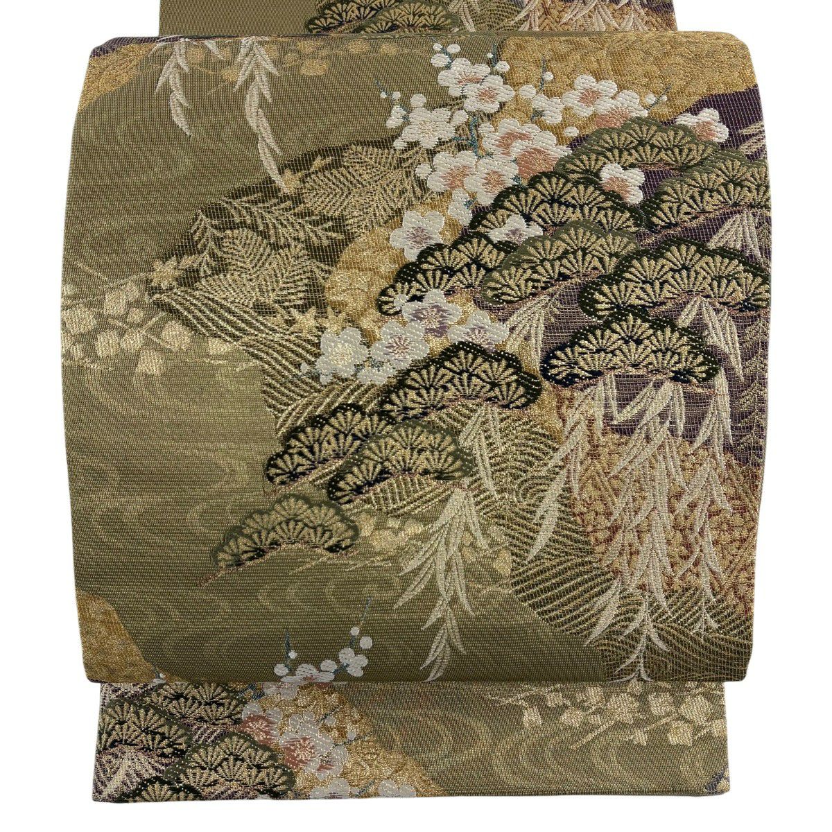 【美品】 袋帯 秀品 松 流水 金糸 箔 茶緑色 六通 正絹