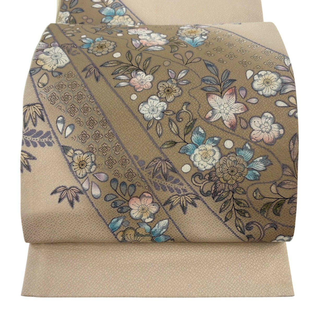 【美品】 袋帯 秀品 草花 笹 銀糸 薄茶色 お太鼓柄 正絹
