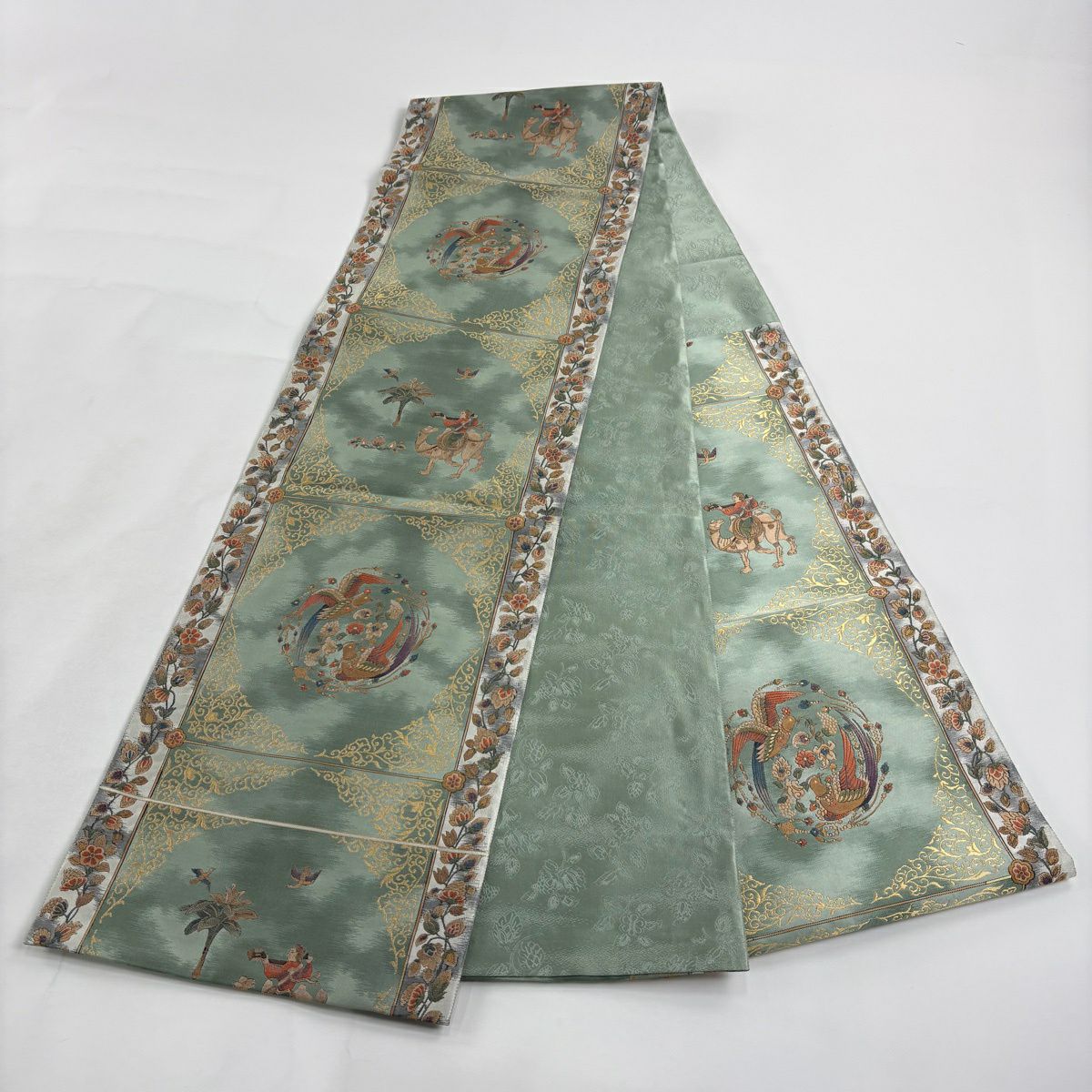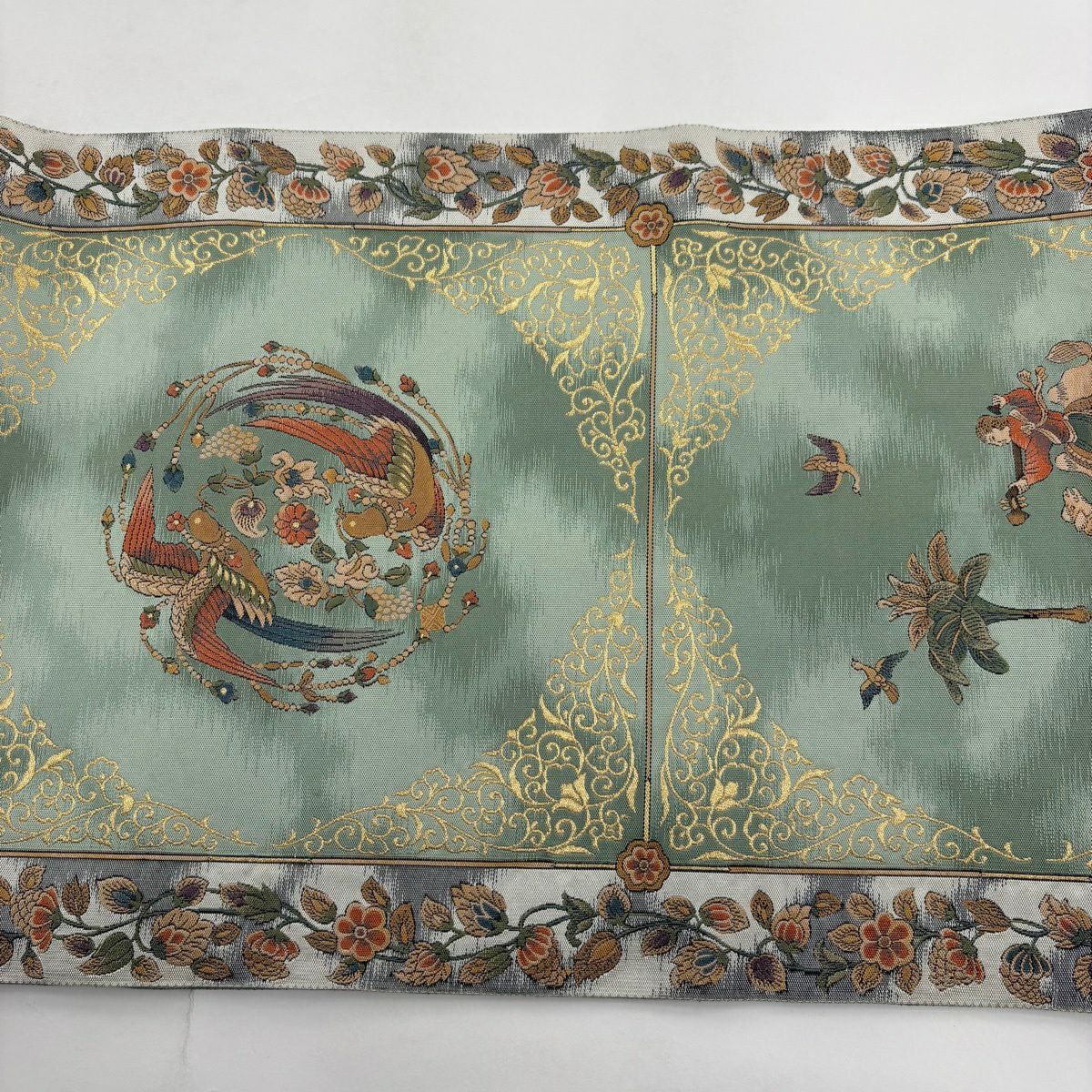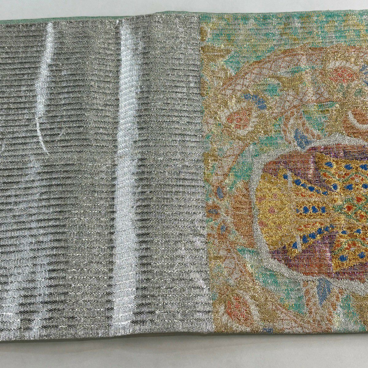 【美品】 袋帯 秀品 琵琶 草花 唐織 箔 薄緑 六通 正絹