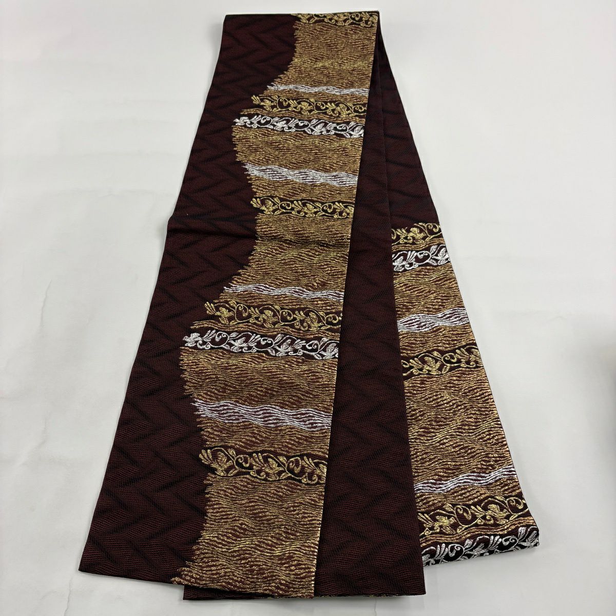 【美品】 名古屋帯 秀品 八寸名古屋帯 霞 金銀糸 えんじ色 正絹