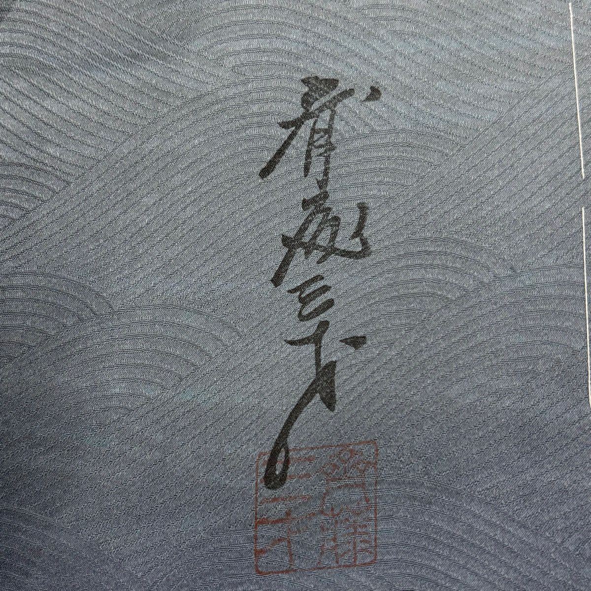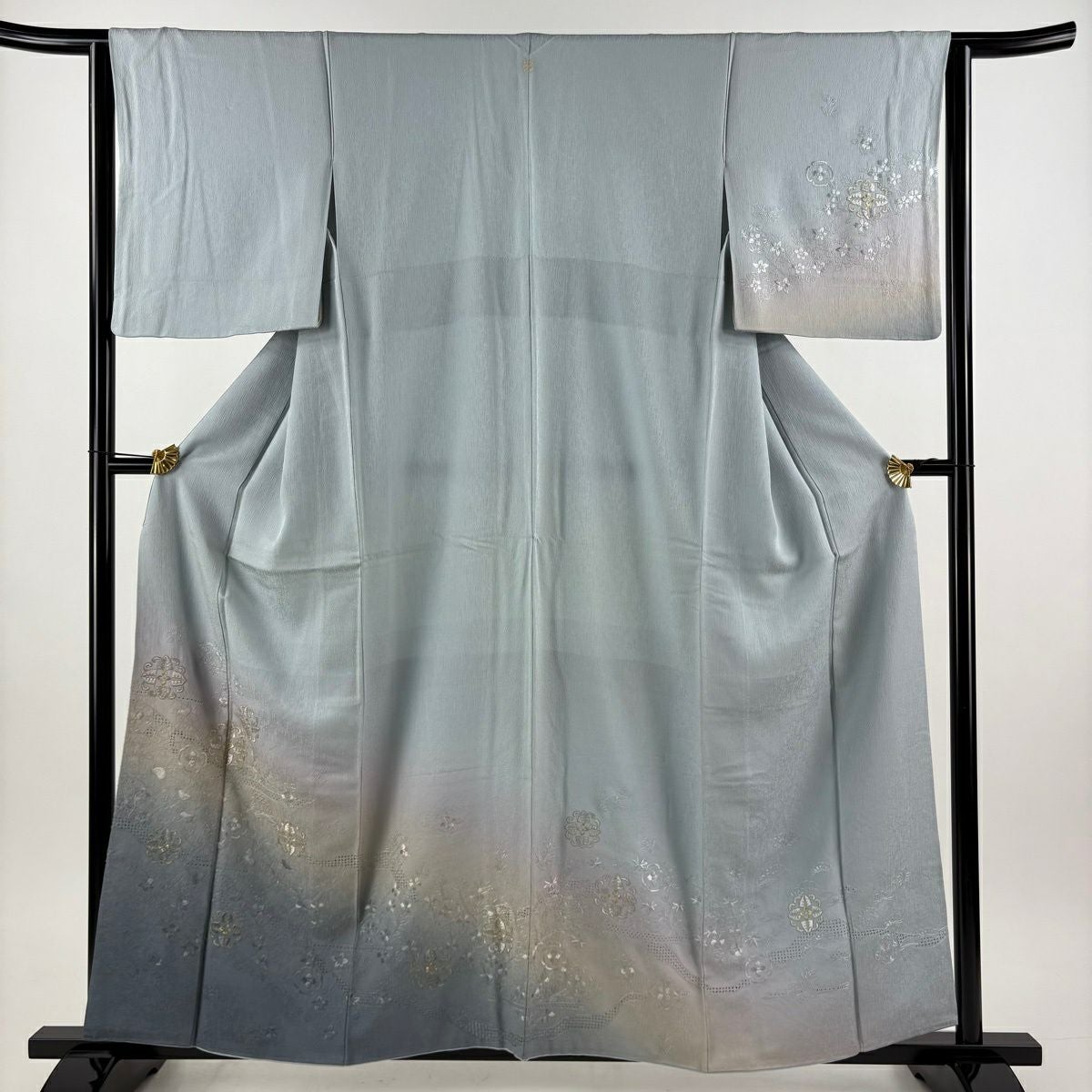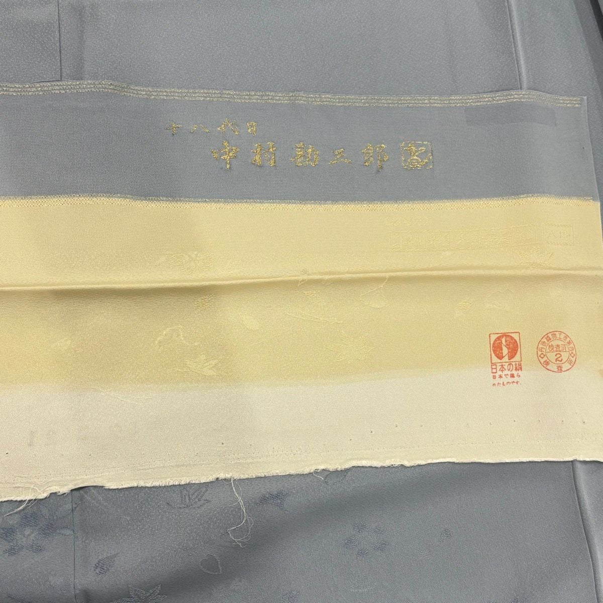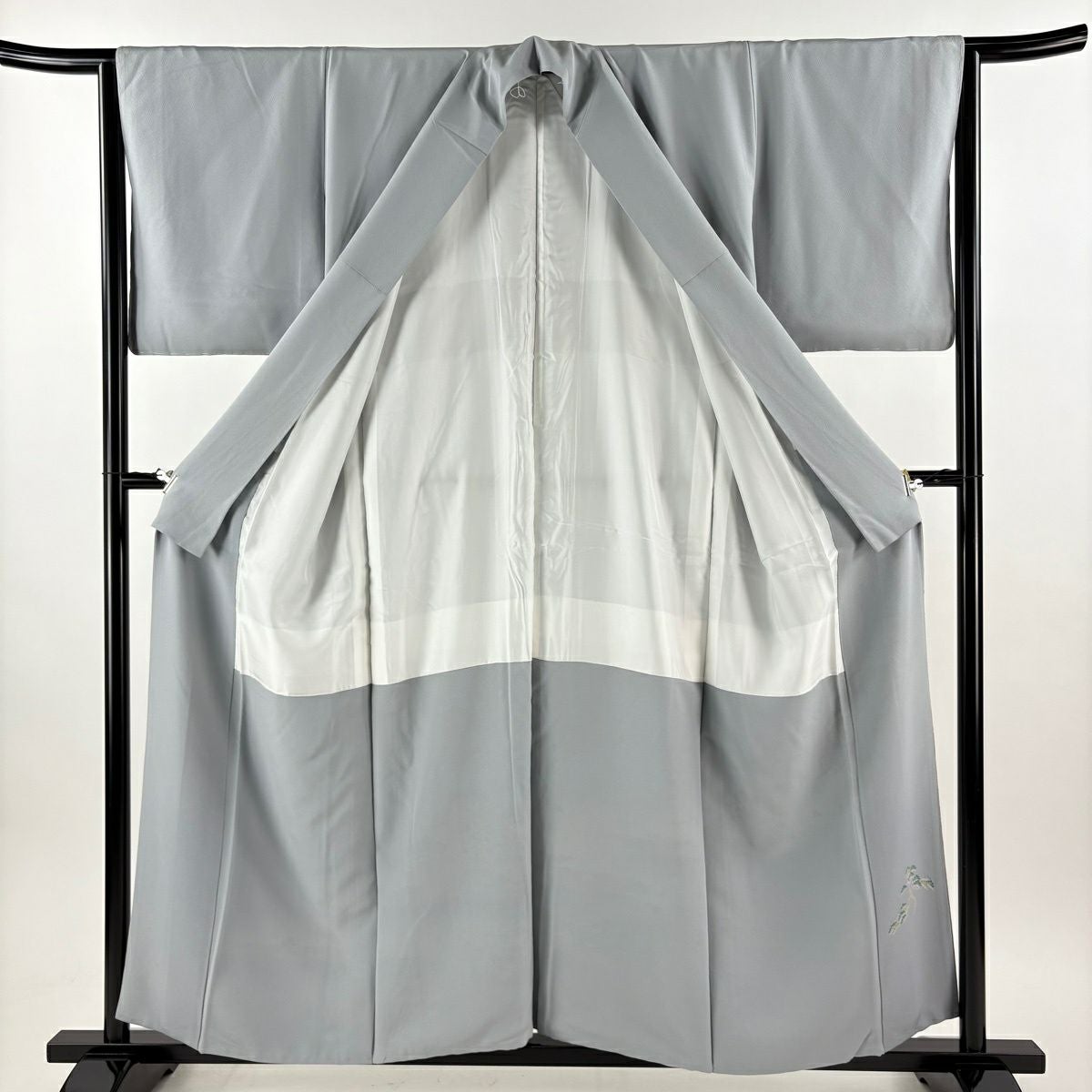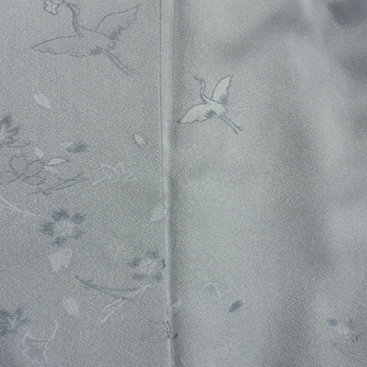 【美品】 付下げ 身丈160cm 裄丈62cm S 袷 中村勘三郎 落款あり 鶴 草花 刺繍 青灰色 正絹 秀品