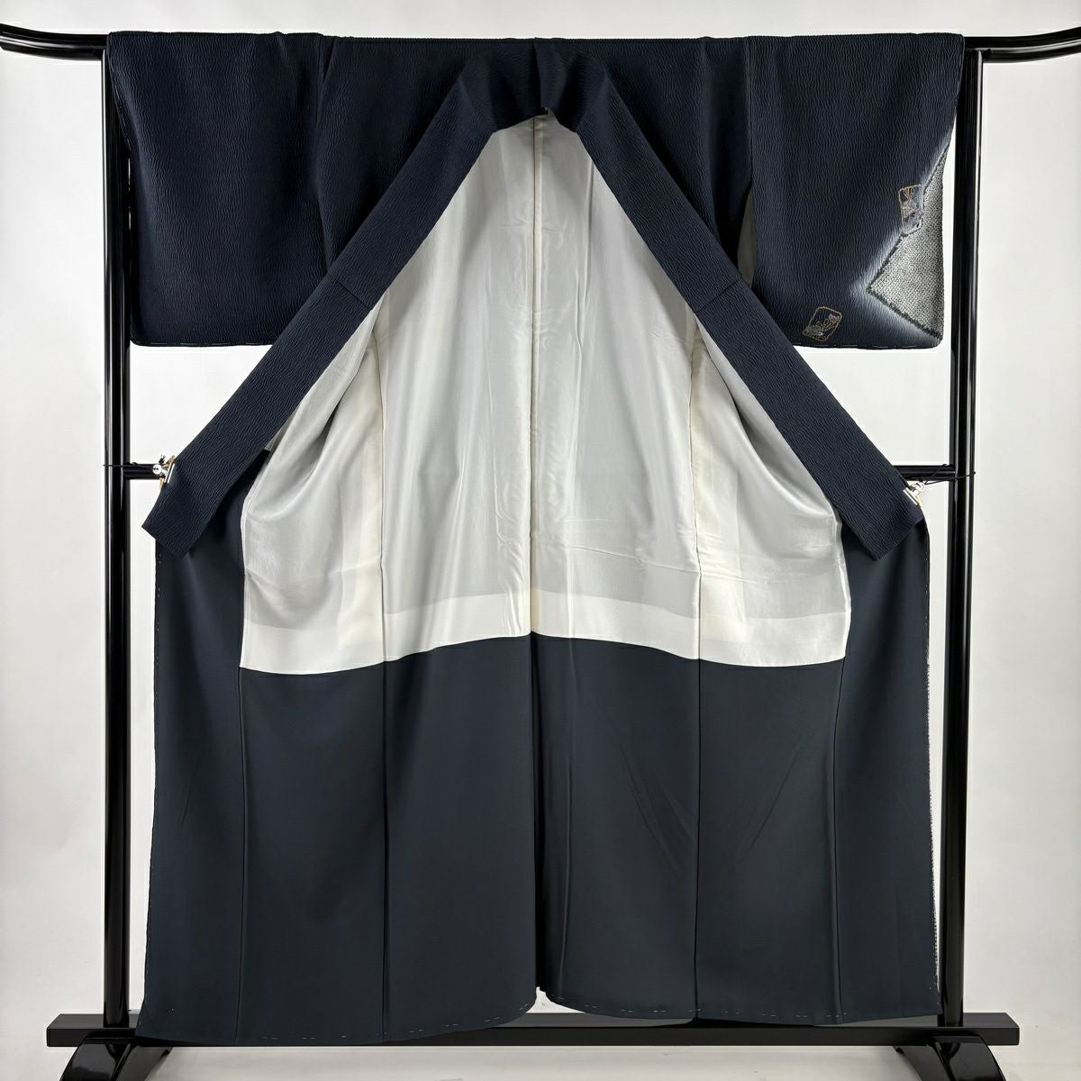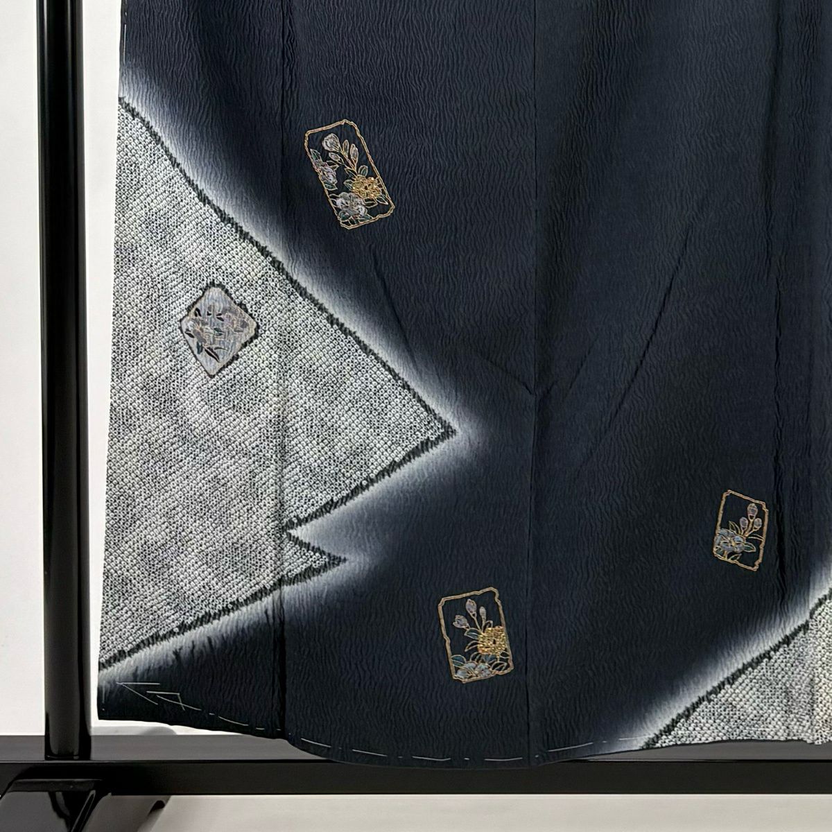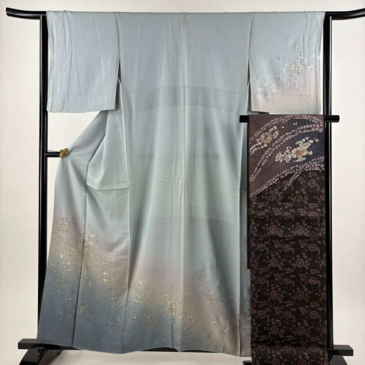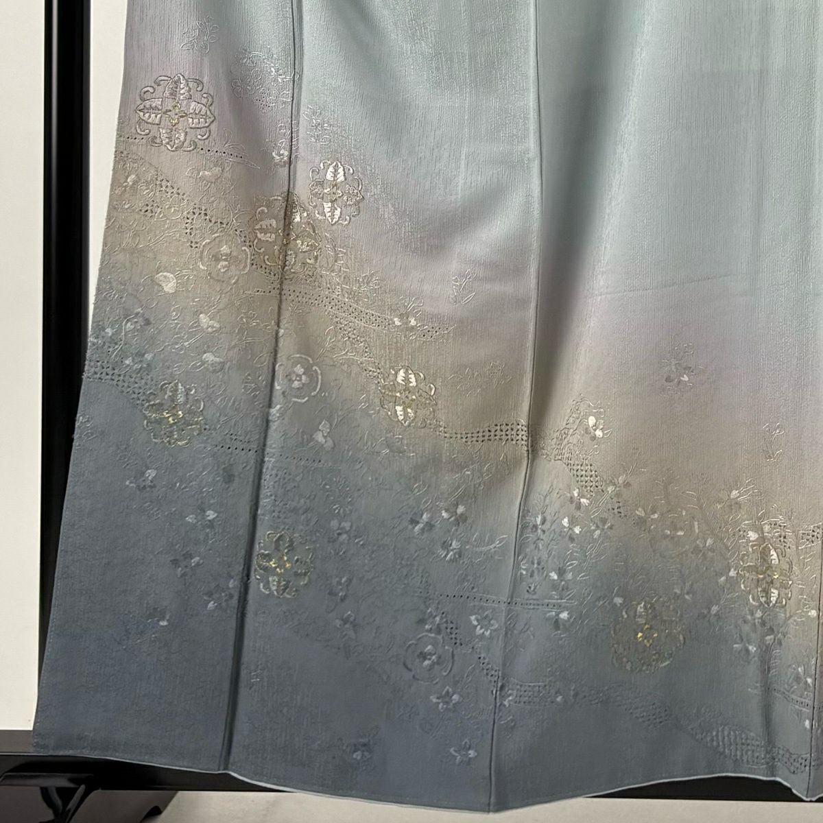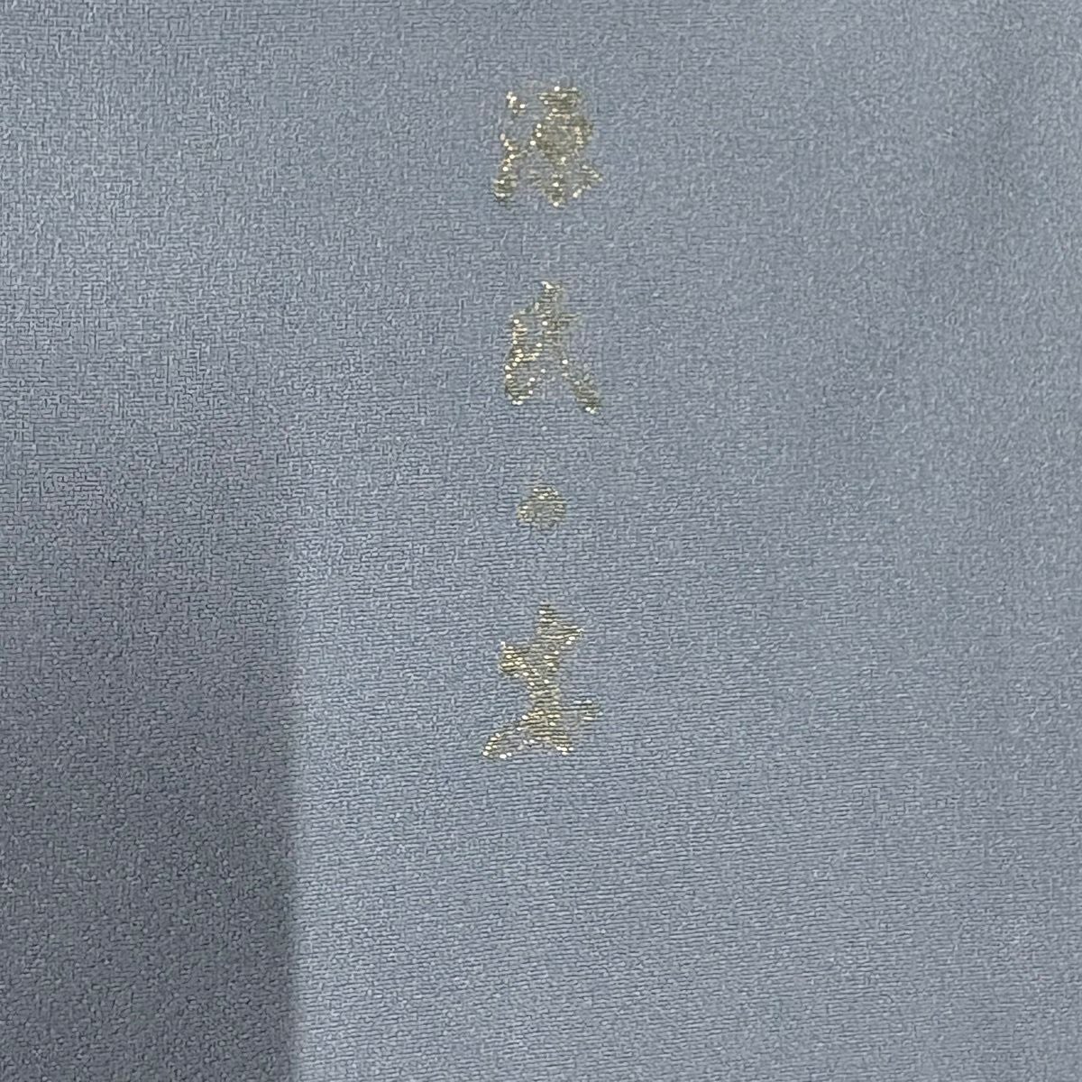 【美品】 付下げ 身丈160cm 裄丈62cm S 袷 中村勘三郎 落款あり 鶴 草花 刺繍 青灰色 正絹 秀品
