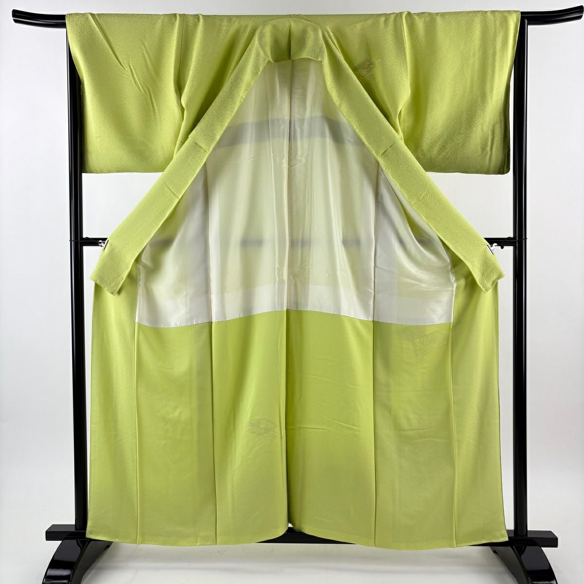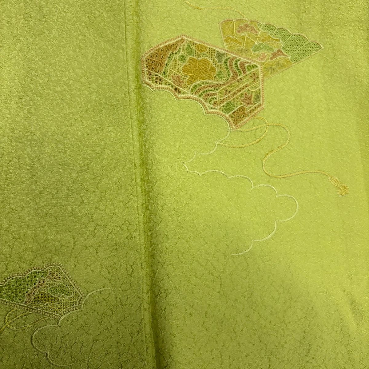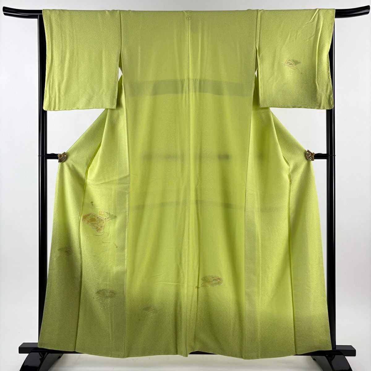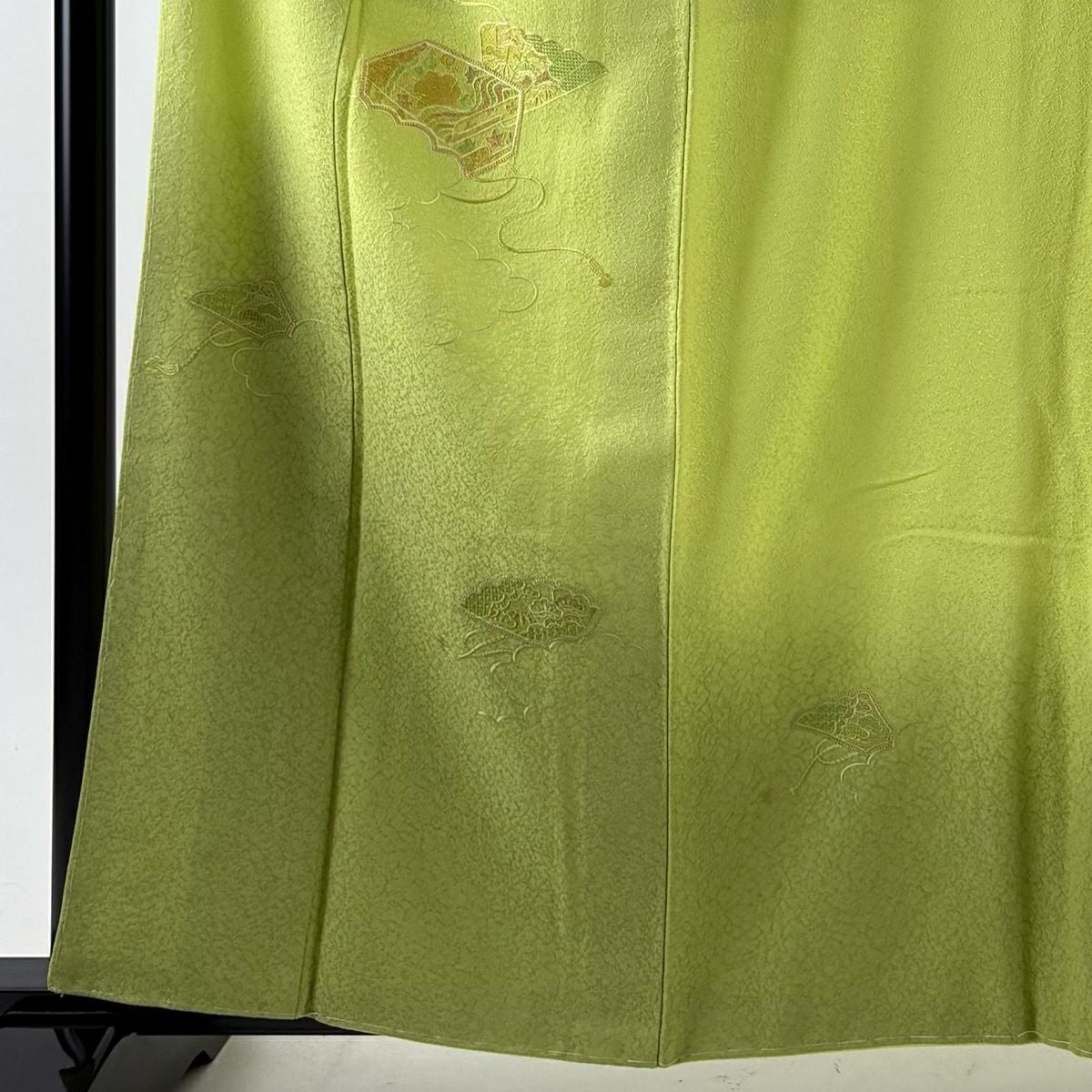 【美品】 付下げ 身丈159cm 裄丈65.5cm M 袷 檜扇 雲文 刺繍 ぼかし 黄緑色 正絹 秀品 一つ紋