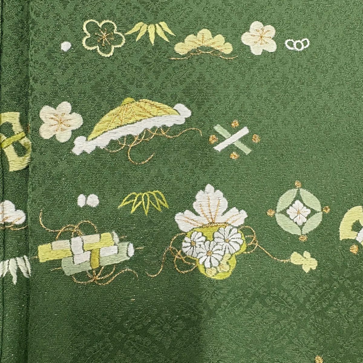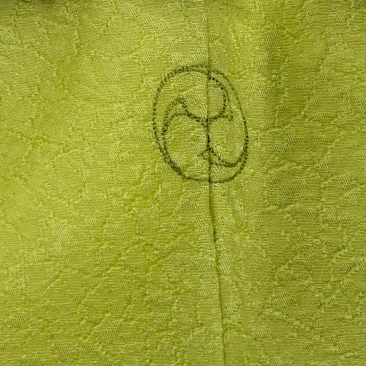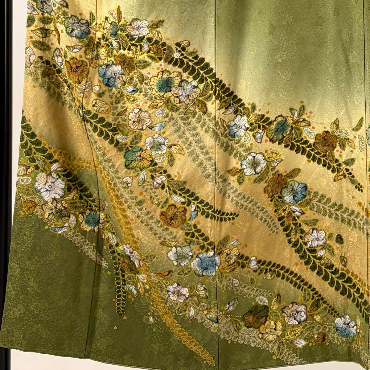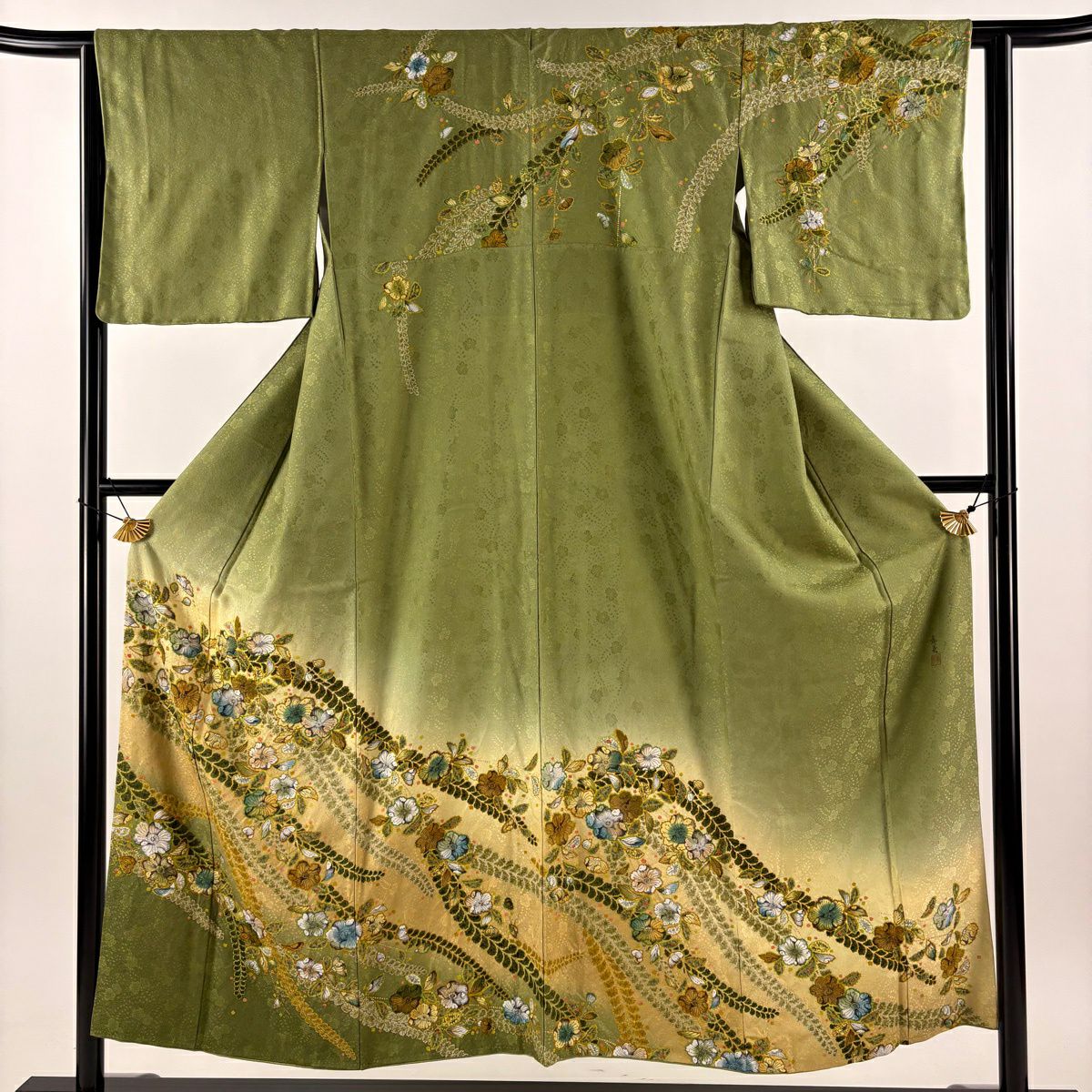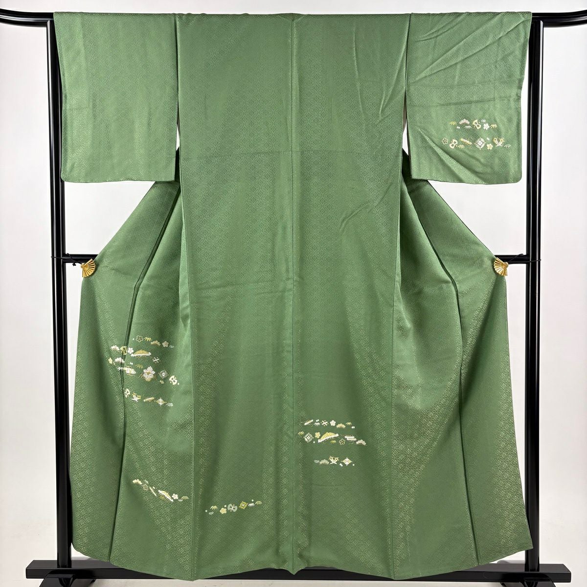 【美品】 付下げ 身丈159cm 裄丈65.5cm M 袷 檜扇 雲文 刺繍 ぼかし 黄緑色 正絹 秀品 一つ紋