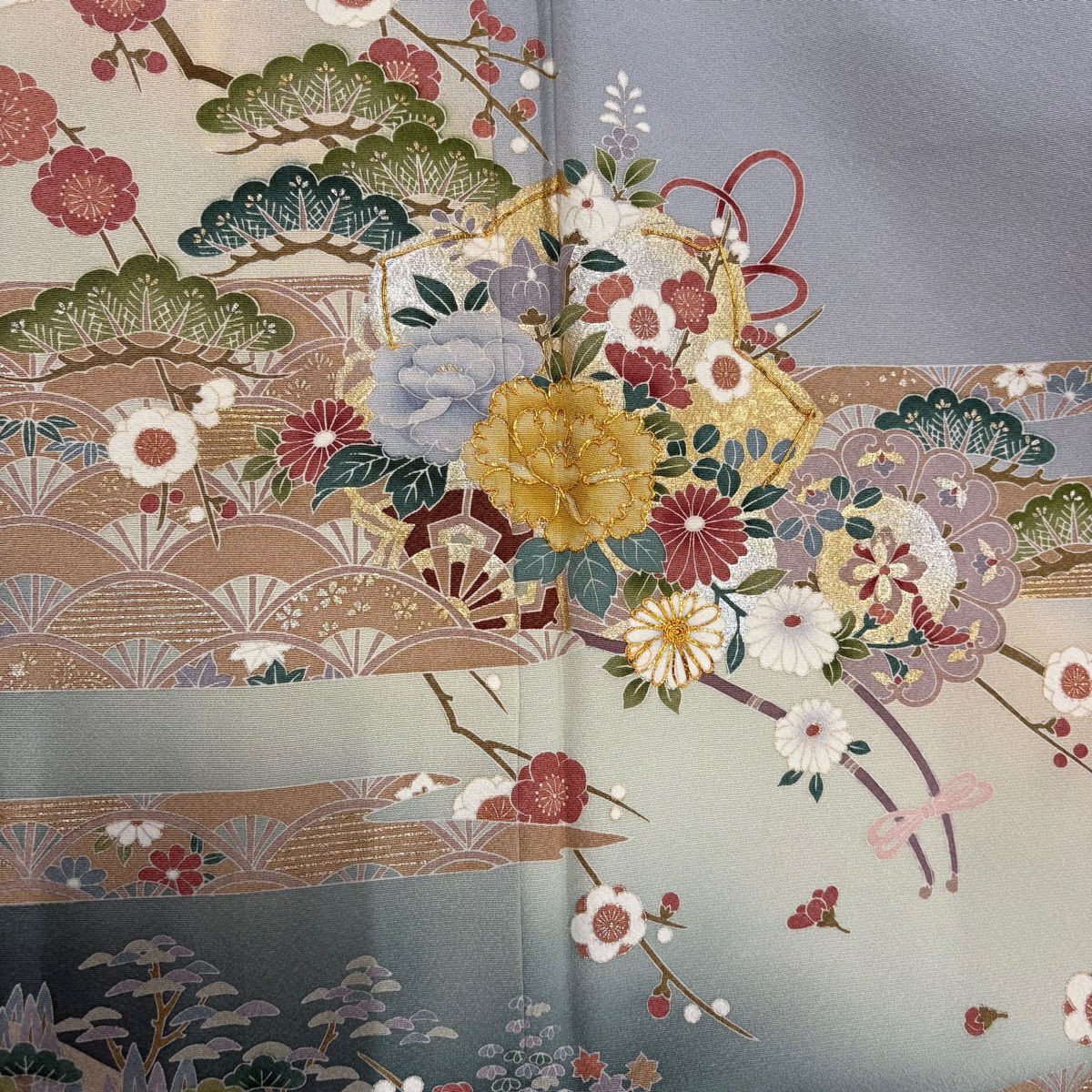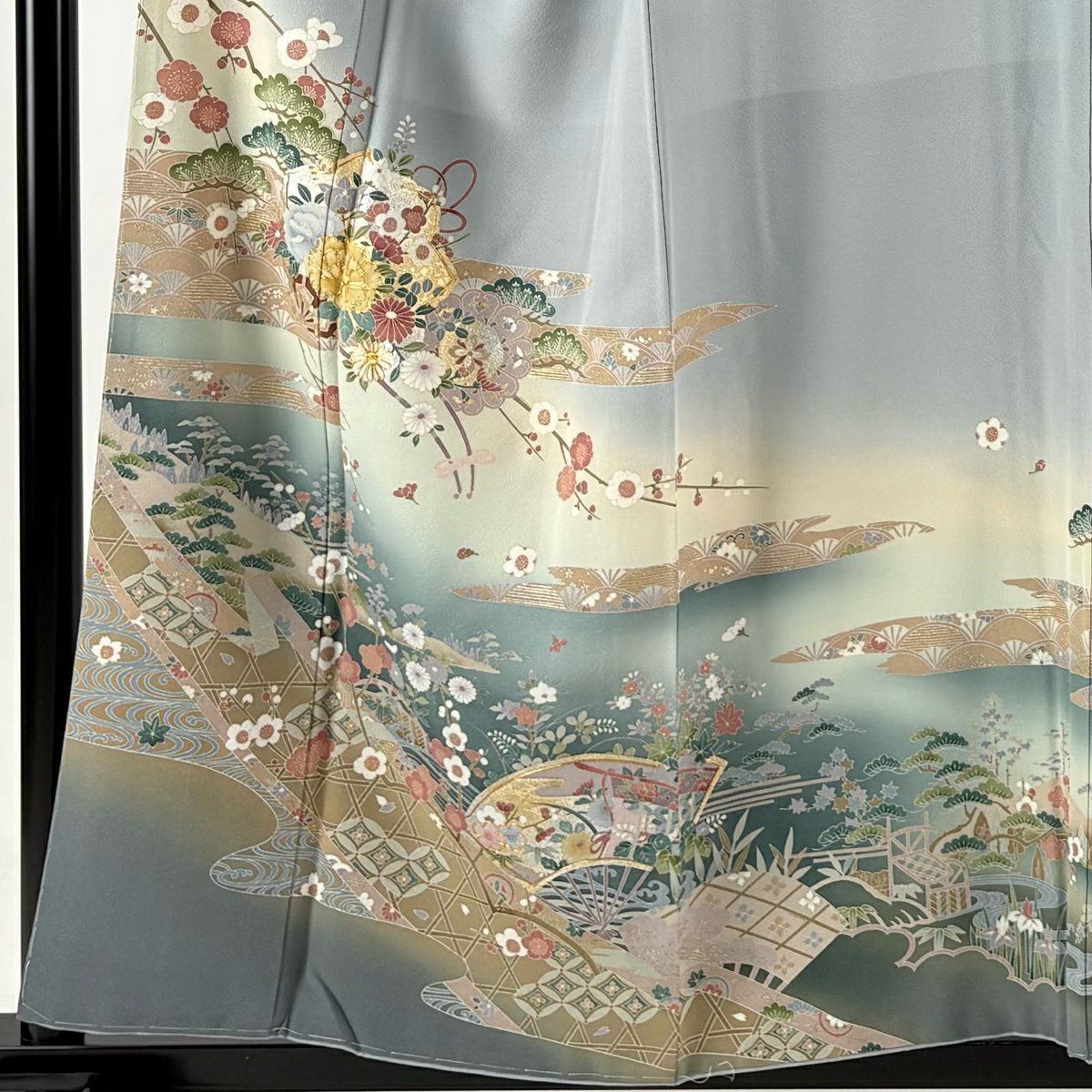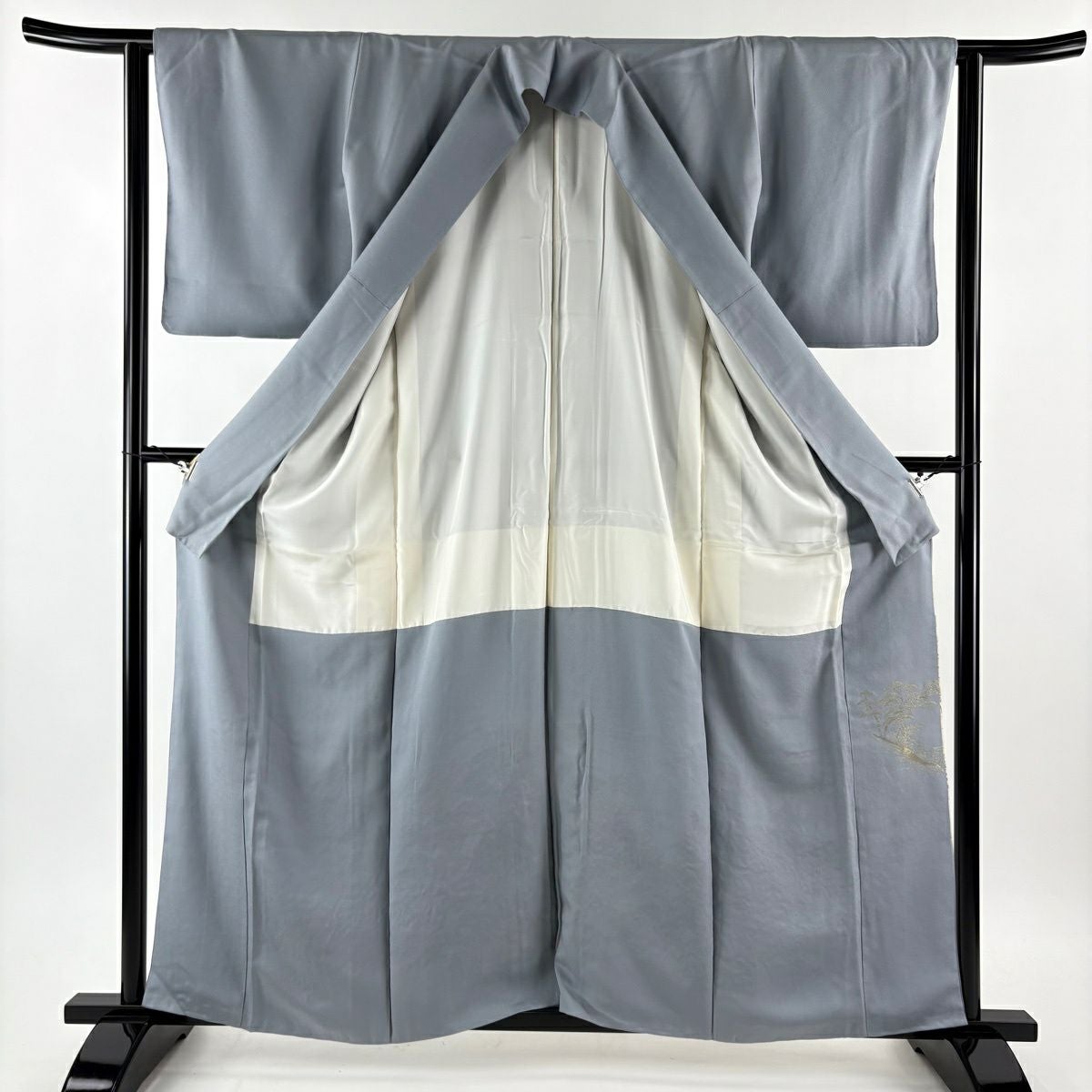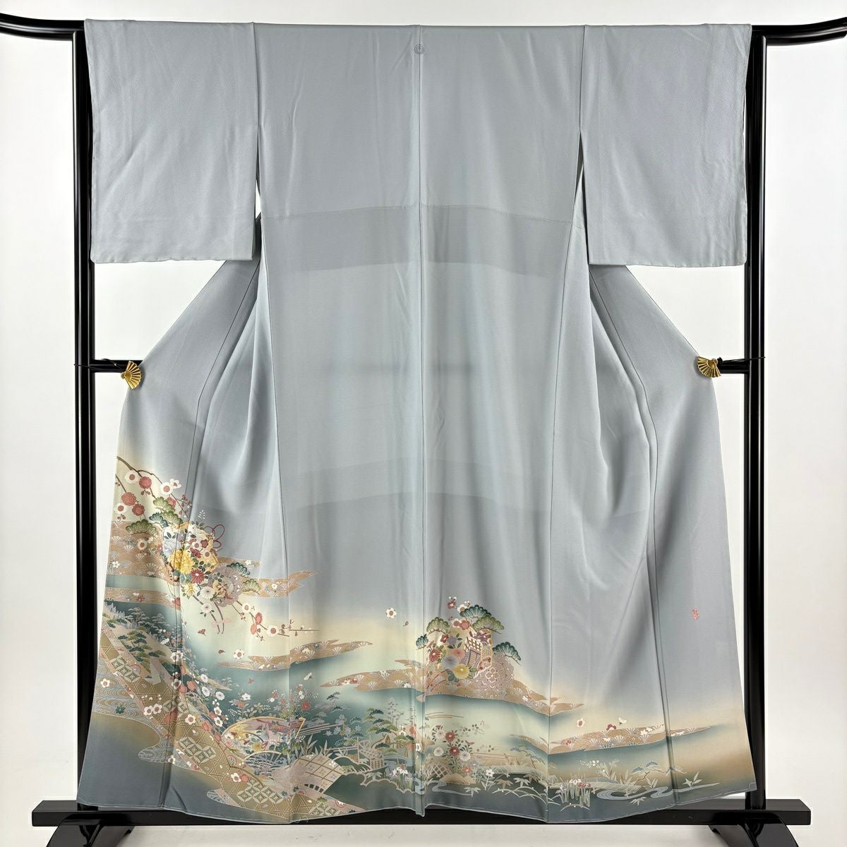 色留袖 身丈157cm 裄丈63.5cm S 袷 落款あり 松竹梅 花車 金糸 金銀彩 青灰色 正絹 秀品 一つ紋