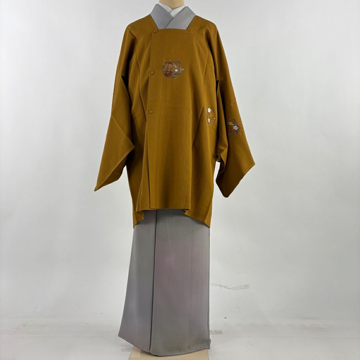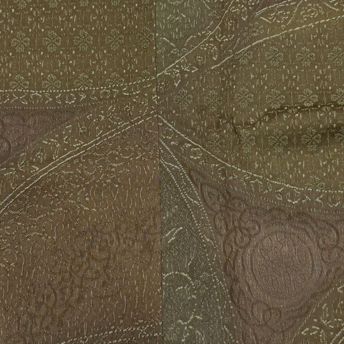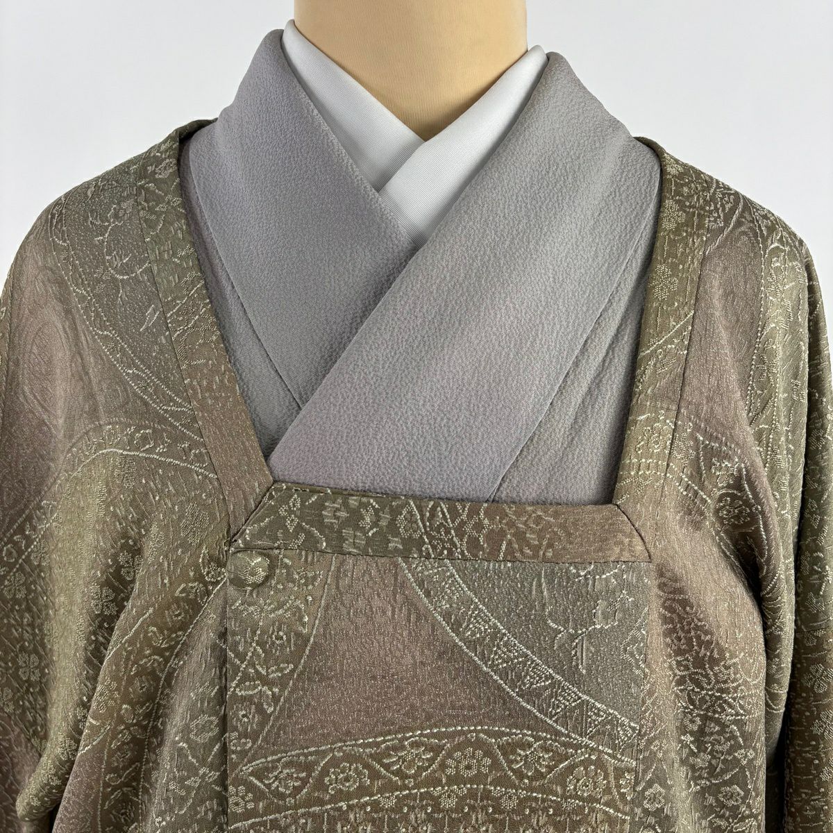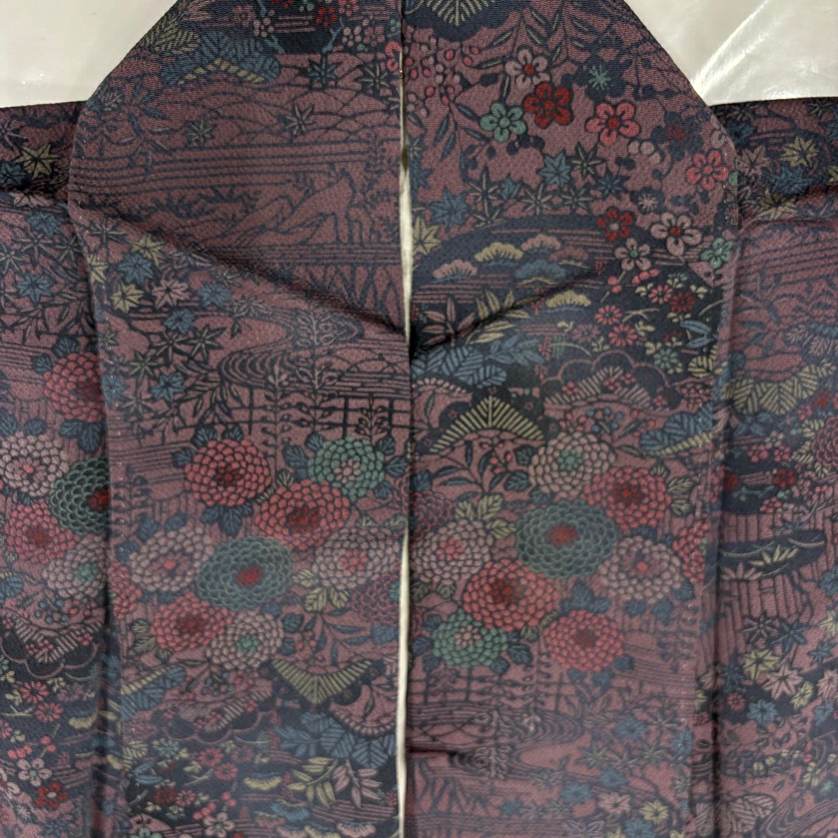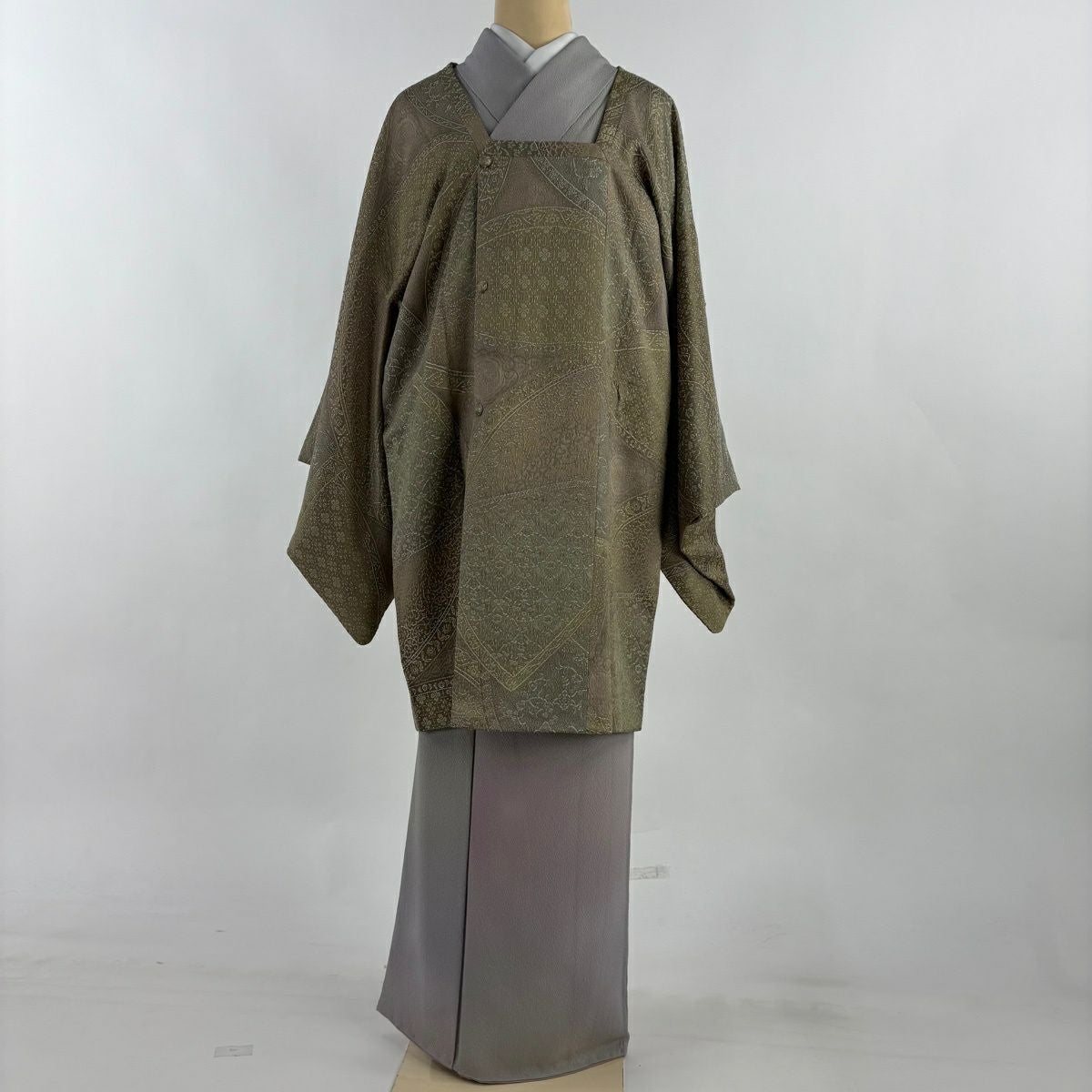 【美品】 道中着 身丈107.5cm 裄丈68cm L 和装コート 着物衿 寄せ柄 草花 縮緬 茶色 正絹 秀品