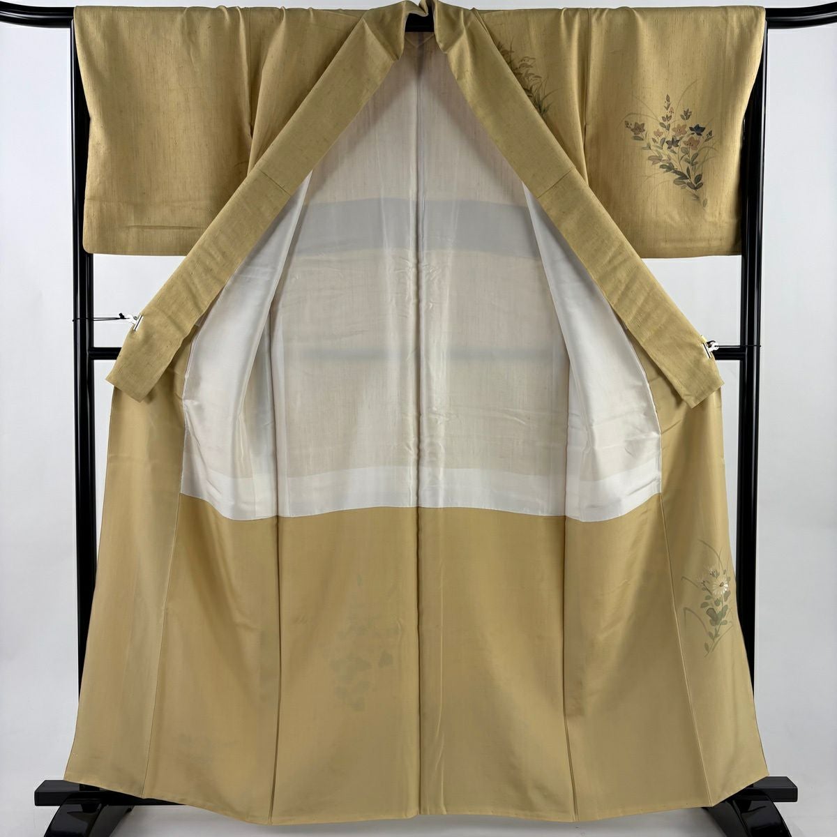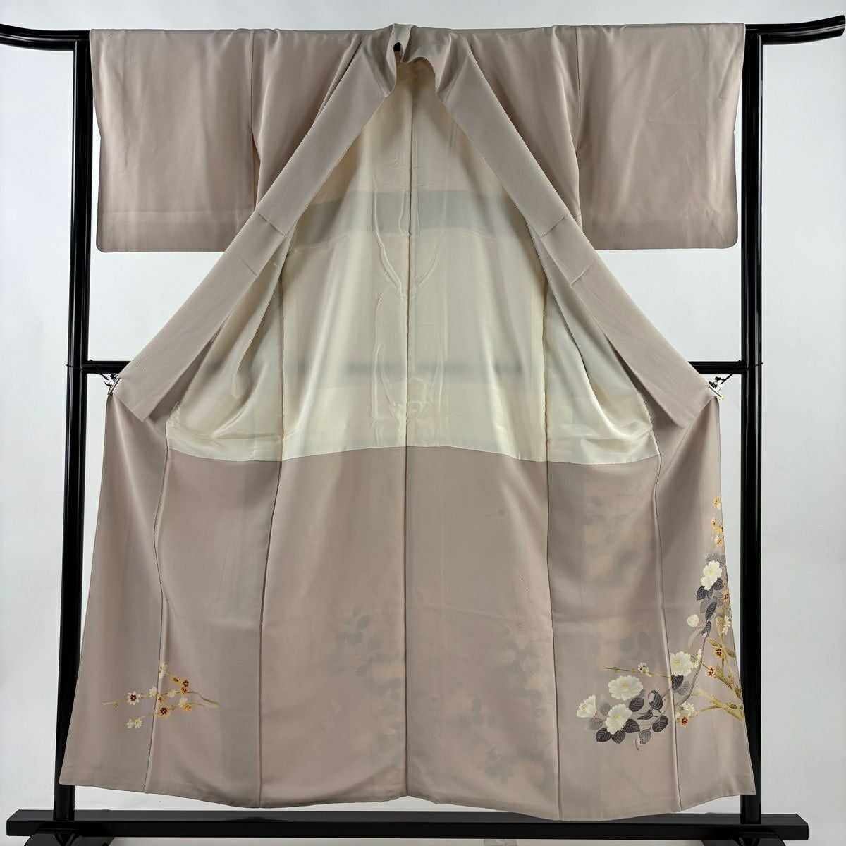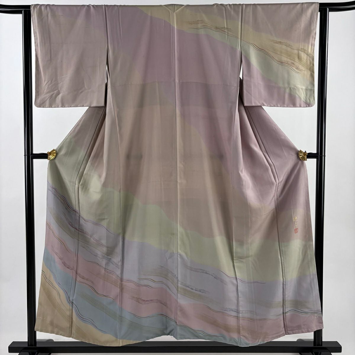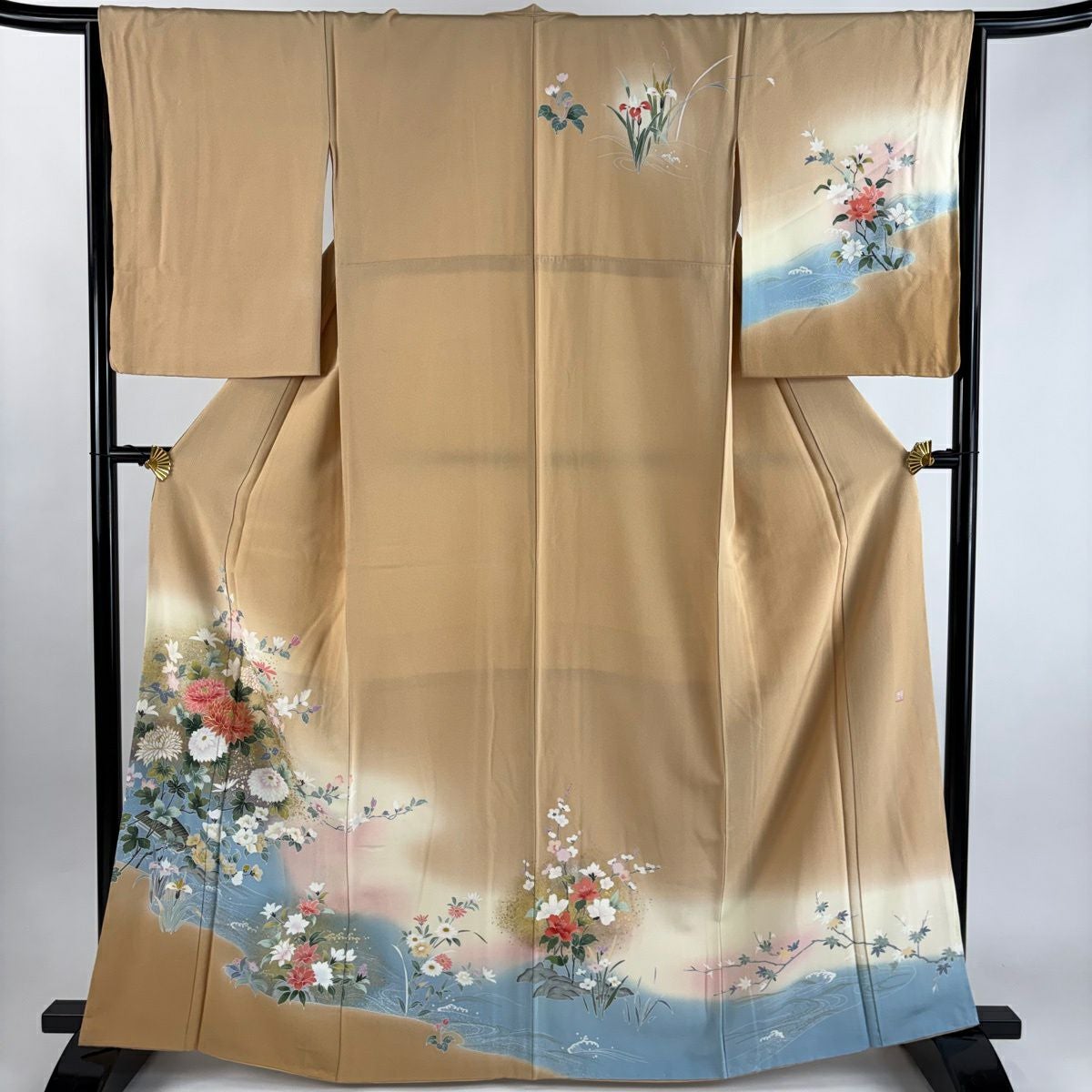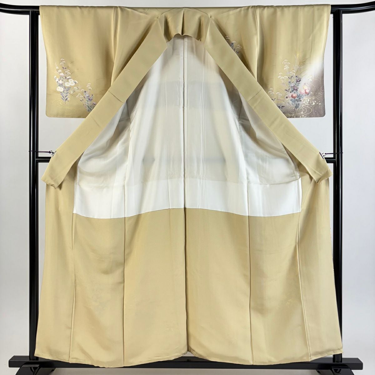 訪問着 身丈164.5cm 裄丈64cm M 袷 落款あり 草花 流水 金銀彩 ぼかし ベージュ 正絹 秀品
