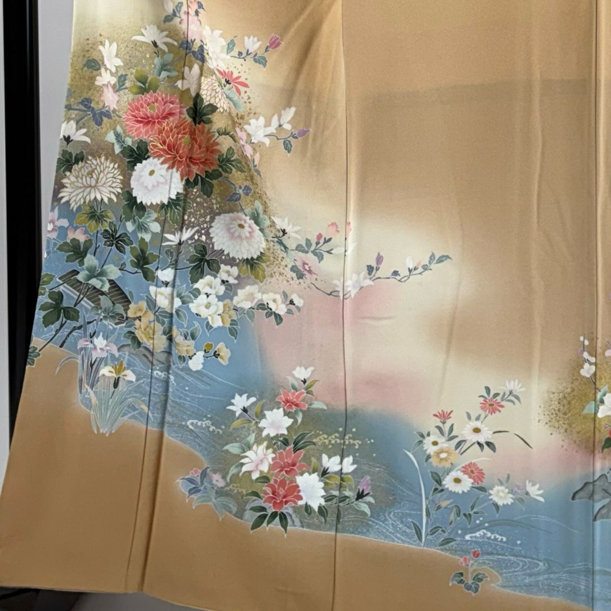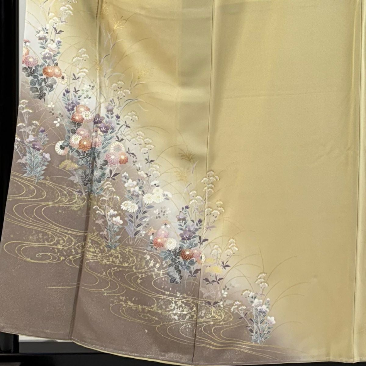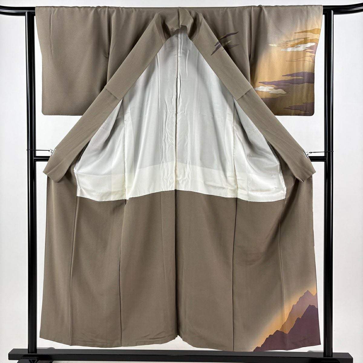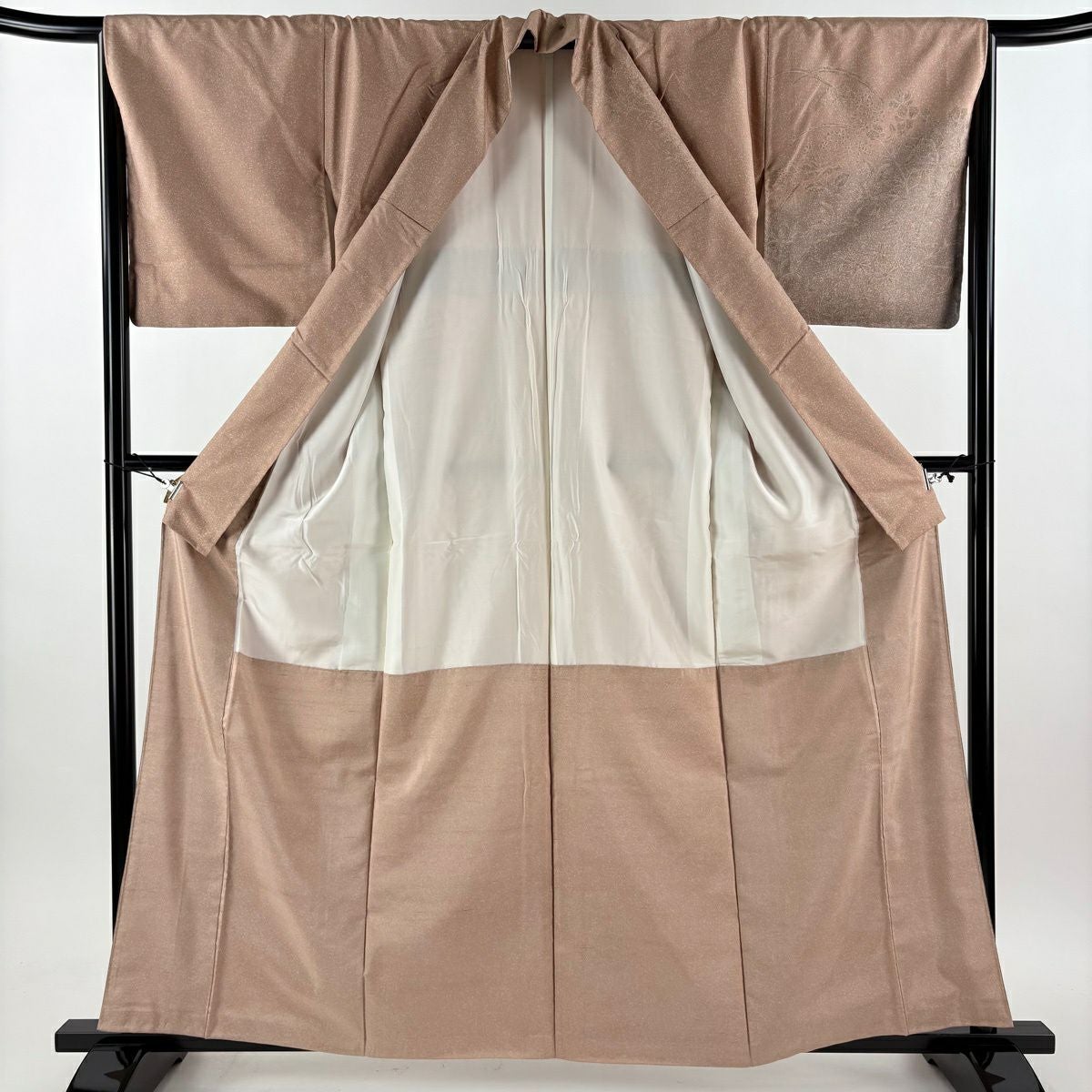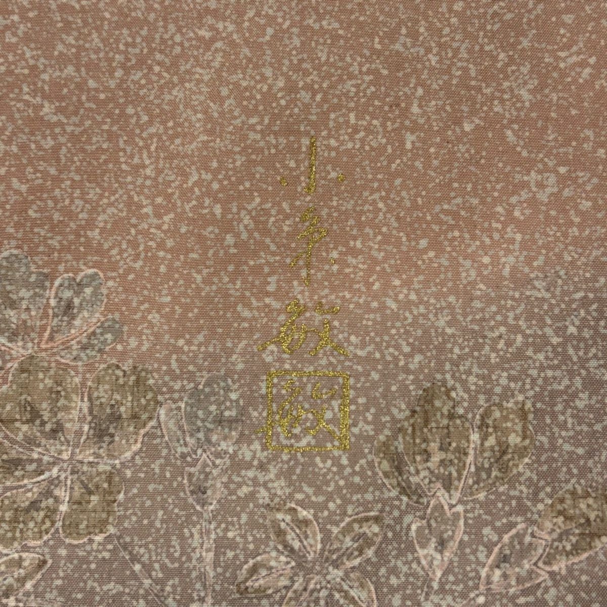 訪問着 身丈164.5cm 裄丈64cm M 袷 落款あり 草花 流水 金銀彩 ぼかし ベージュ 正絹 秀品