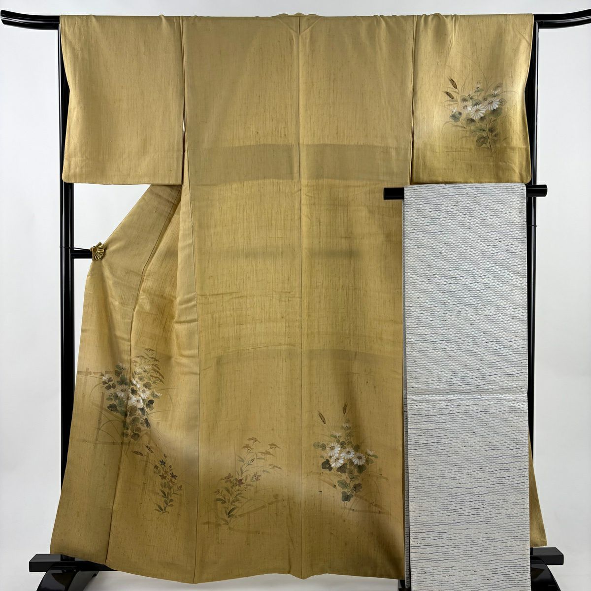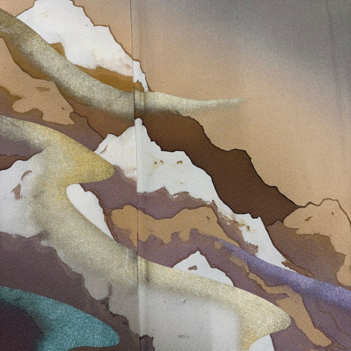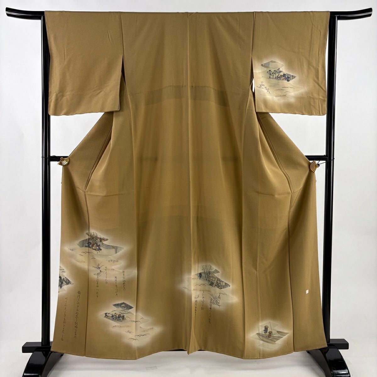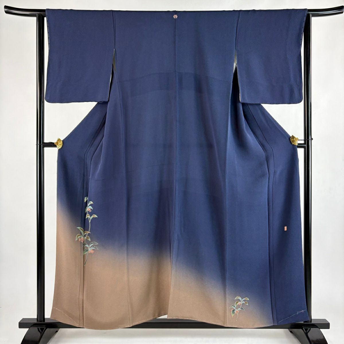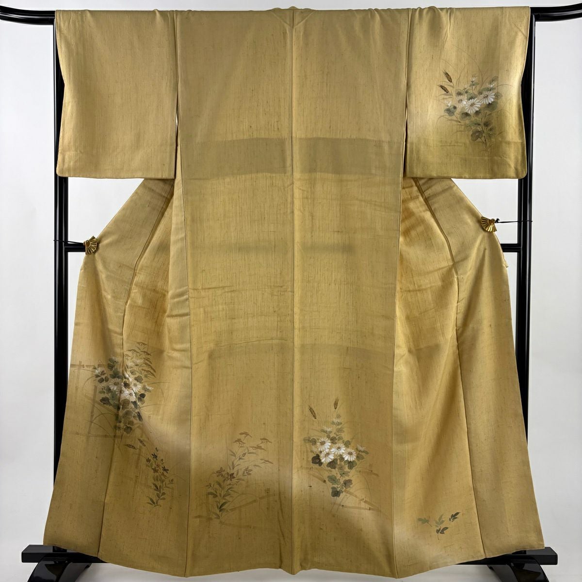訪問着 身丈164.5cm 裄丈64cm M 袷 落款あり 草花 流水 金銀彩 ぼかし ベージュ 正絹 秀品