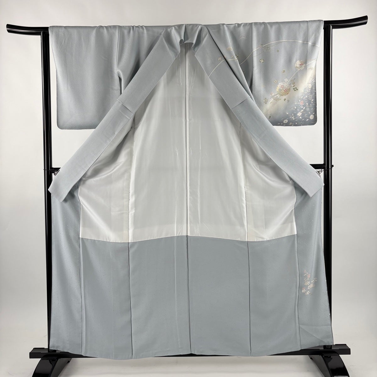 【美品】 訪問着 身丈166cm 裄丈66.5cm M 袷 扇面 枝花 金彩 ぼかし 灰色 正絹 秀品