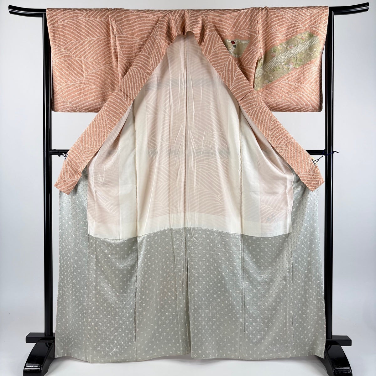 【美品】 訪問着 身丈165cm 裄丈65cm M 袷 枝花 波 刺繍 絞り サーモンピンク 正絹 秀品