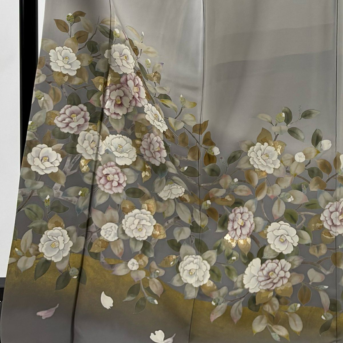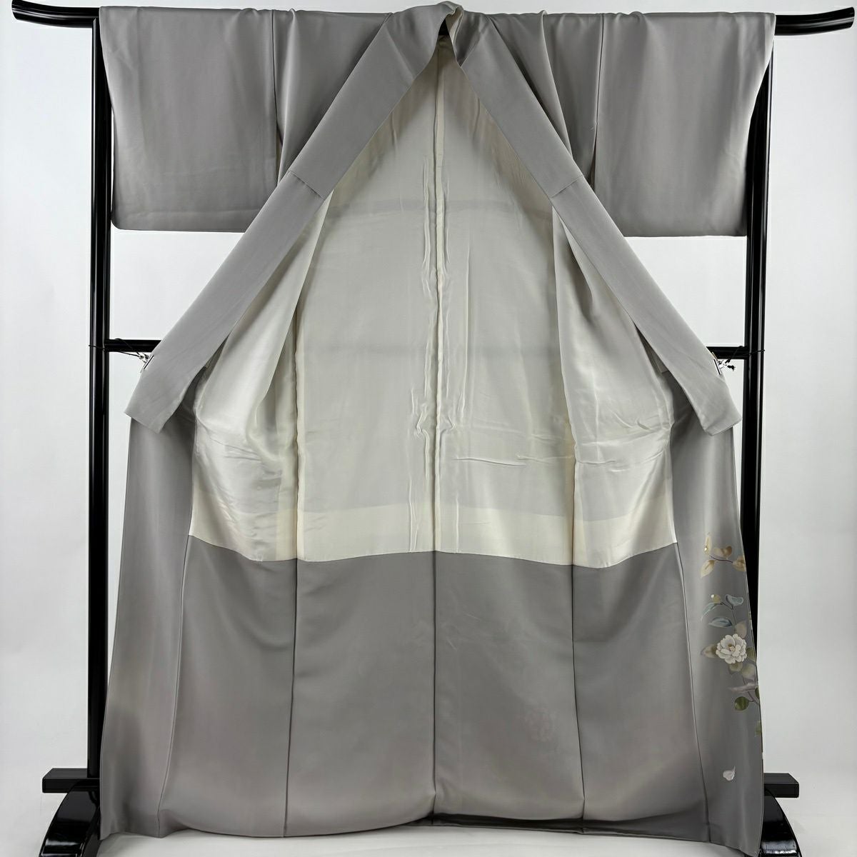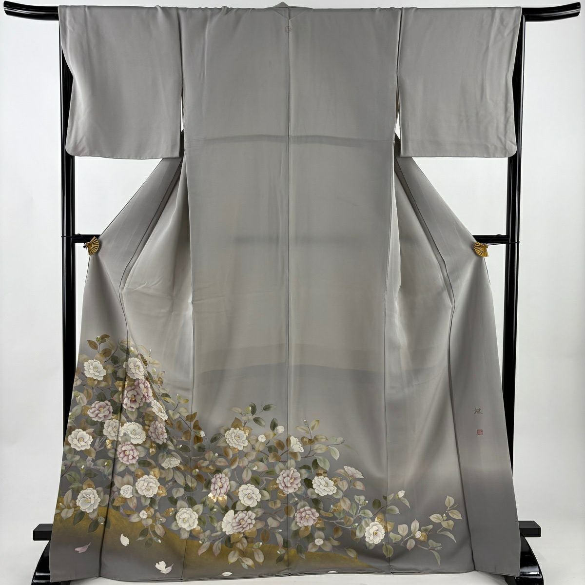 色留袖 身丈172.5cm 裄丈66.5cm M 袷 落款あり 椿 花びら 金銀彩 ぼかし 灰色 正絹 秀品 一つ紋