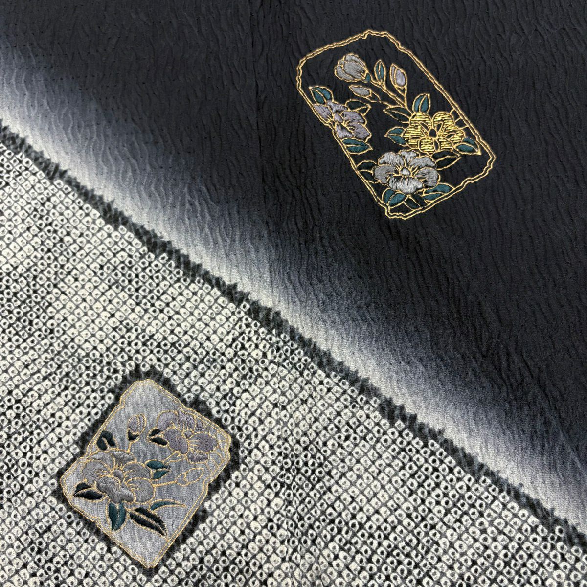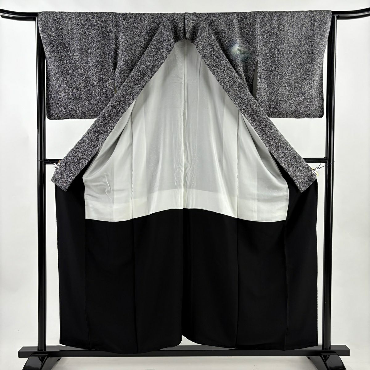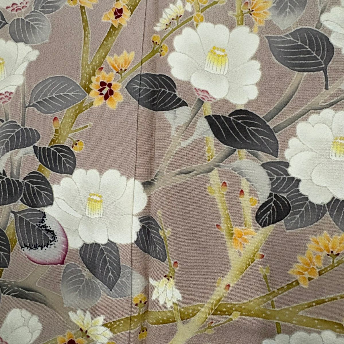色留袖 身丈172.5cm 裄丈66.5cm M 袷 落款あり 椿 花びら 金銀彩 ぼかし 灰色 正絹 秀品 一つ紋