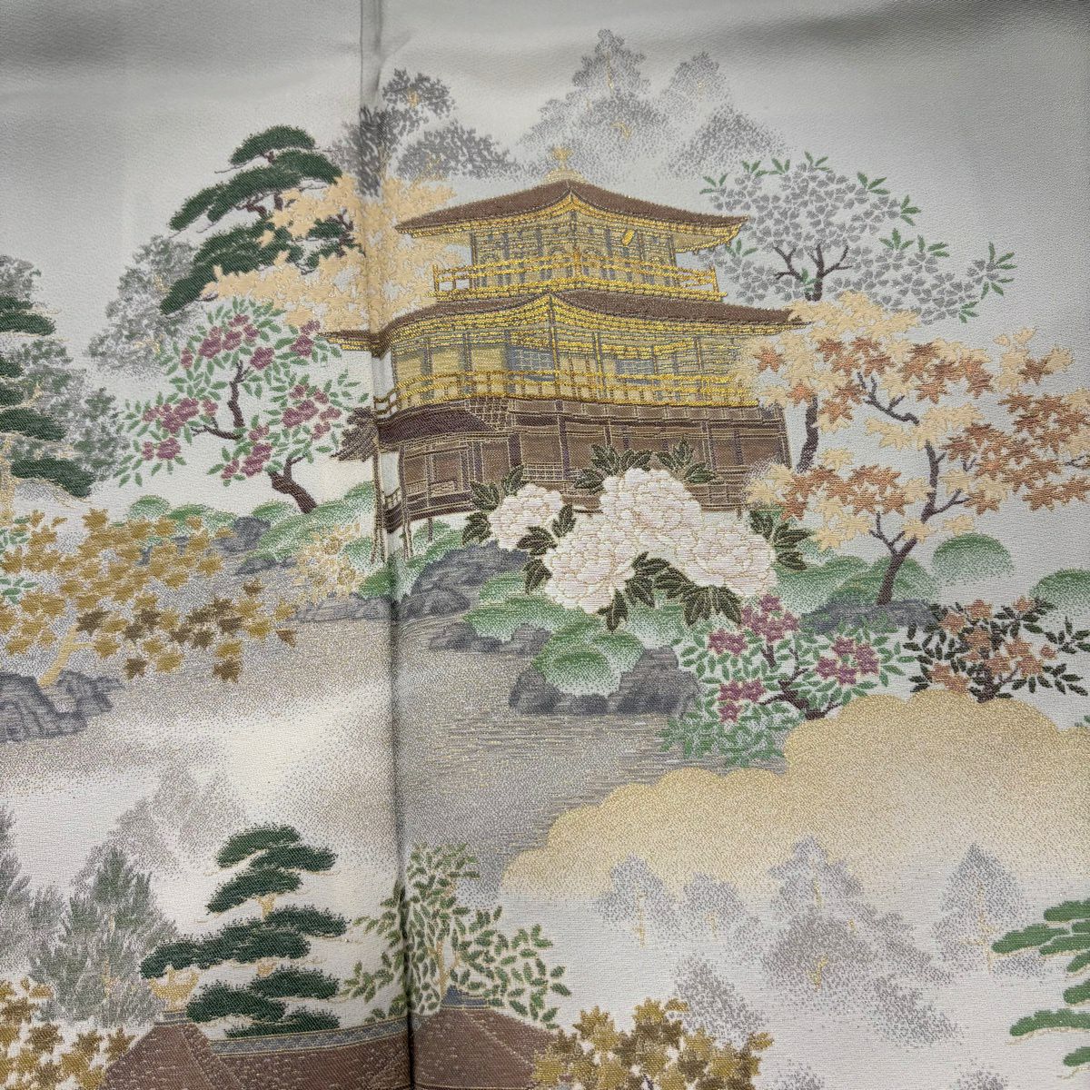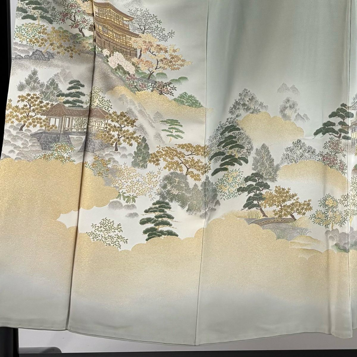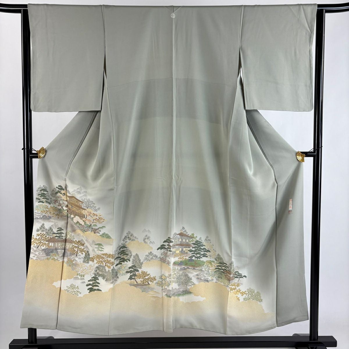 色留袖 身丈152cm 裄丈64cm M 袷 瑞聚苑 落款あり 建物 草花 箔 金銀糸 灰緑 正絹 秀品 一つ紋