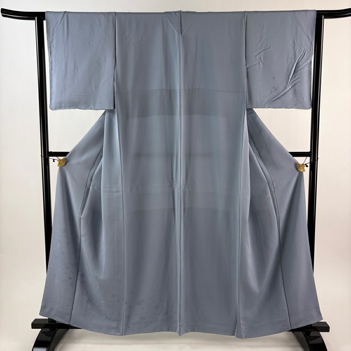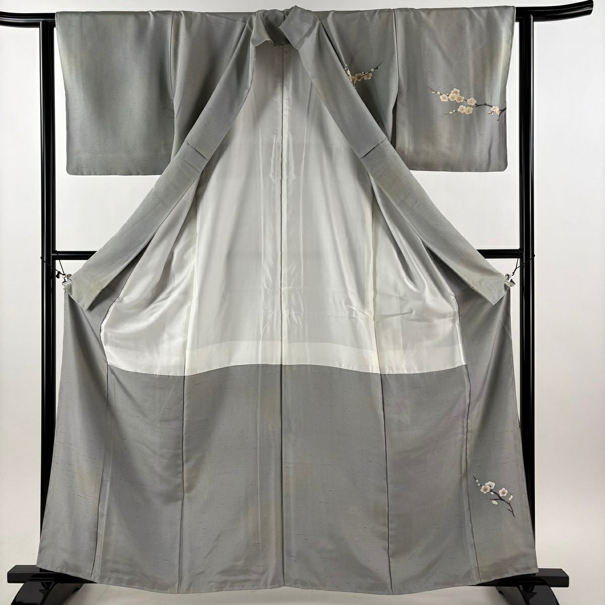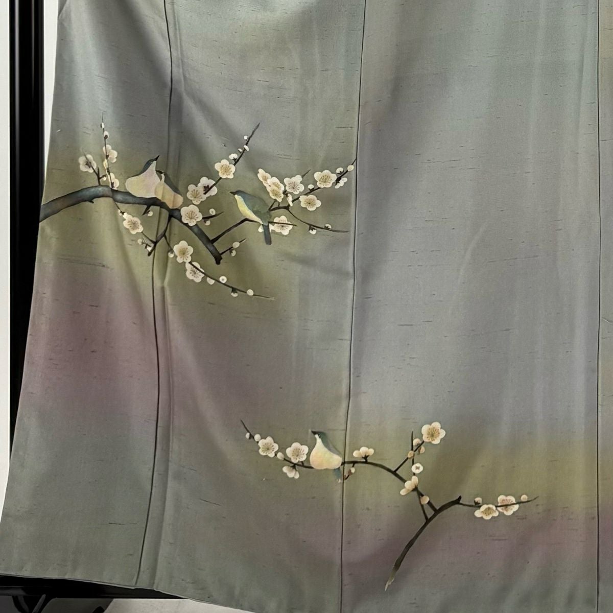 【美品】 付下げ 身丈160.5cm 裄丈62.5cm S 袷 紬地 落款あり 枝梅 鳥 ぼかし 青灰色 正絹 秀品