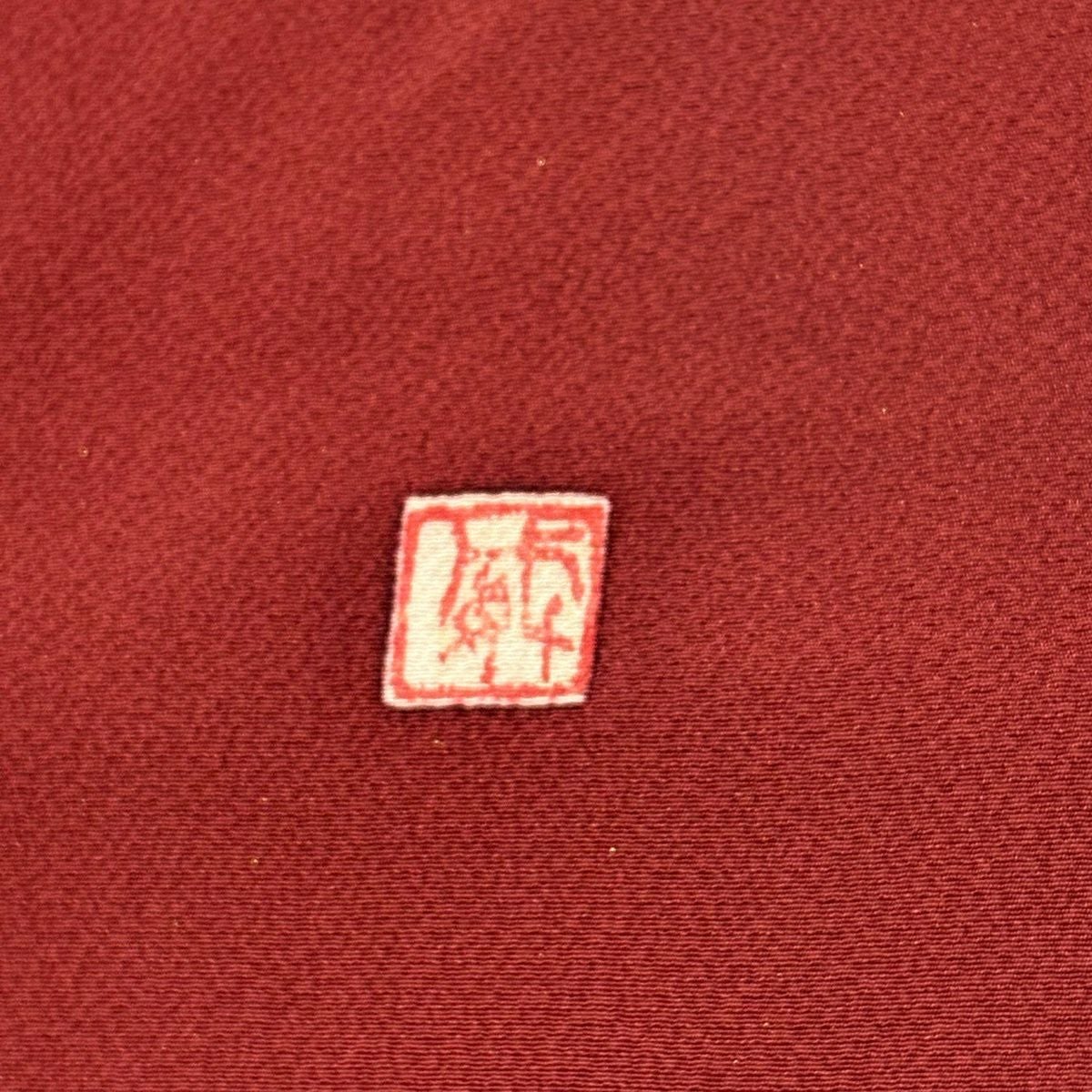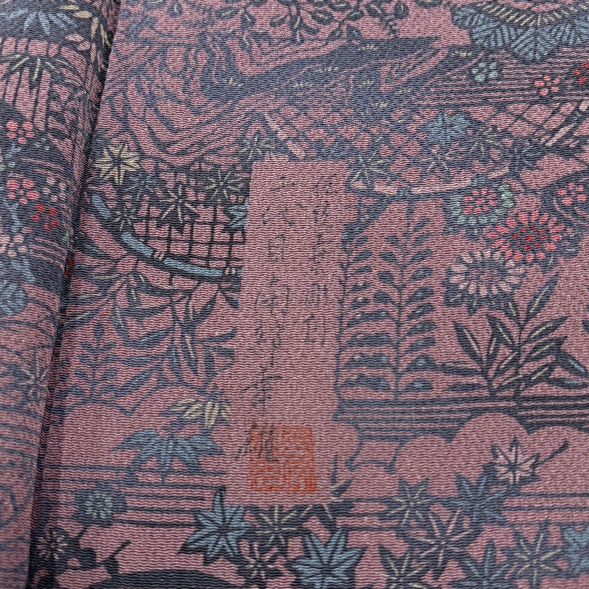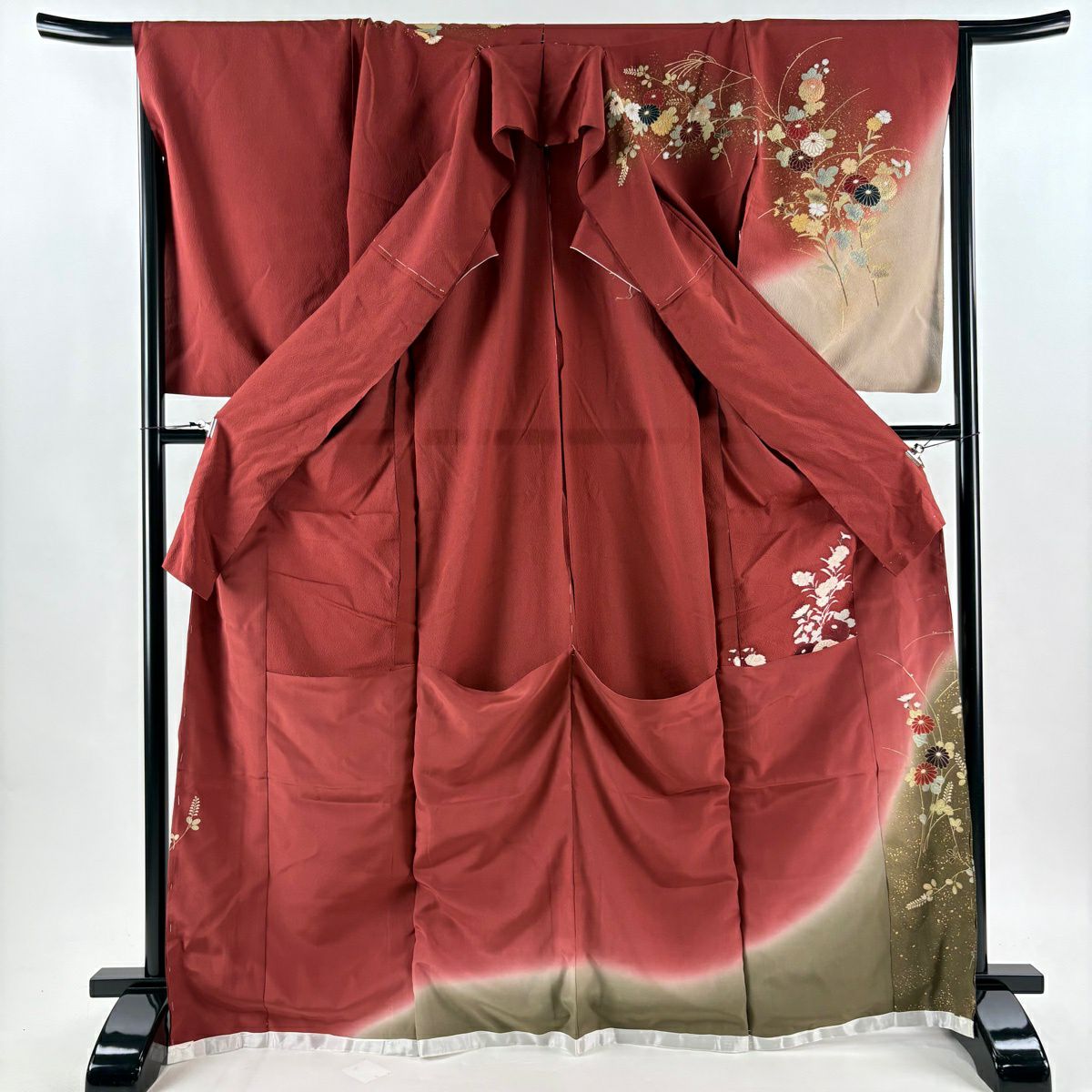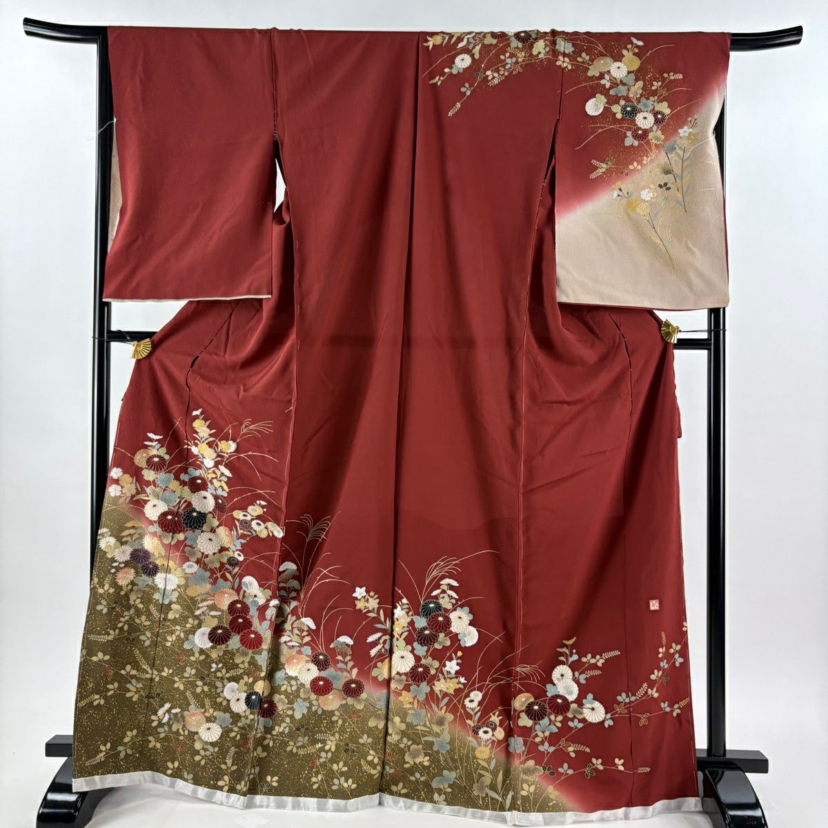 訪問着 身丈171cm 裄丈67.5cm 未仕立て 仮絵羽 落款あり 菊 萩 金彩 ぼかし えんじ色 正絹 秀品