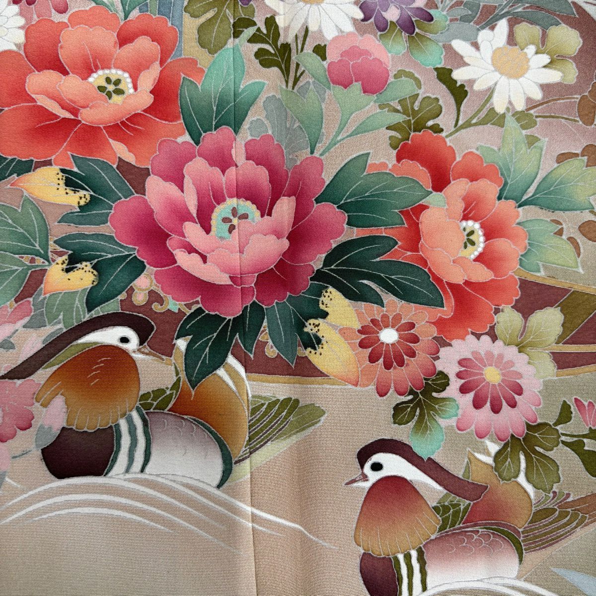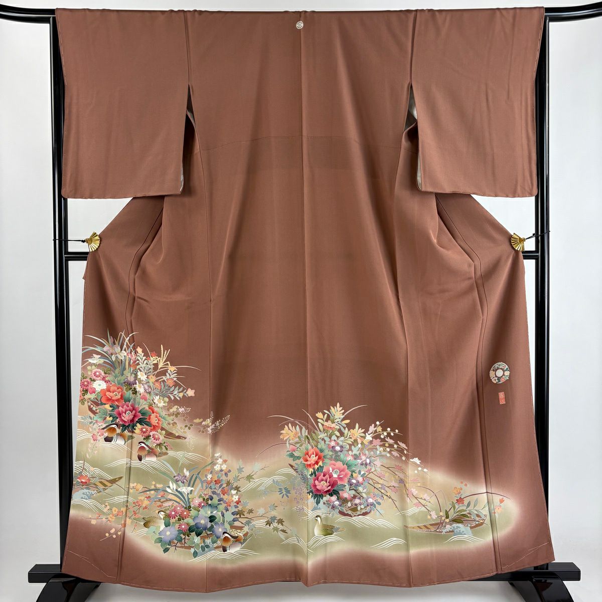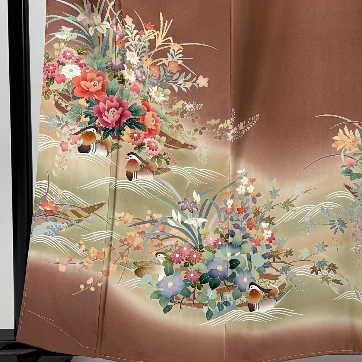 色留袖 身丈161cm 裄丈65cm M 袷 落款あり 花舟 鴛鴦 染め分け ぼかし 薄茶色 正絹 秀品 一つ紋