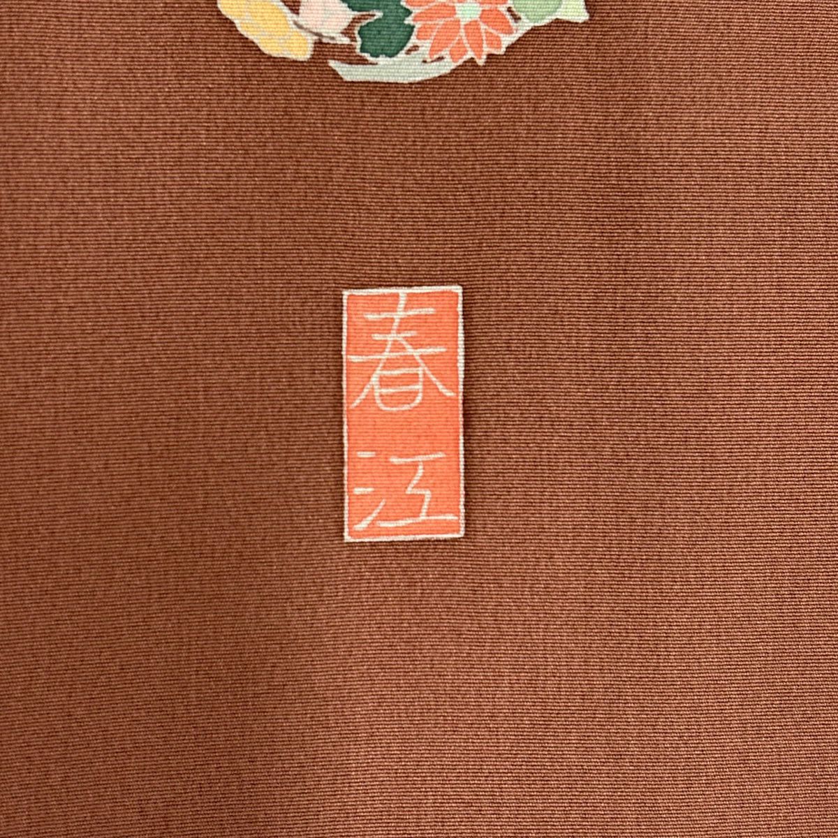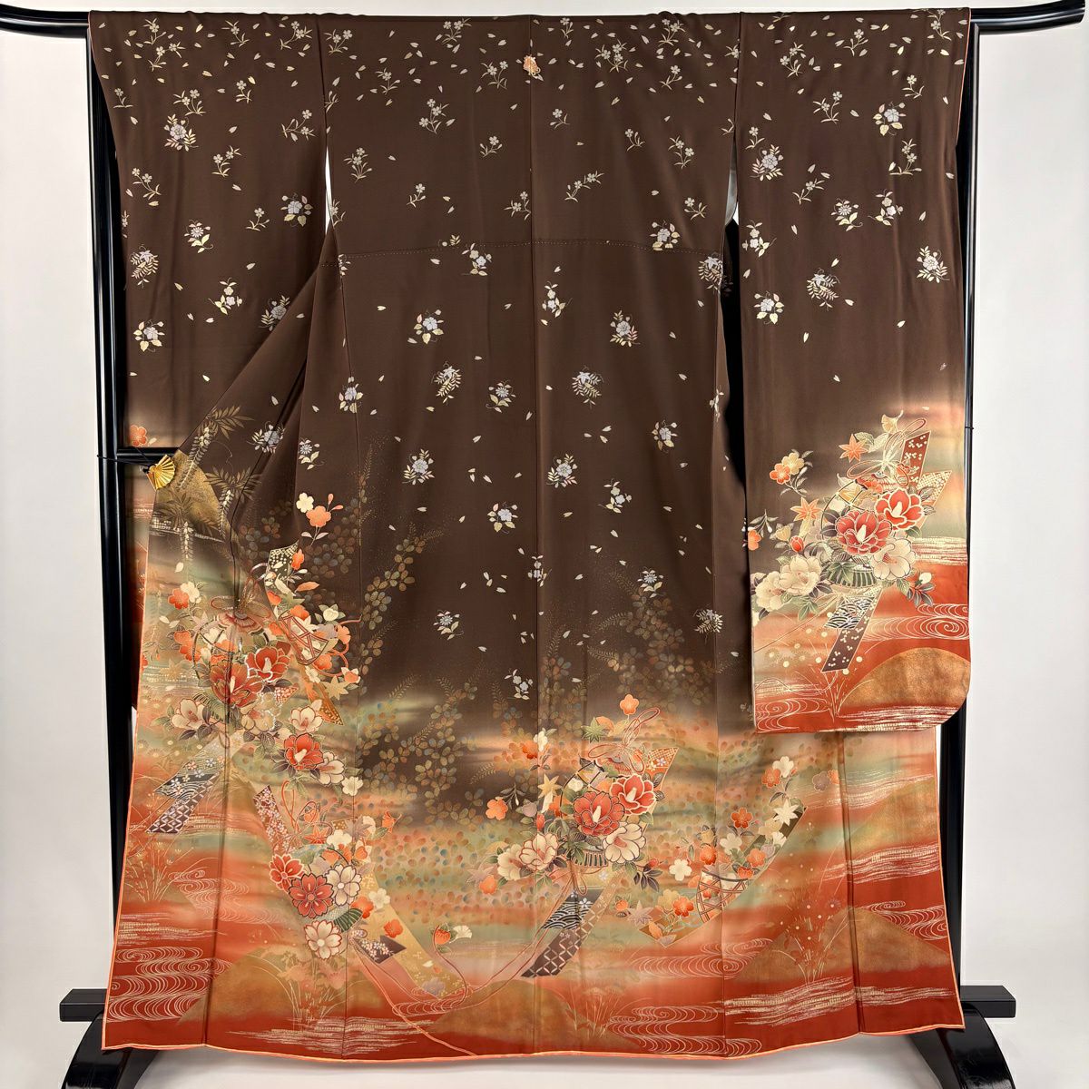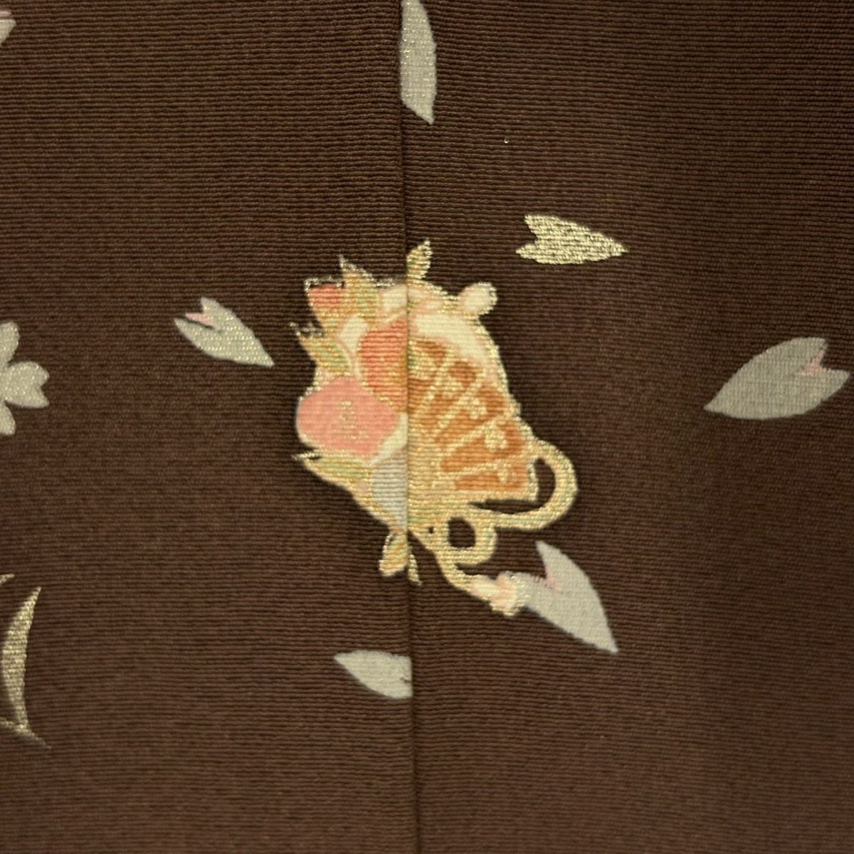 振袖 身丈163.5cm 裄丈66cm M 袷 落款あり 短冊 くす玉 ラメ 金銀彩 焦茶色 正絹 秀品 一つ紋