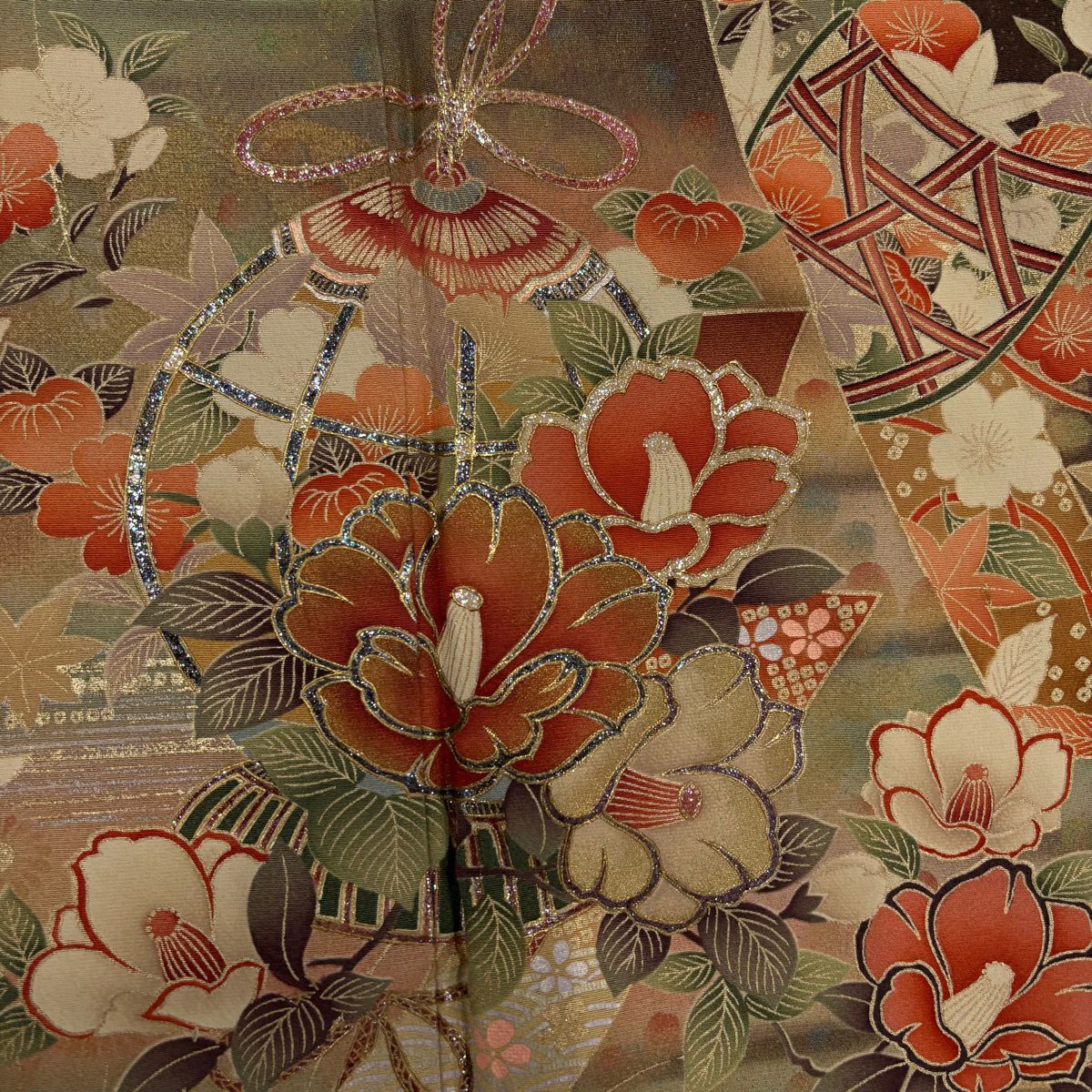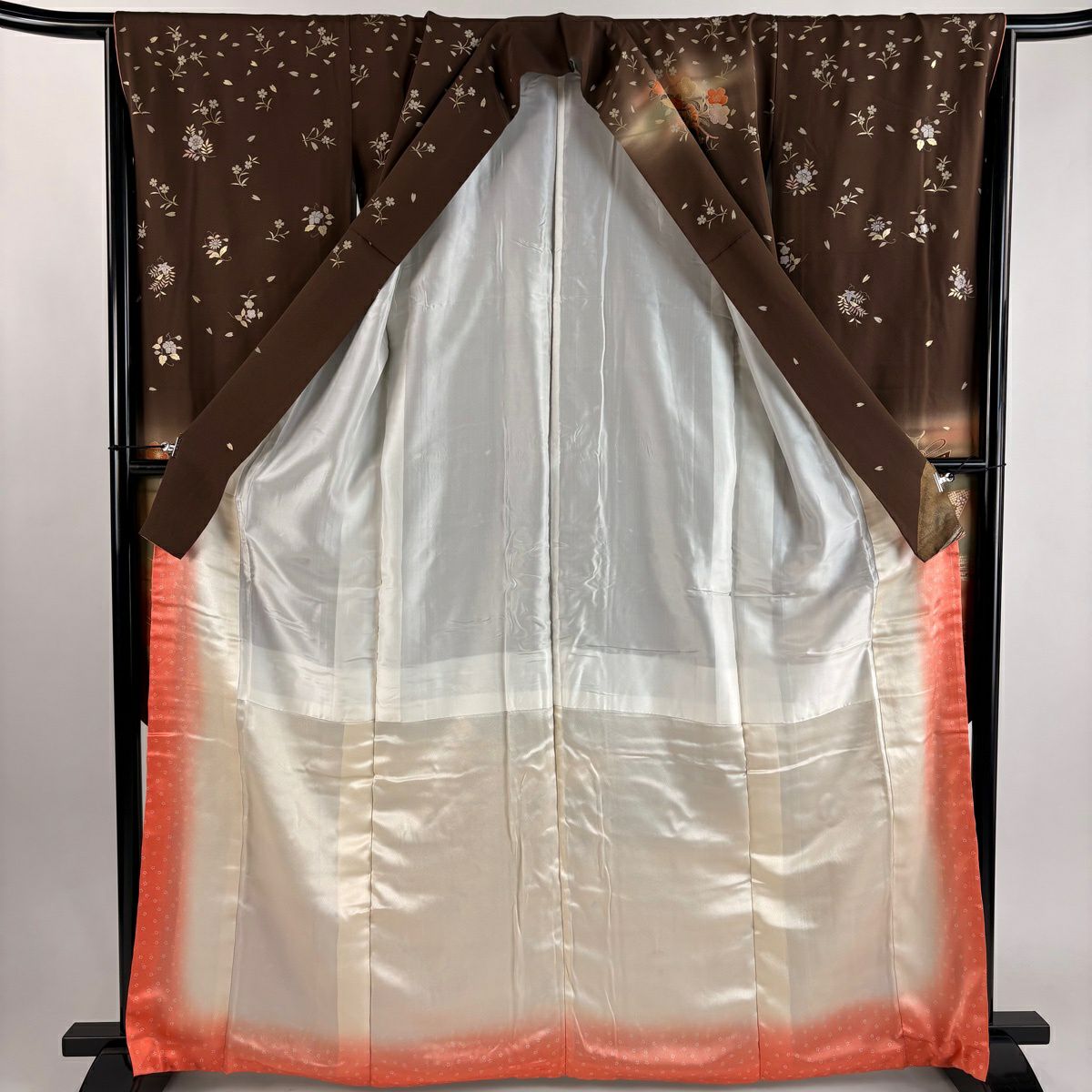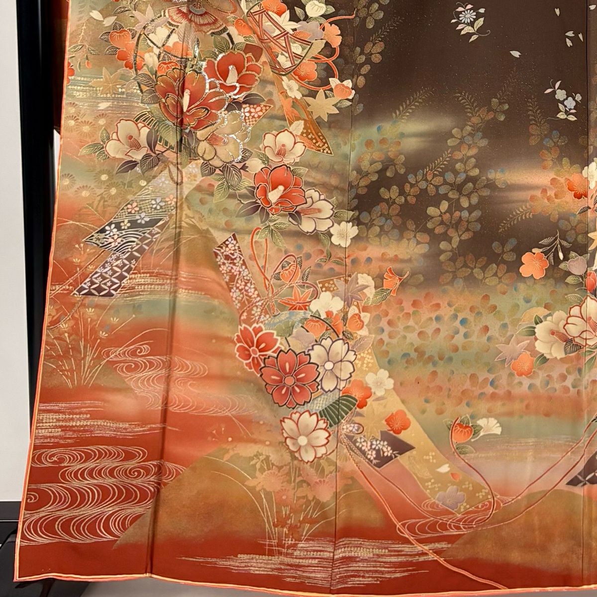 振袖 身丈163.5cm 裄丈66cm M 袷 落款あり 短冊 くす玉 ラメ 金銀彩 焦茶色 正絹 秀品 一つ紋