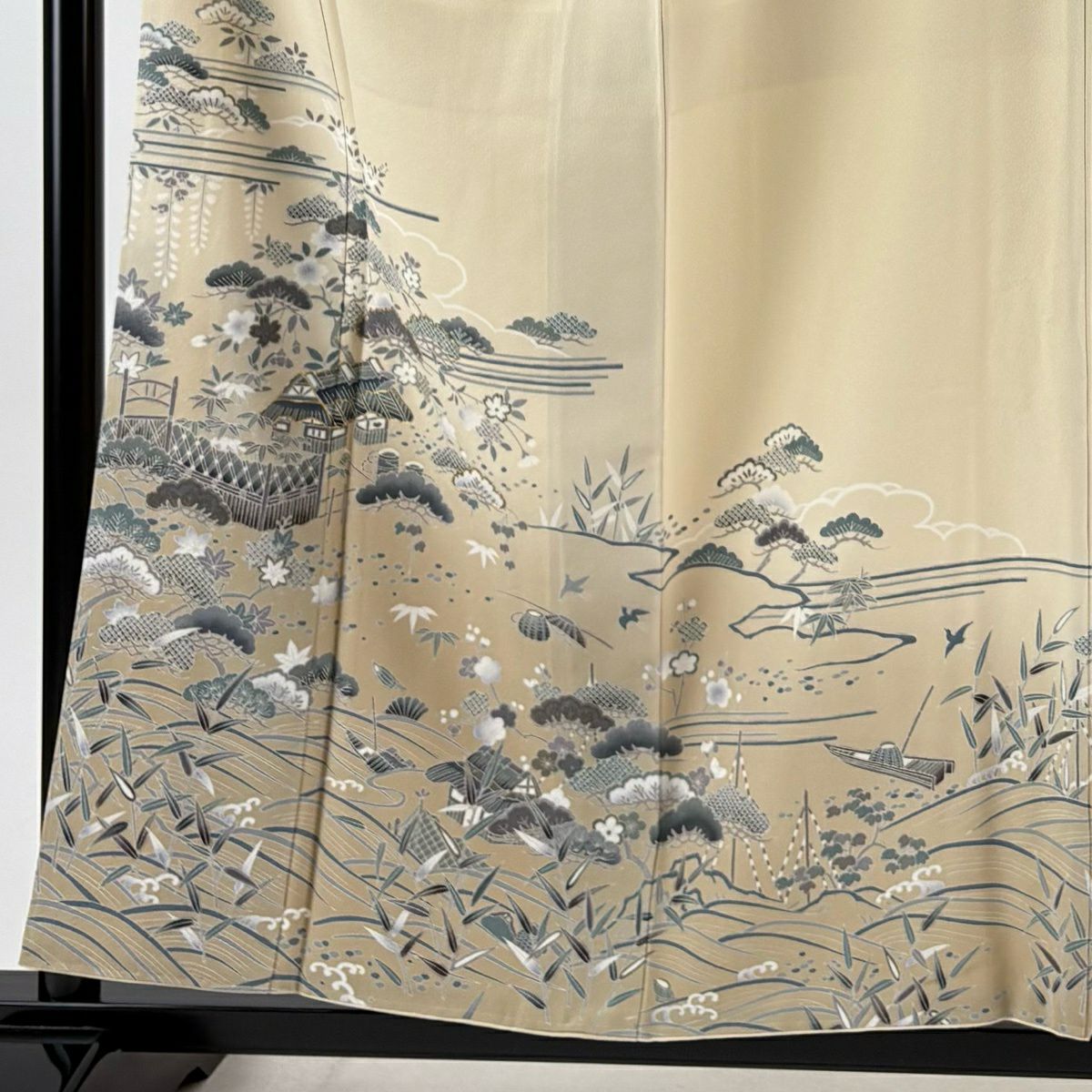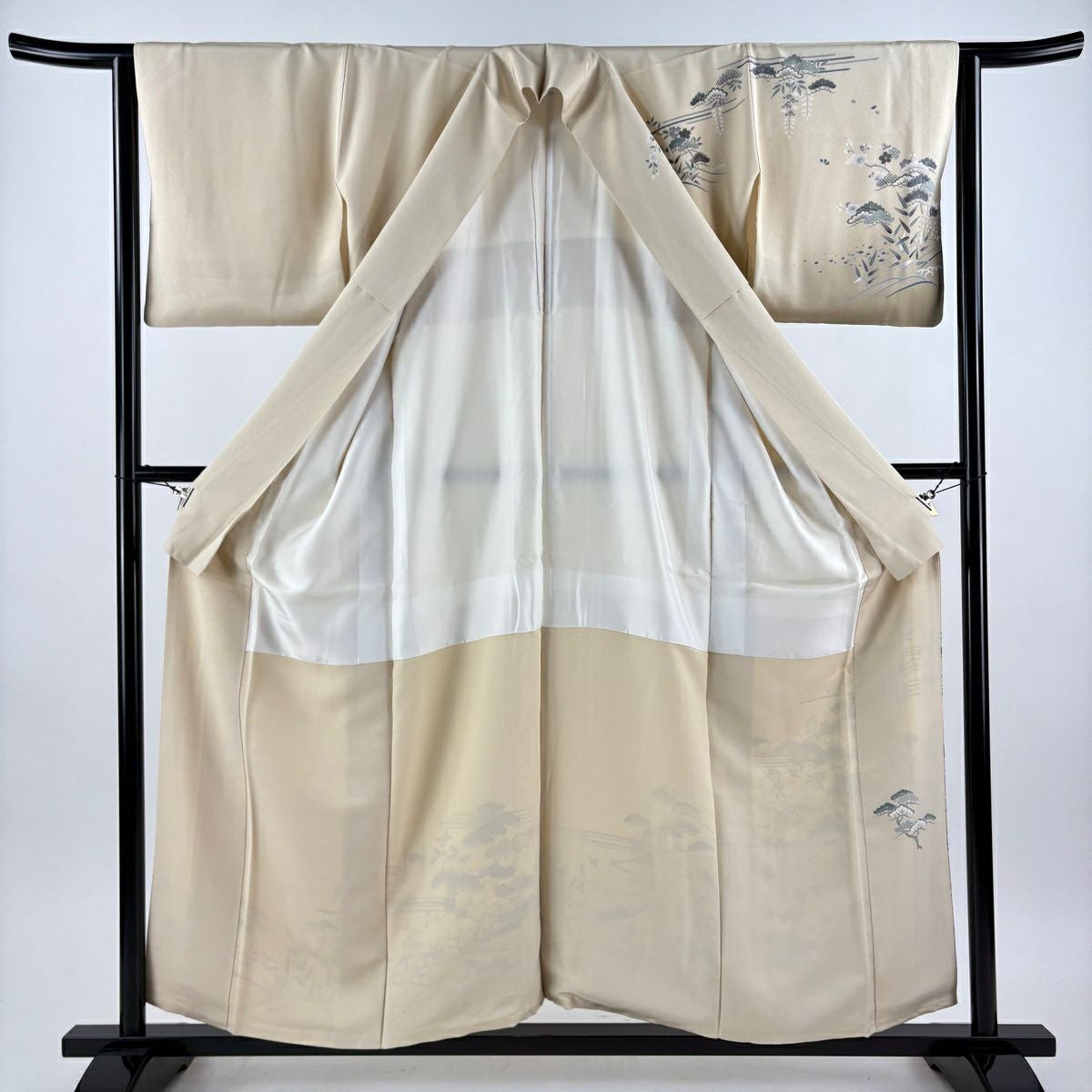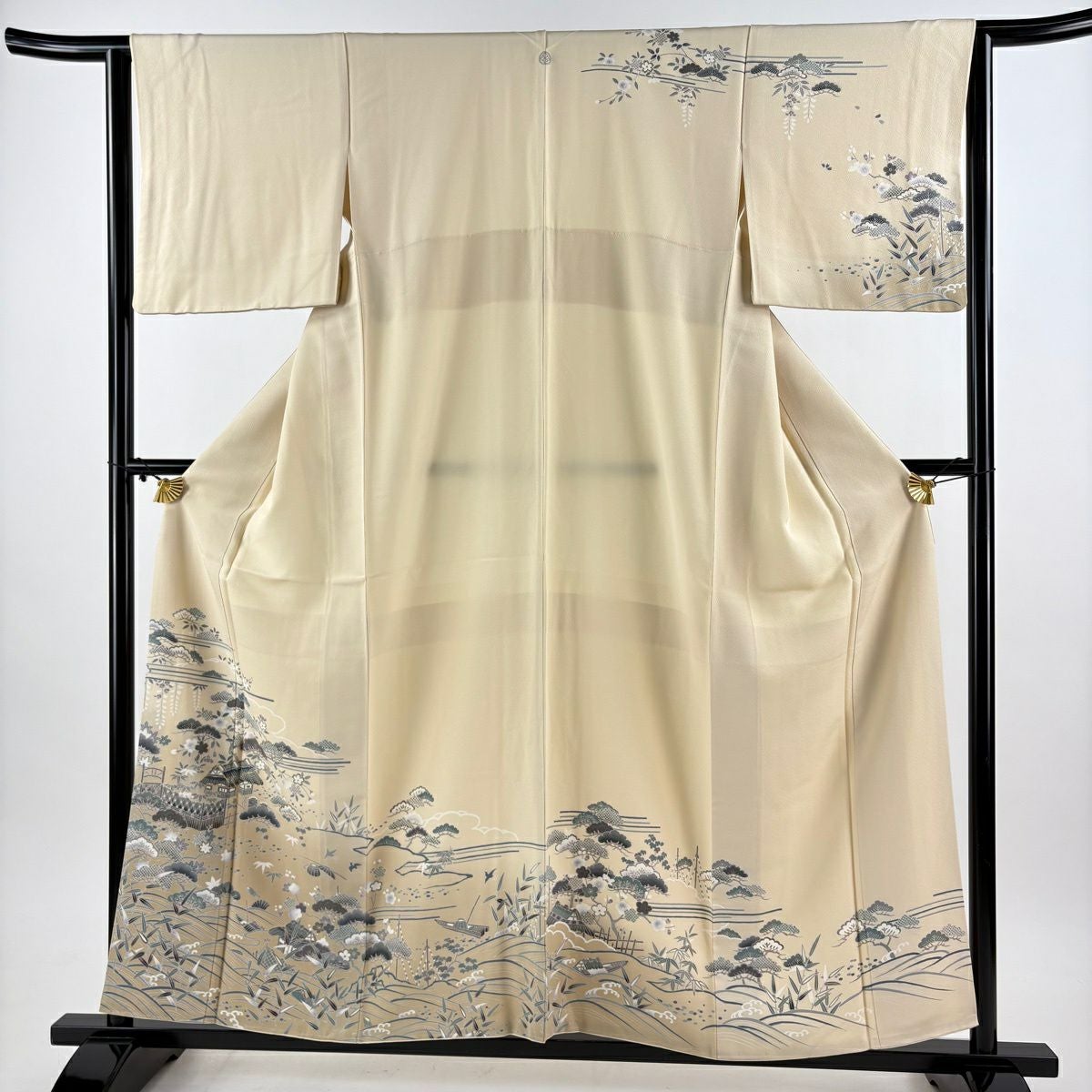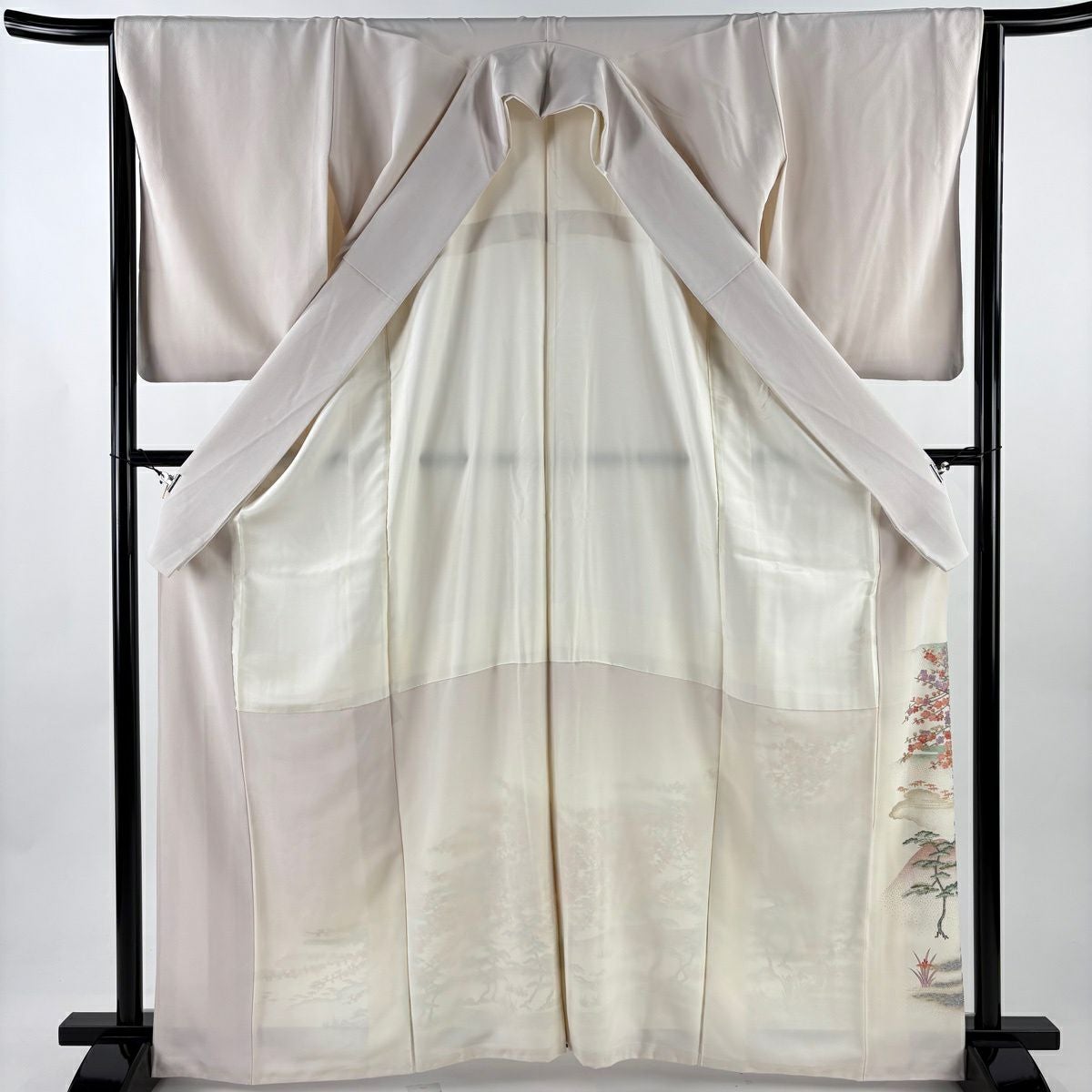 付下げ 身丈154cm 裄丈63.5cm S 袷 家屋 松竹梅 刺繍 裾ぼかし ベージュ 正絹 秀品 一つ紋