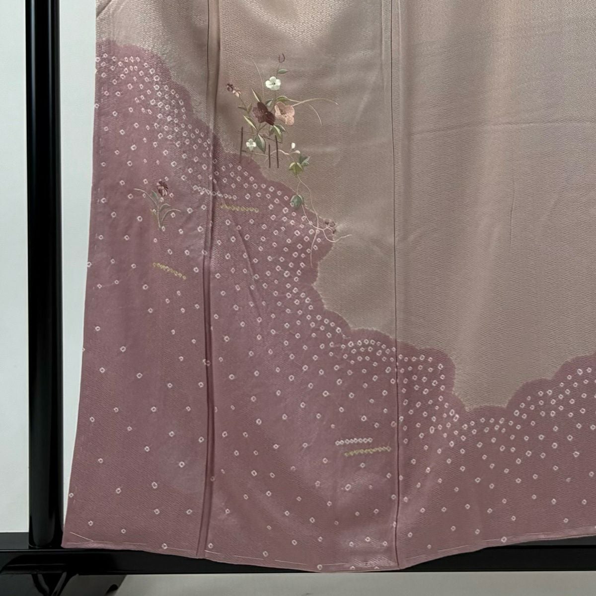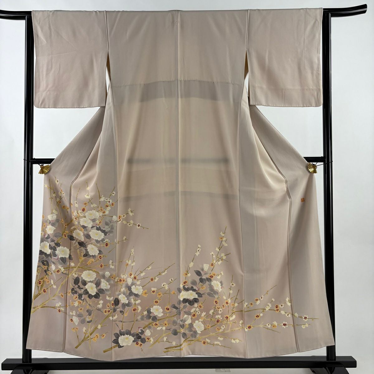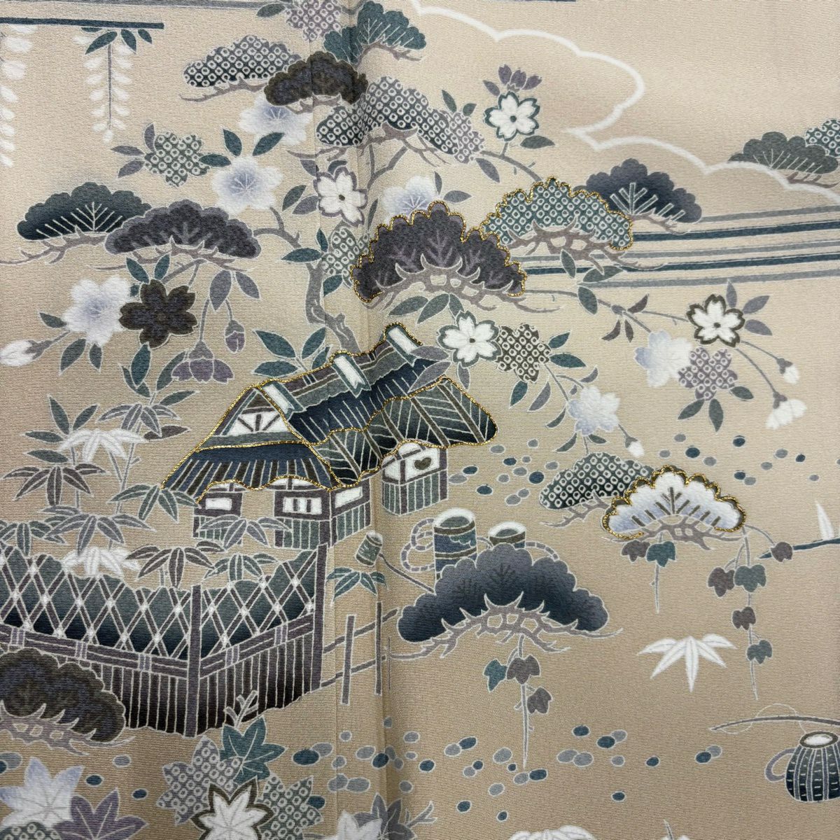 付下げ 身丈154cm 裄丈63.5cm S 袷 家屋 松竹梅 刺繍 裾ぼかし ベージュ 正絹 秀品 一つ紋
