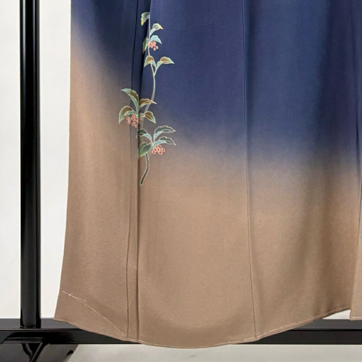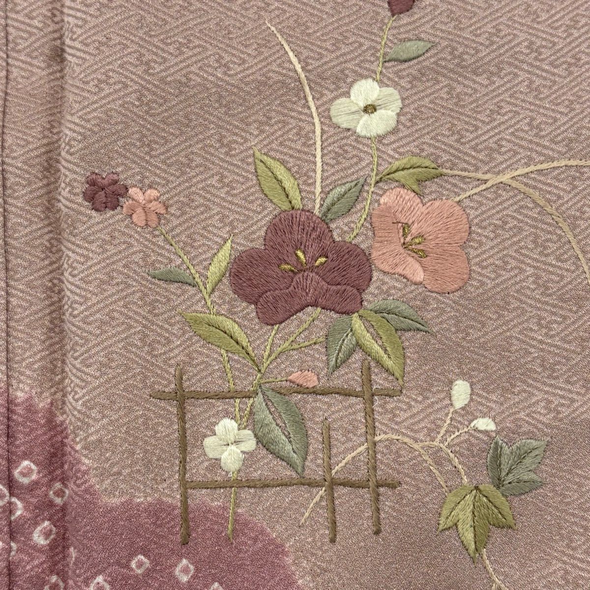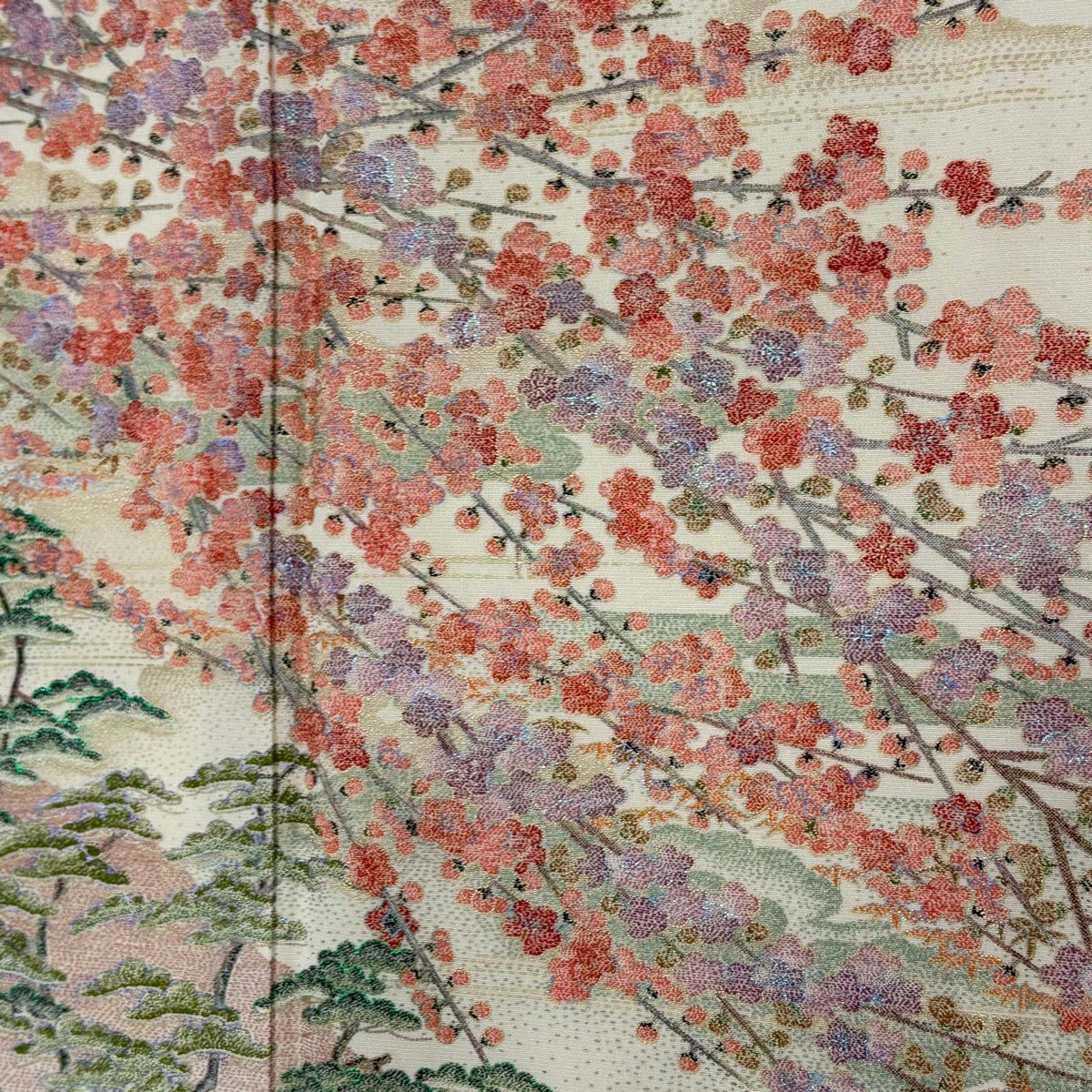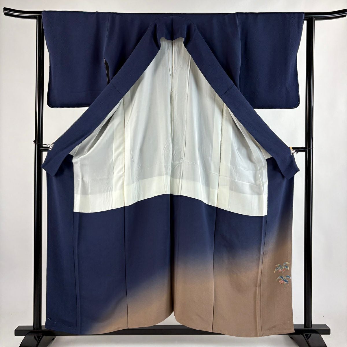 付下げ 身丈154cm 裄丈63.5cm S 袷 家屋 松竹梅 刺繍 裾ぼかし ベージュ 正絹 秀品 一つ紋