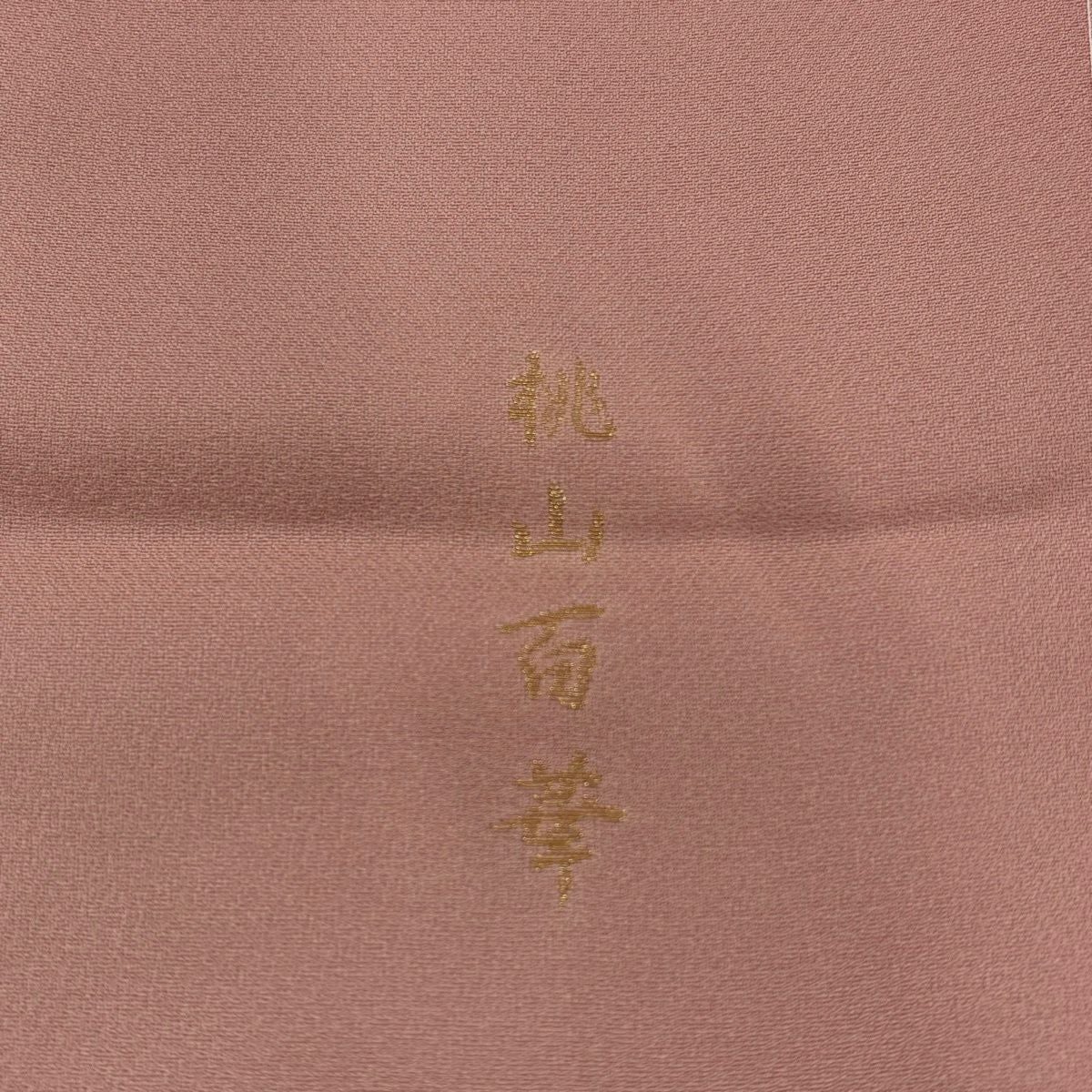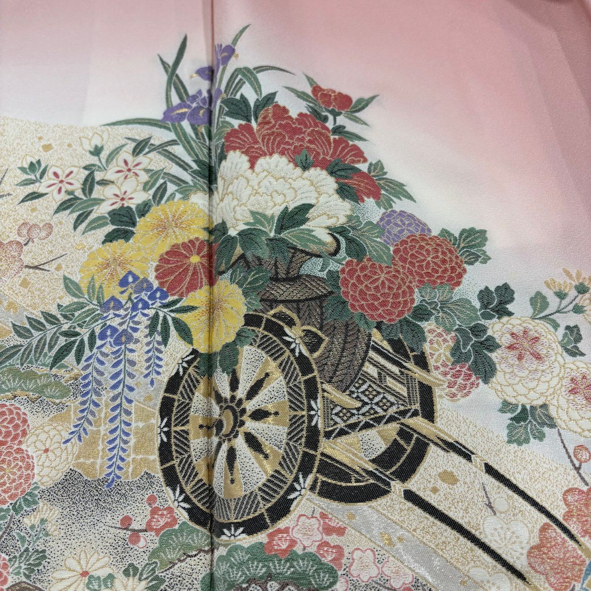 色留袖 身丈164.5cm 裄丈64.5cm M 袷 桃山百華 花車 巻物 金銀糸 ぼかし ピンク 正絹 秀品 一つ紋