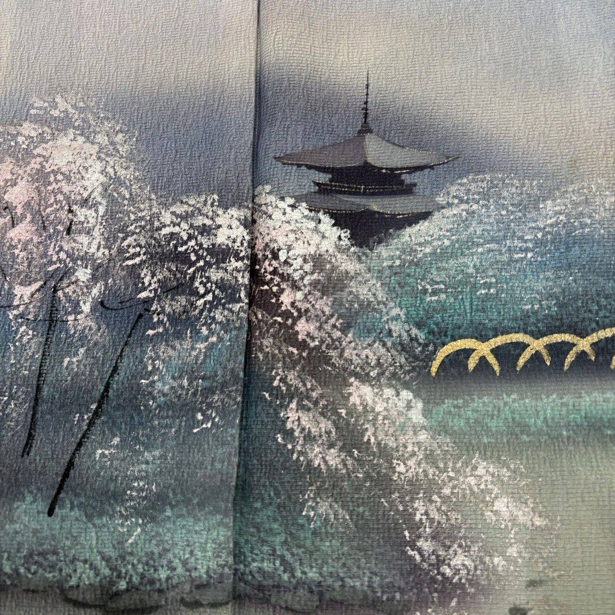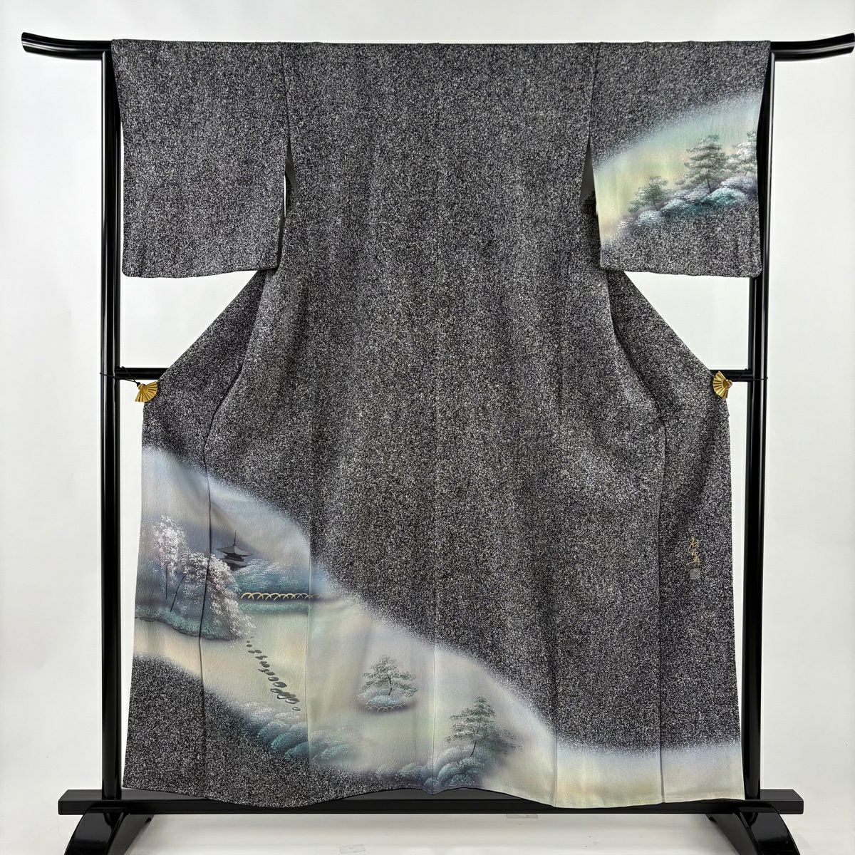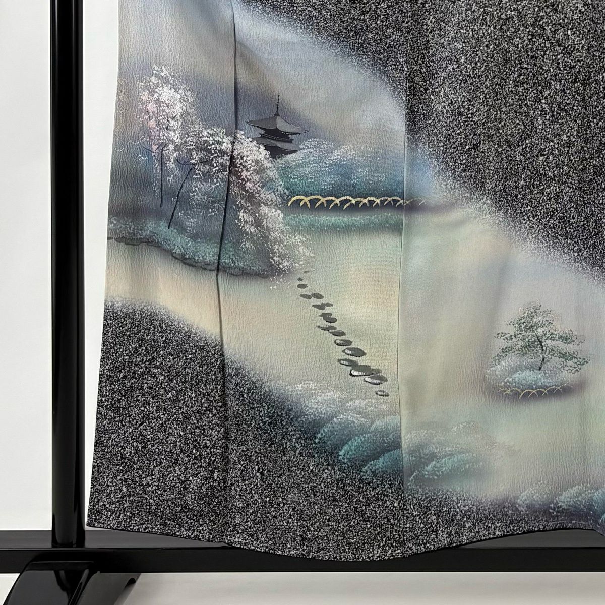 【美品】 付下げ 身丈157.5cm 裄丈65.5cm M 袷 落款あり 風景 建物 金彩 ぼかし 黒灰 正絹 秀品