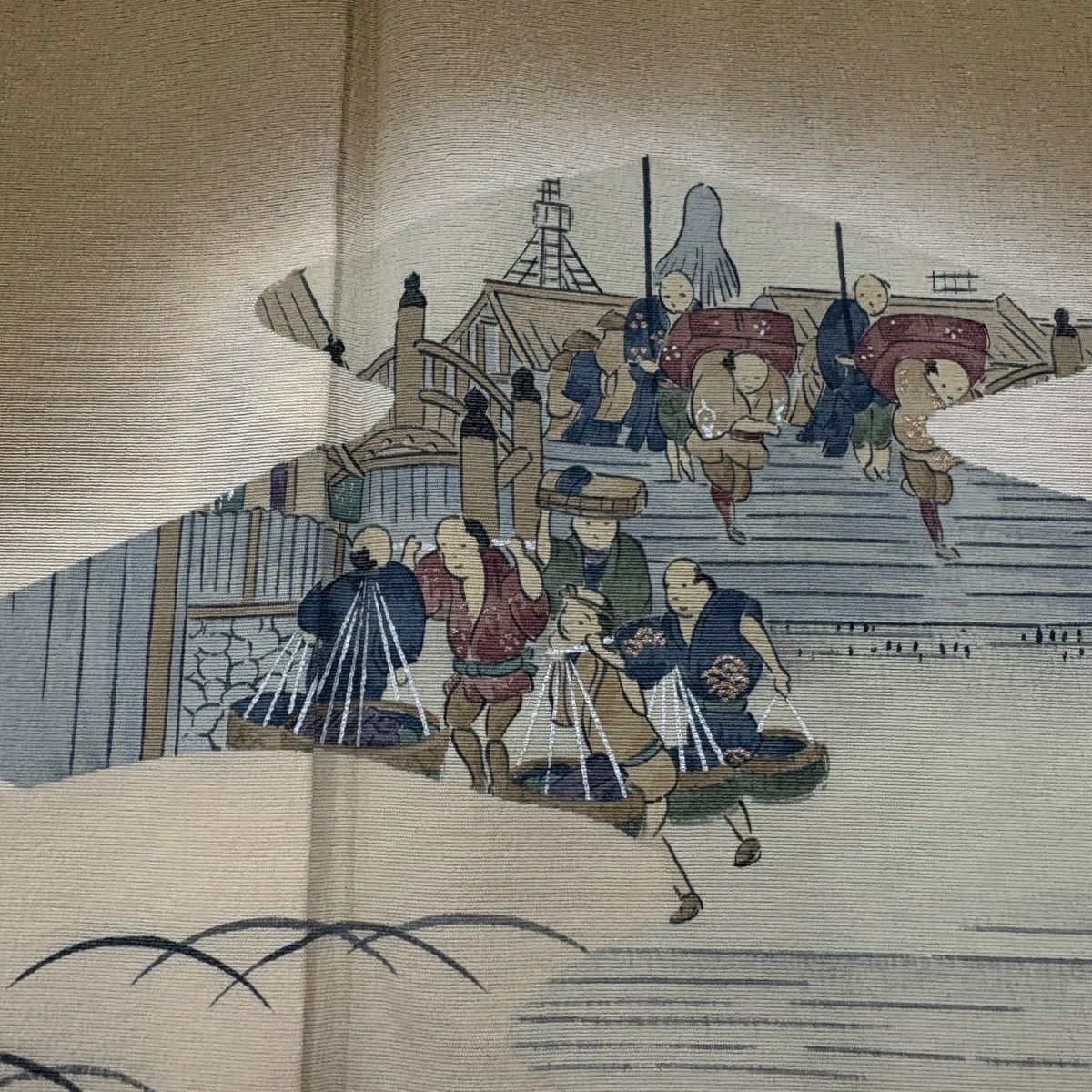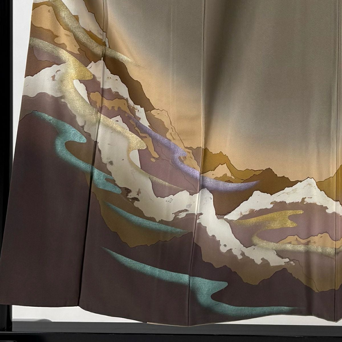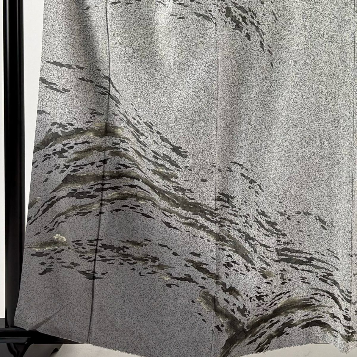 【美品】 付下げ 身丈157.5cm 裄丈65.5cm M 袷 落款あり 風景 建物 金彩 ぼかし 黒灰 正絹 秀品
