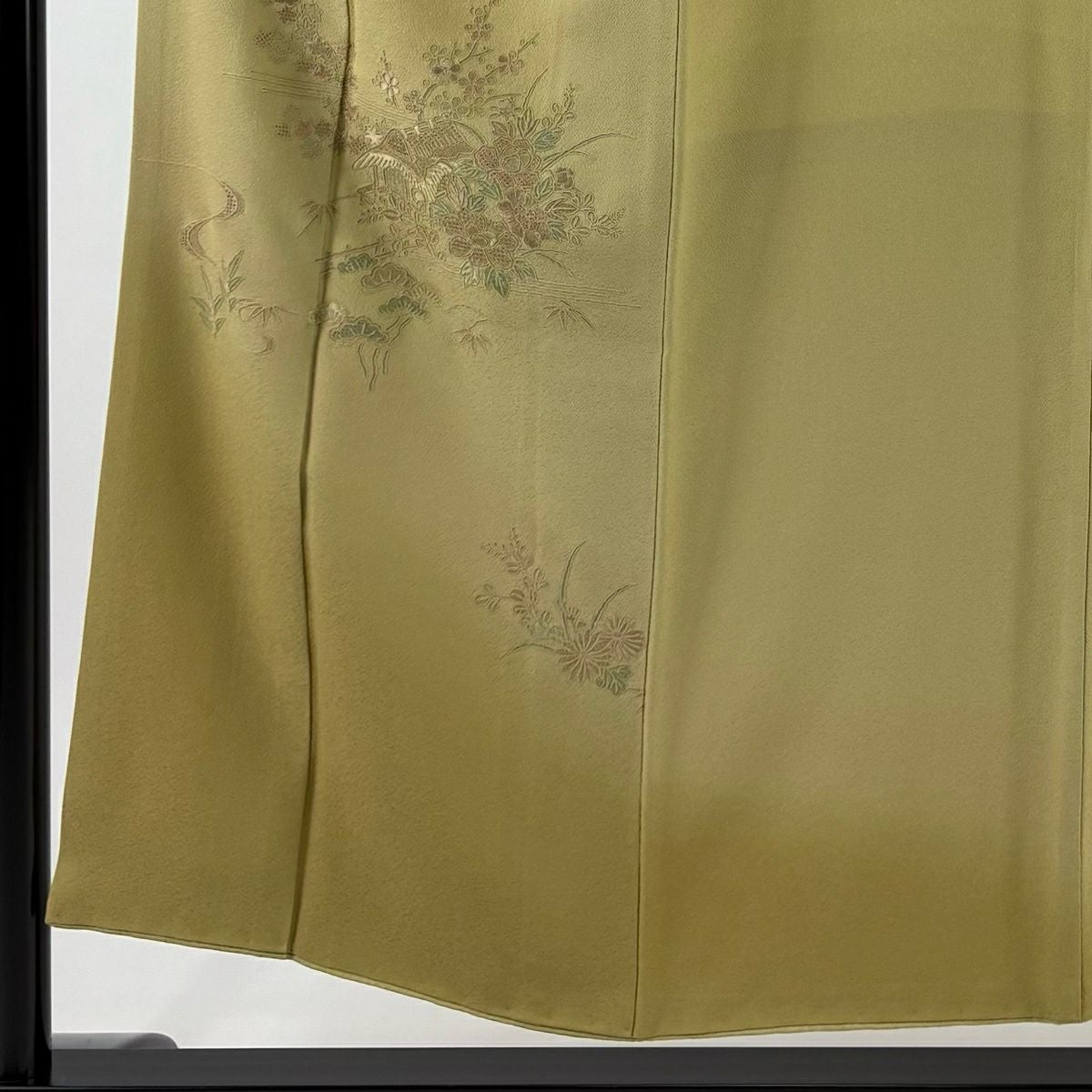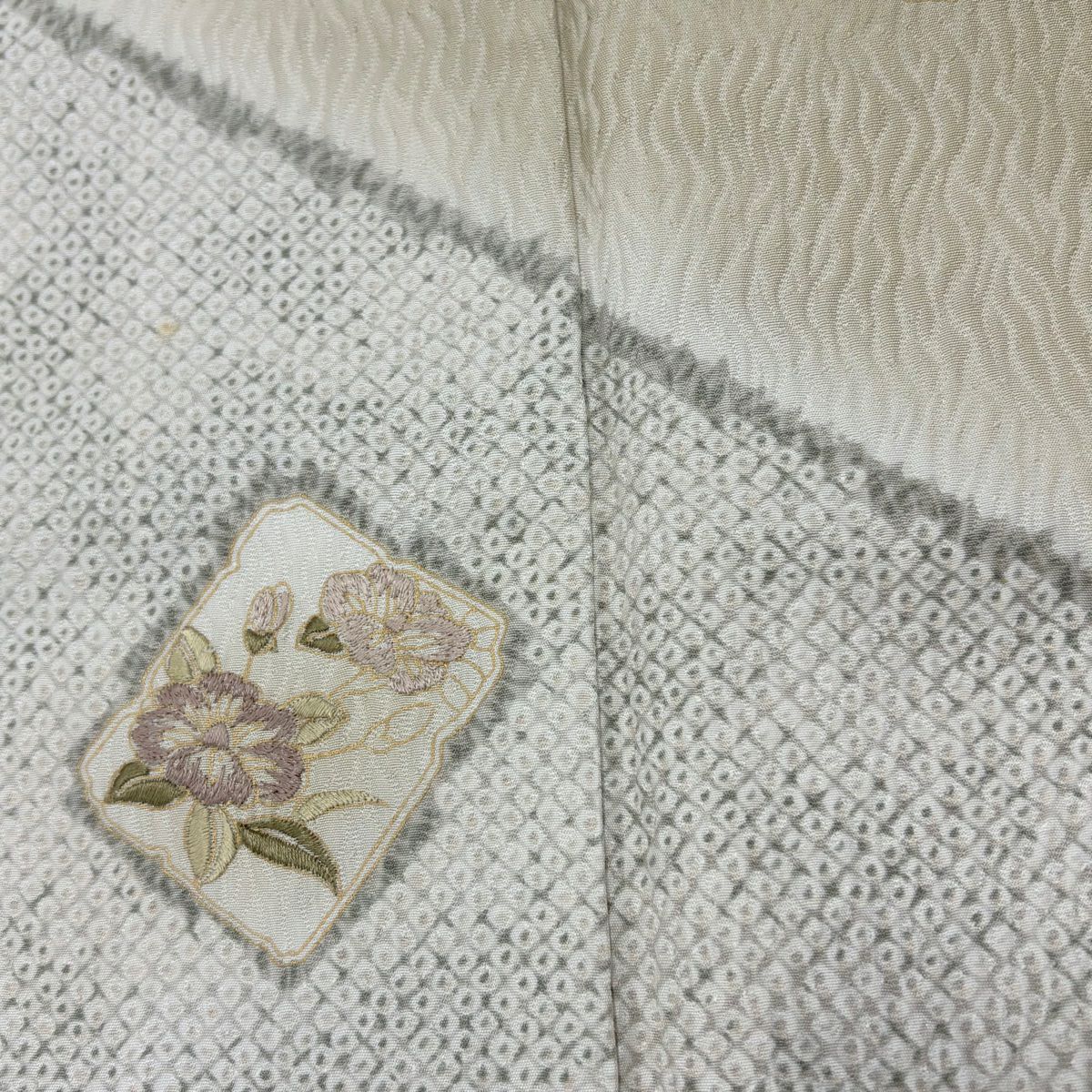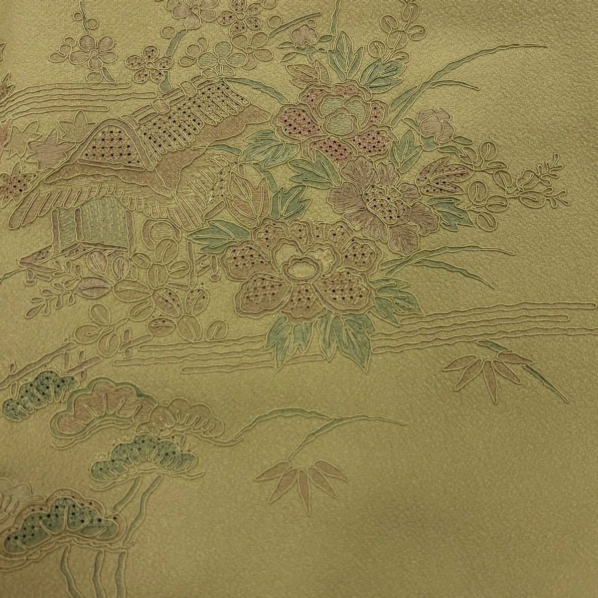 【在庫一掃】 【美品】 訪問着 身丈154.5cm 裄丈64cm M 袷 扇面 菖蒲 刺繍 絞り 鶯色 正絹 秀品