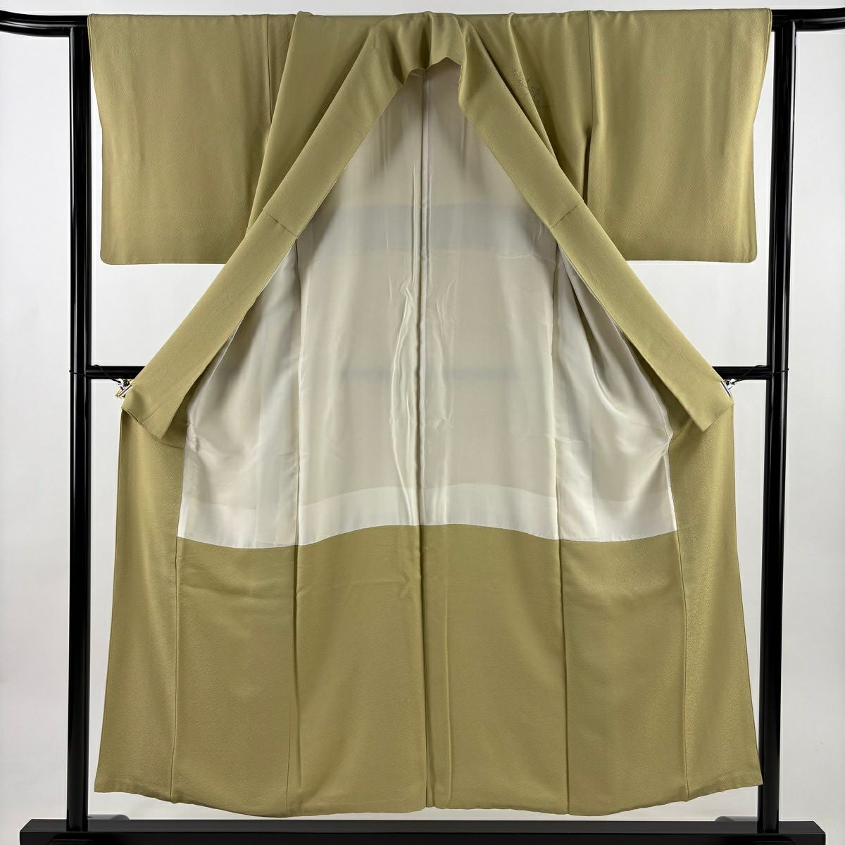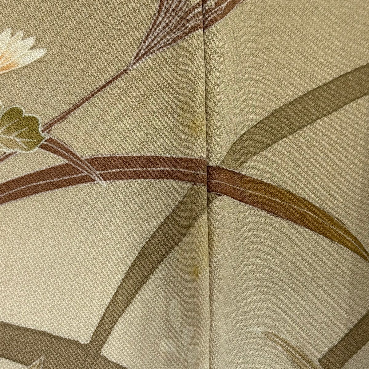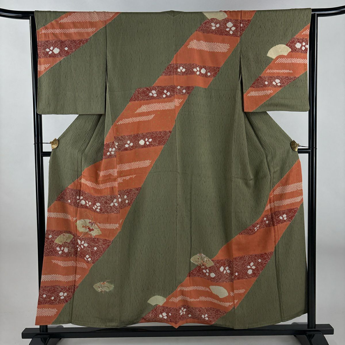 【在庫一掃】 【美品】 訪問着 身丈154.5cm 裄丈64cm M 袷 扇面 菖蒲 刺繍 絞り 鶯色 正絹 秀品