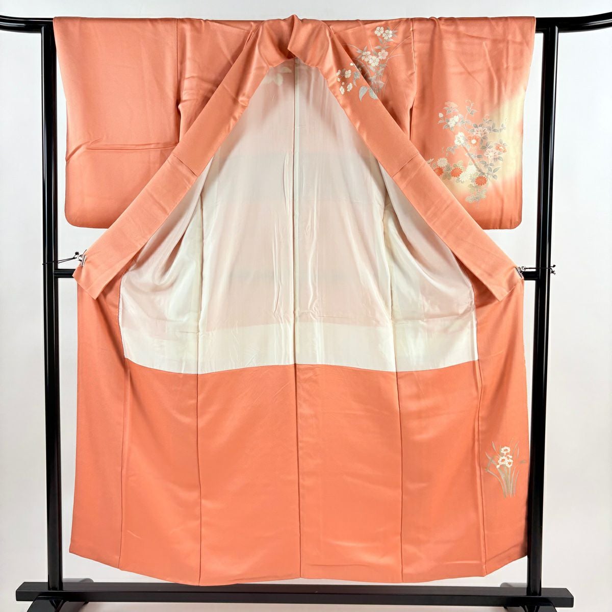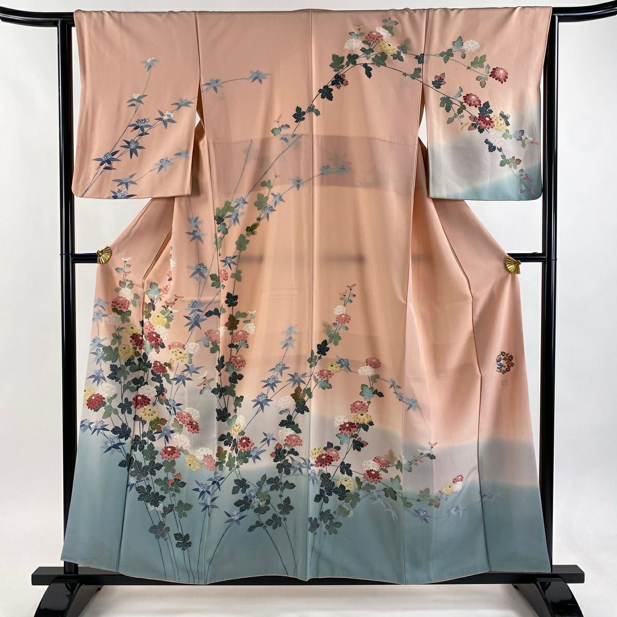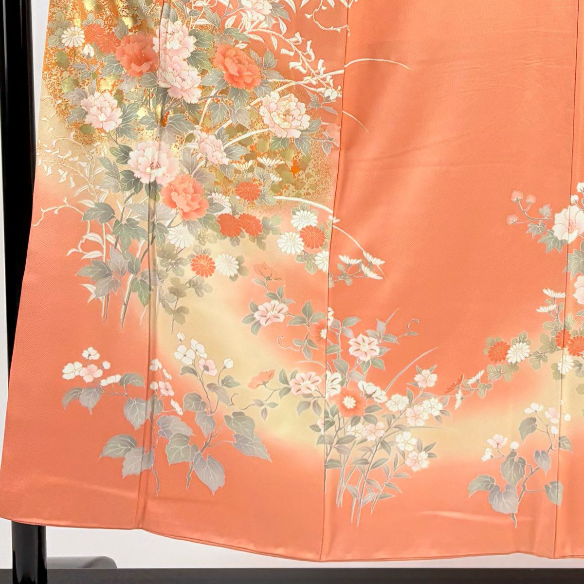 【在庫一掃】 訪問着 身丈154cm 裄丈63cm S 袷 牡丹 菊 金彩 ぼかし サーモンピンク 正絹 秀品
