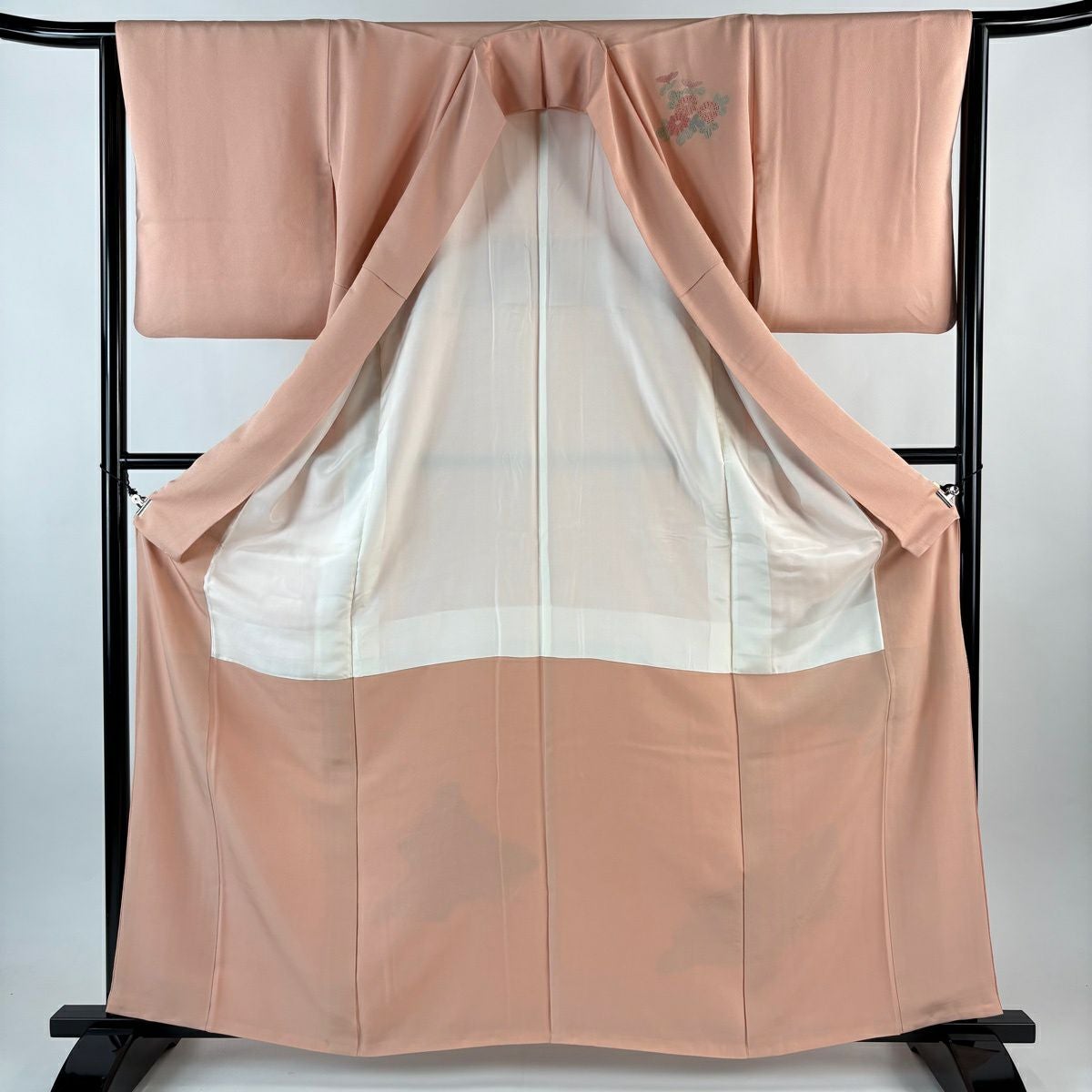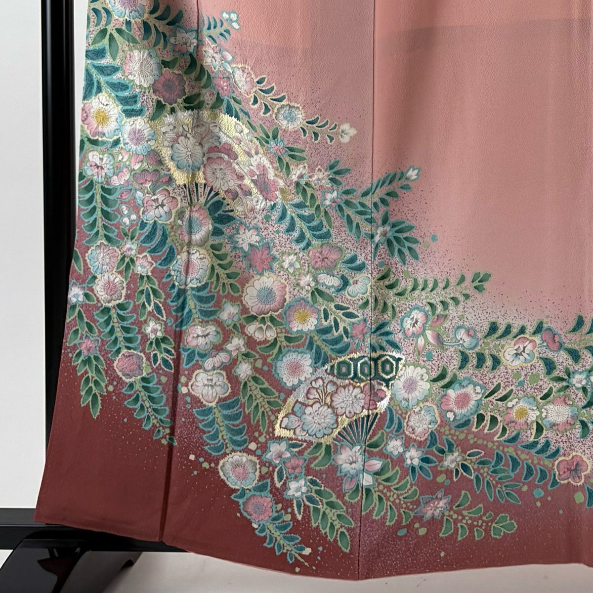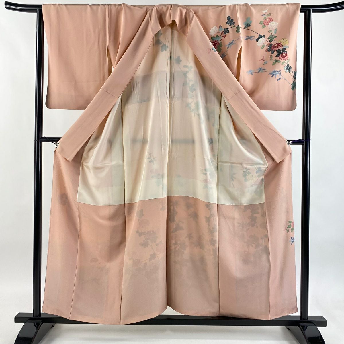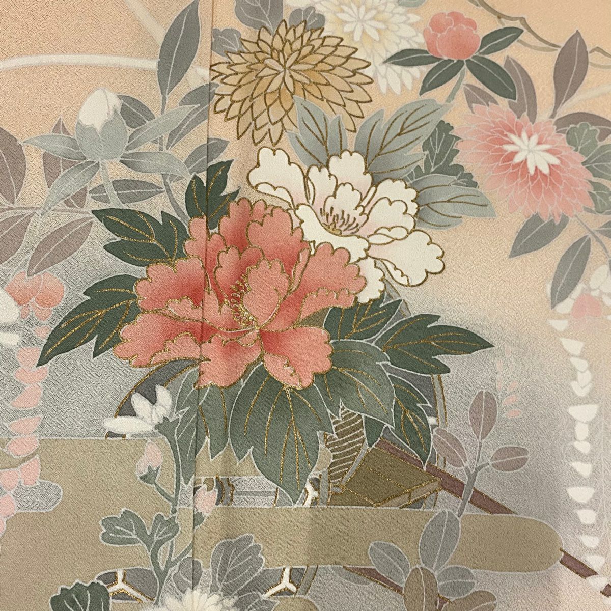 【在庫一掃】 訪問着 身丈154cm 裄丈63cm S 袷 牡丹 菊 金彩 ぼかし サーモンピンク 正絹 秀品