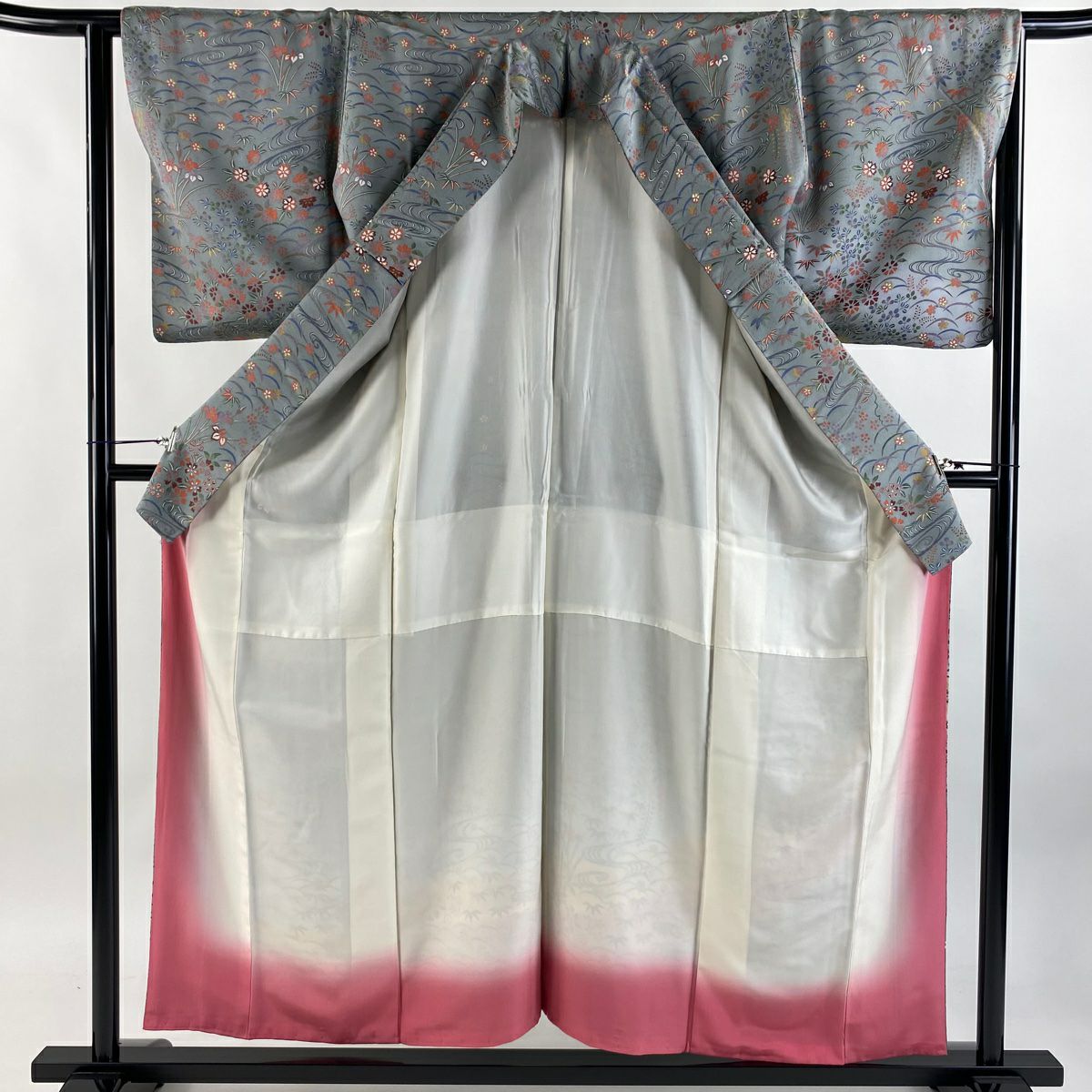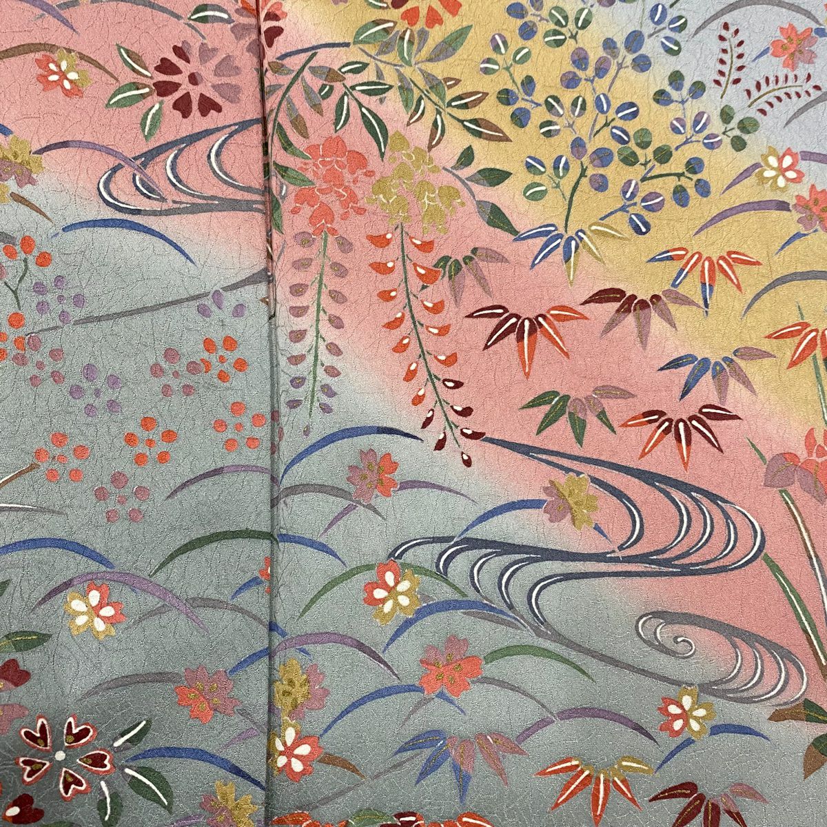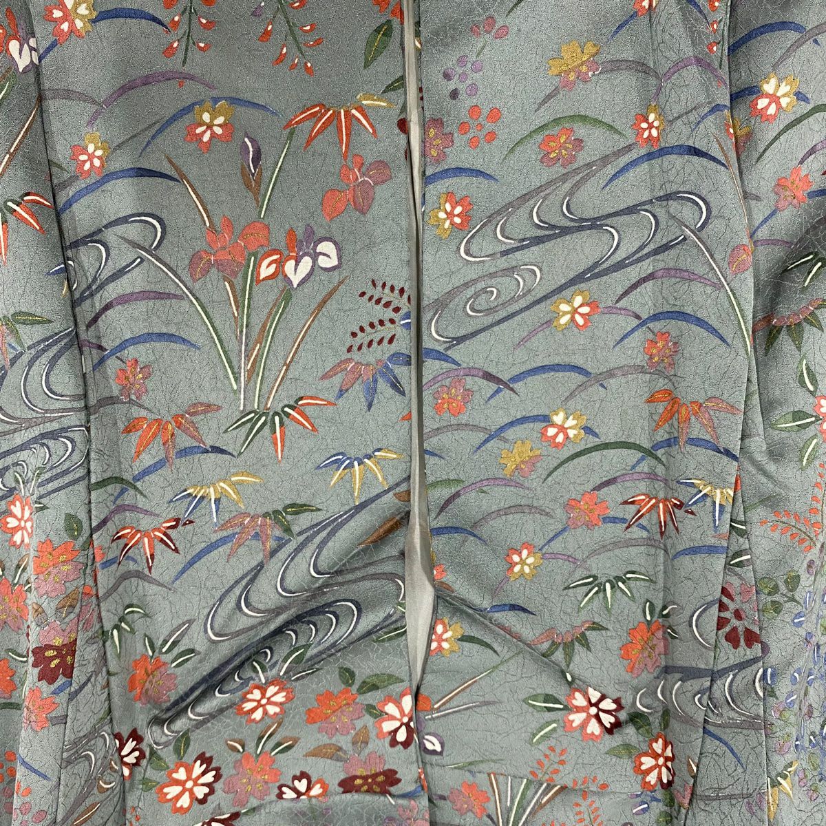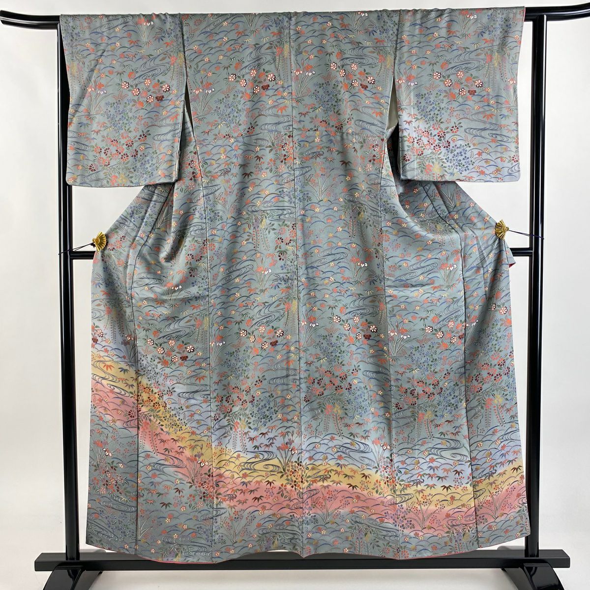【在庫一掃】 付下げ 身丈157.5cm 裄丈64cm M 袷 草花 流水 染め分け ぼかし 青灰色 正絹 秀品