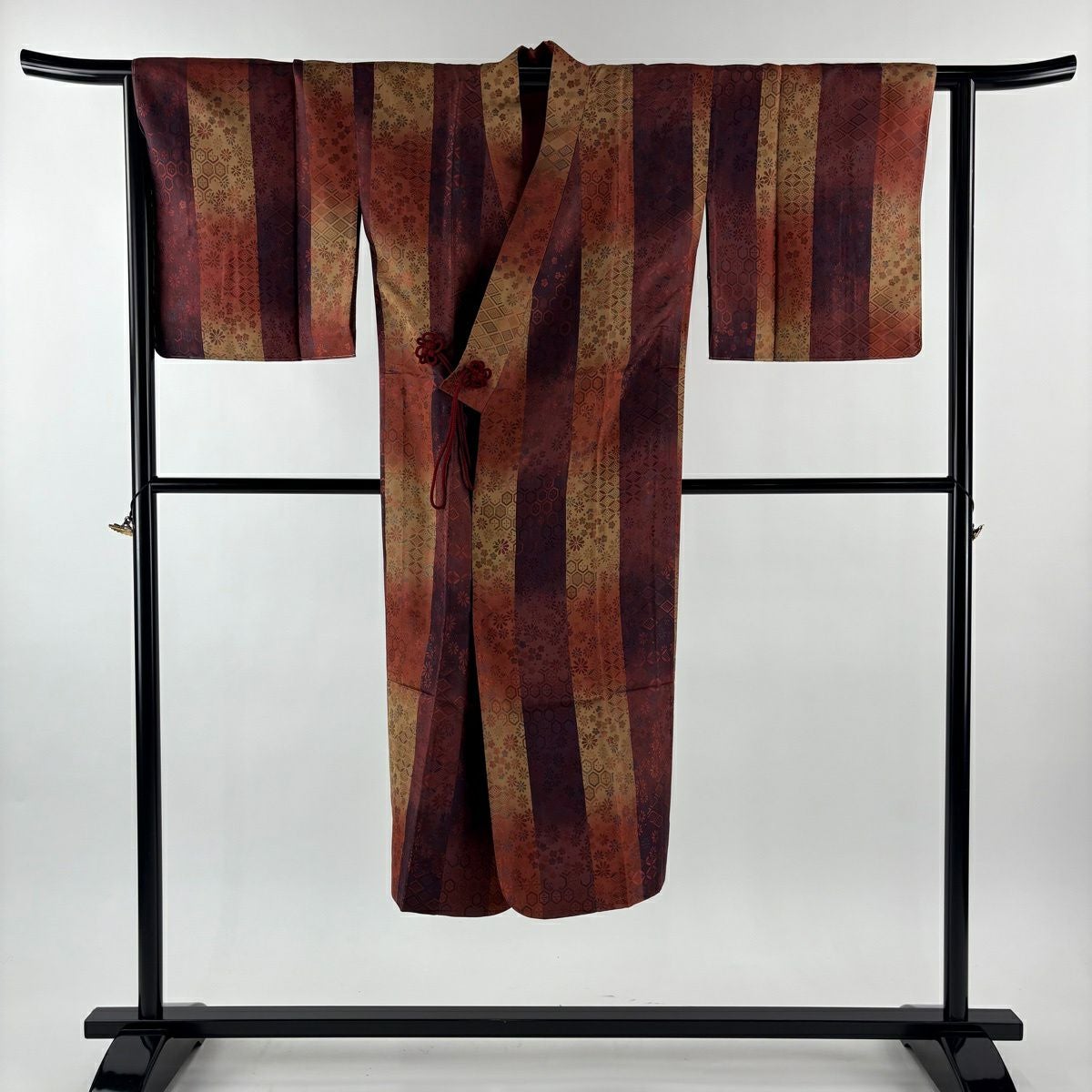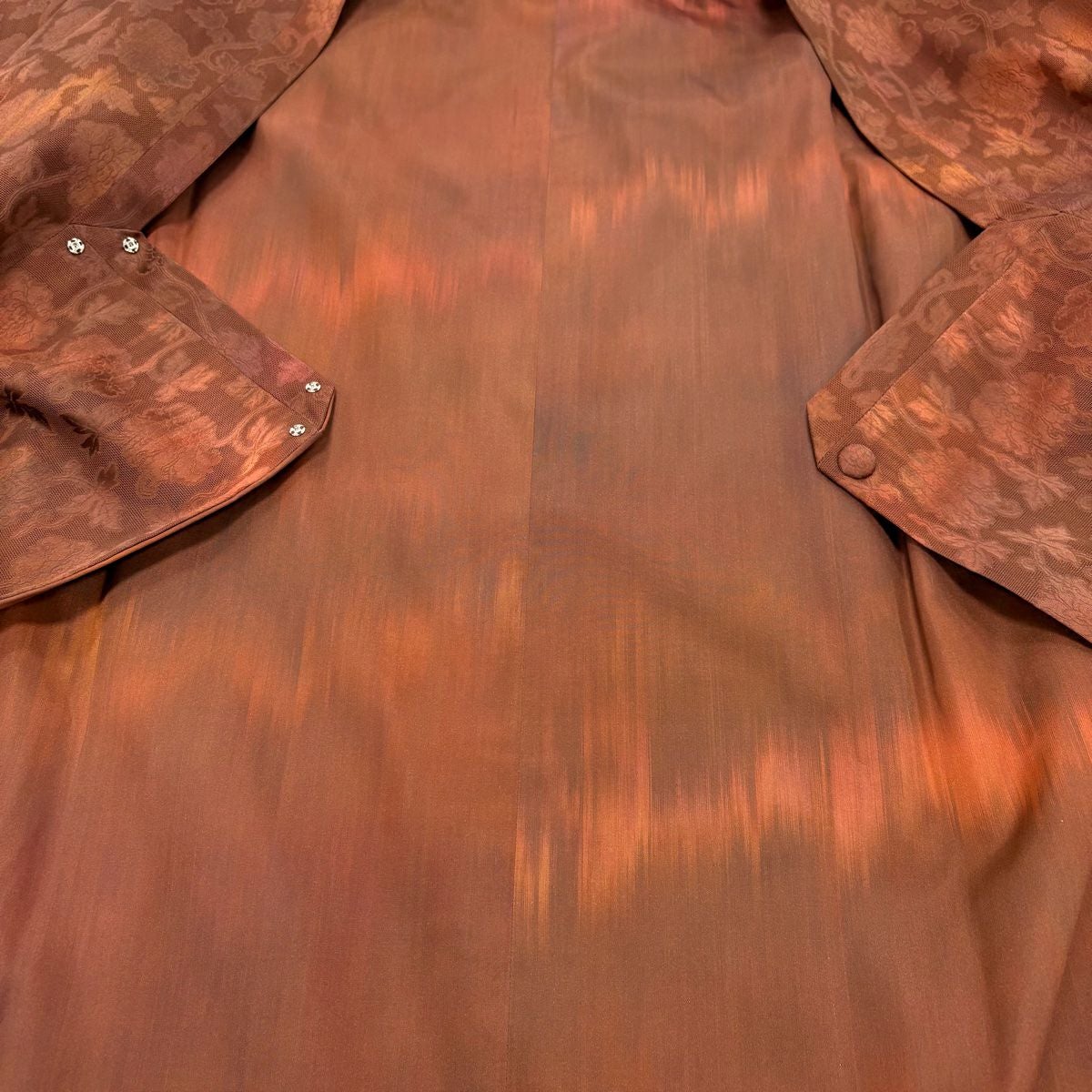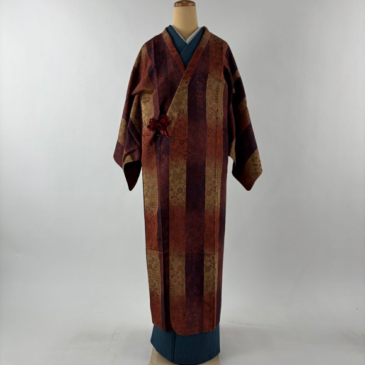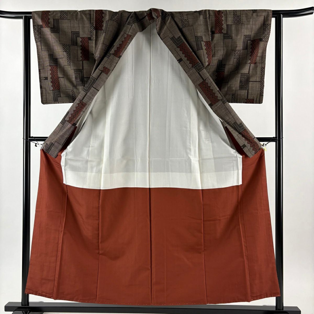 【在庫一掃】 【美品】 道中着 身丈87.5cm 裄丈65.5cm M 和装コート 幾何学 陶彩染 薄小豆 正絹 秀品