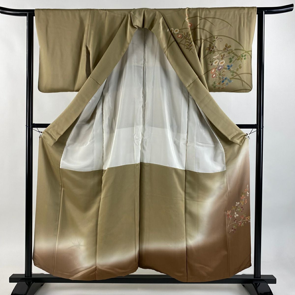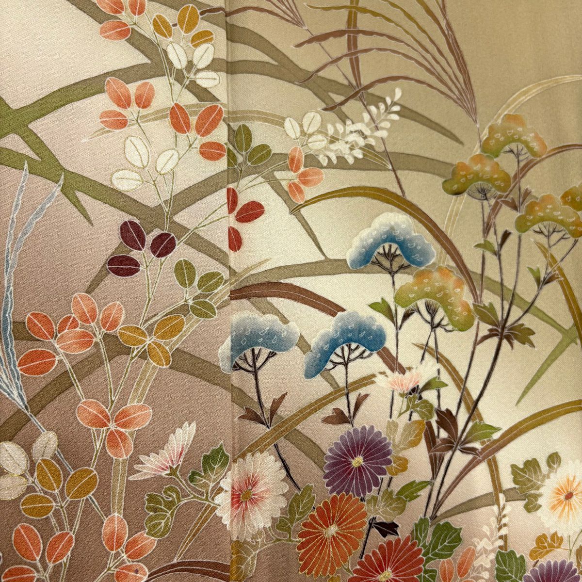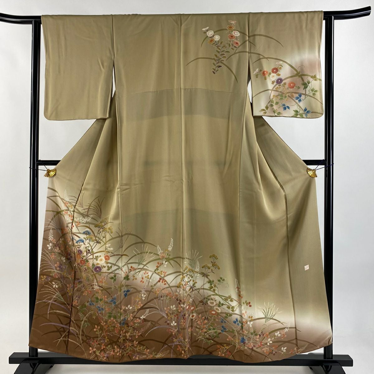 【在庫一掃】 訪問着 身丈156cm 裄丈64cm M 袷 落款あり 秋草文 薄 ぼかし 金彩 薄茶色 正絹 秀品