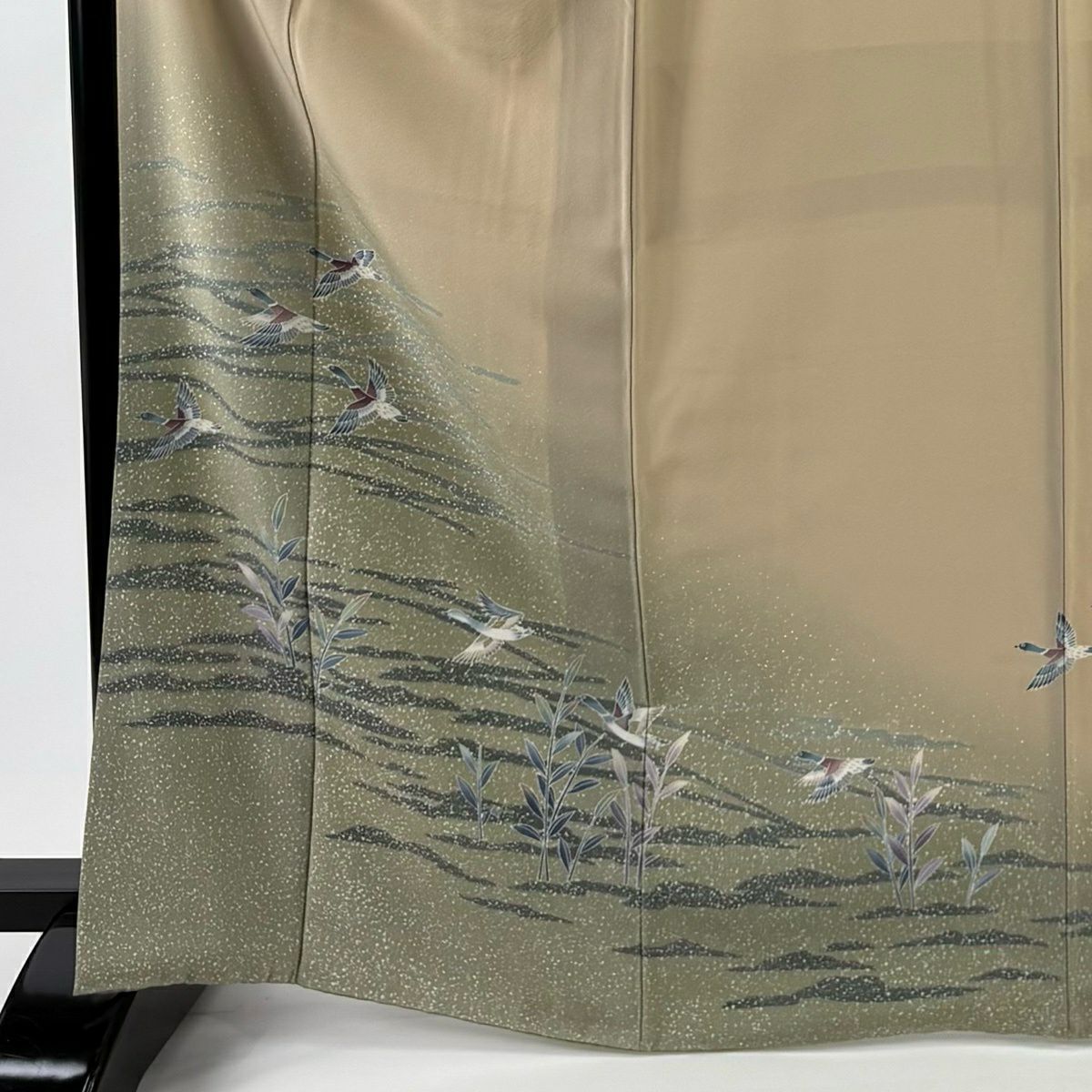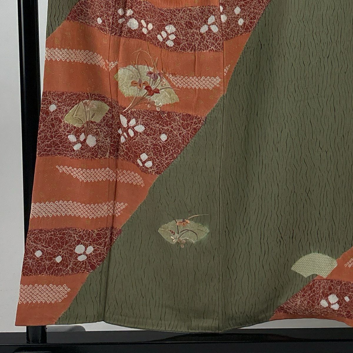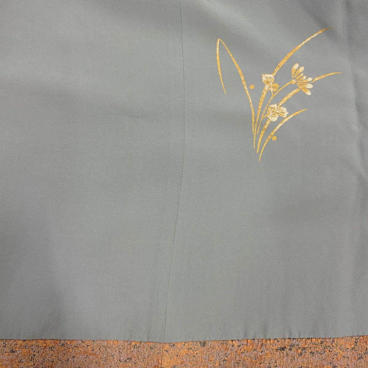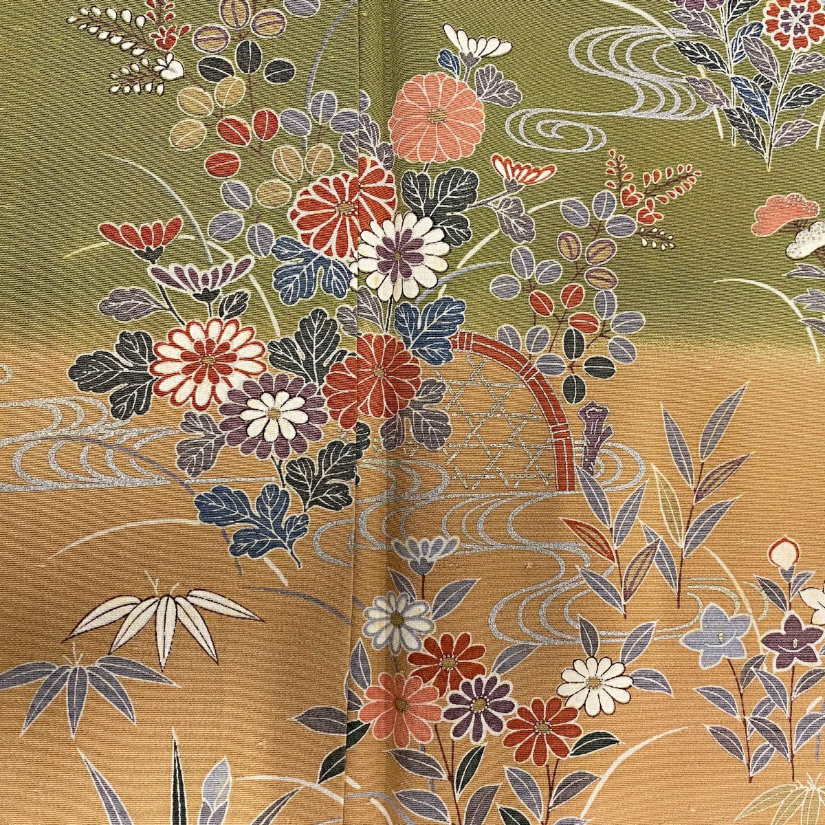 【在庫一掃】 訪問着 身丈155.5cm 裄丈65.5cm M 袷 秋草 流水 金銀彩 染め分け よもぎ色 正絹 秀品
