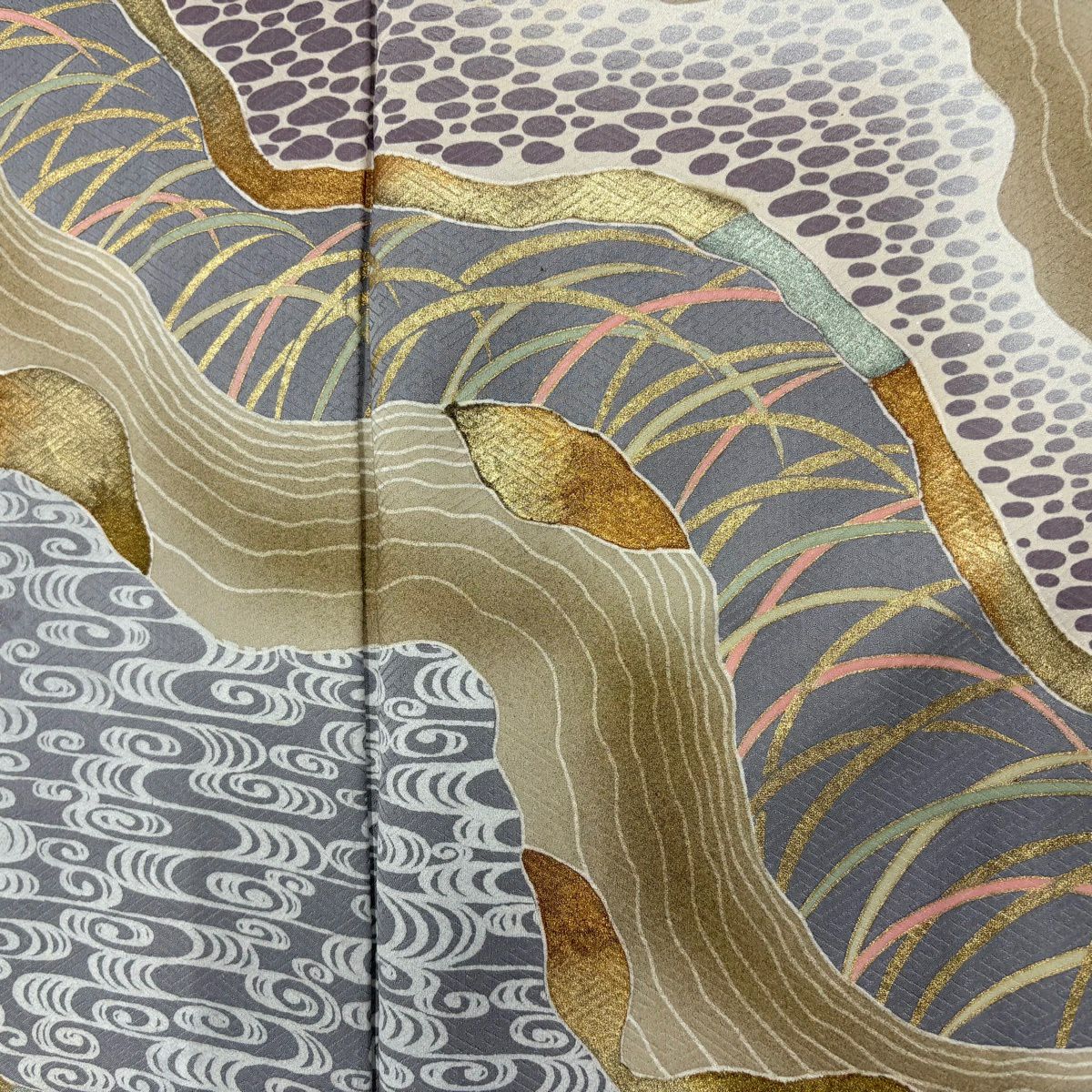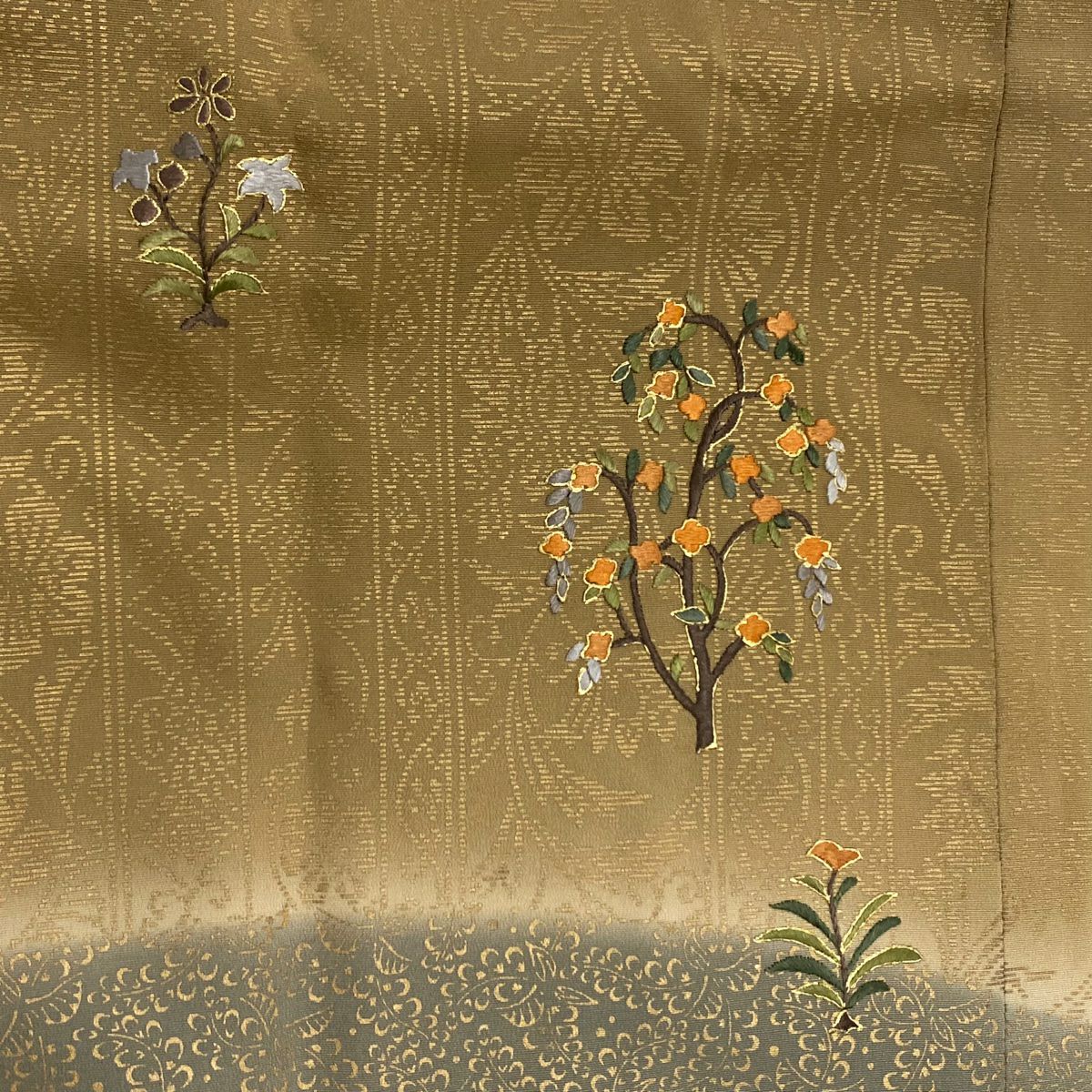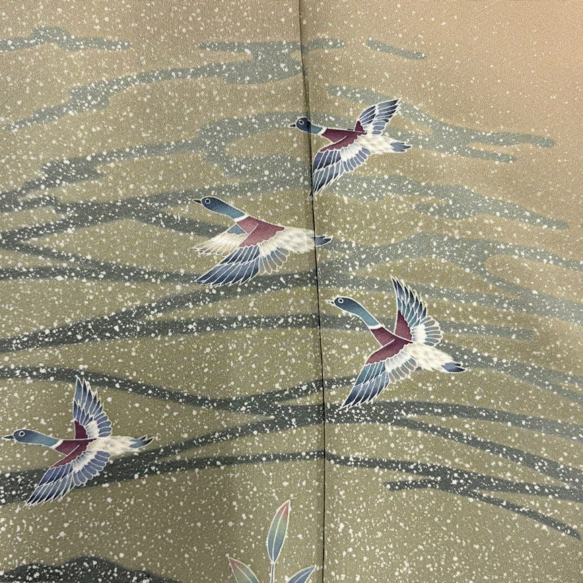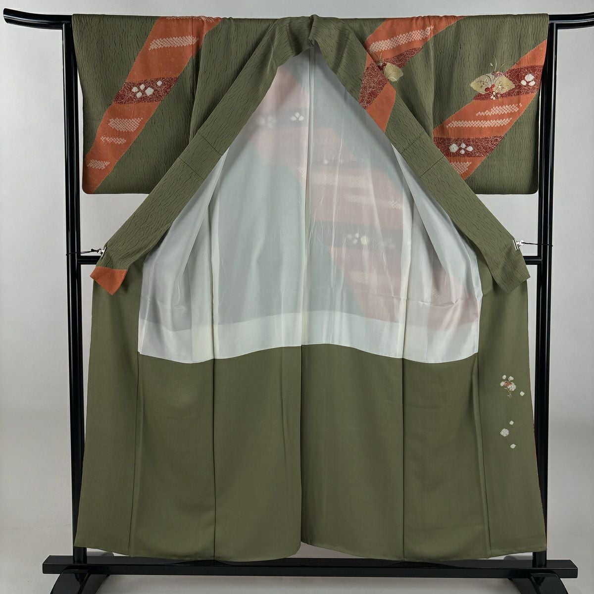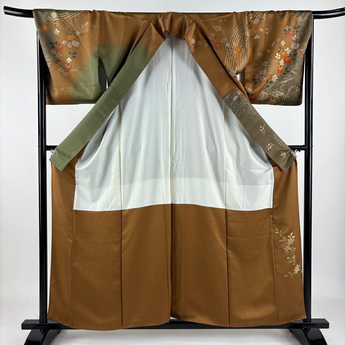 【在庫一掃】 訪問着 身丈155.5cm 裄丈65.5cm M 袷 秋草 流水 金銀彩 染め分け よもぎ色 正絹 秀品