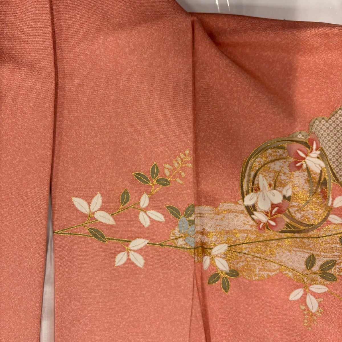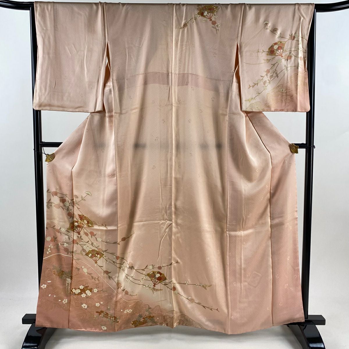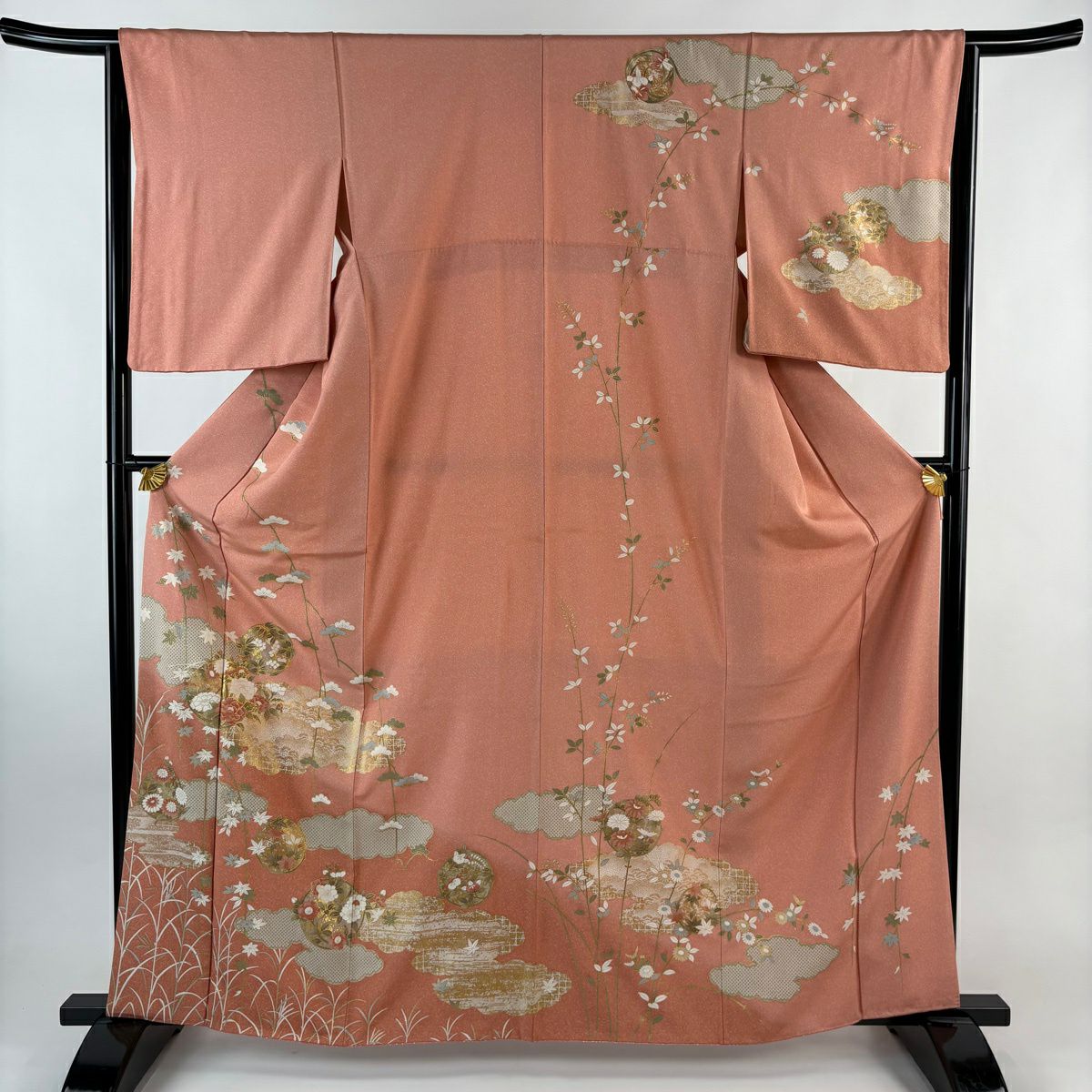 【在庫一掃】 訪問着 身丈161.5cm 裄丈66.5cm M 袷 扇 花筏 金糸 金彩 サーモンピンク 正絹 秀品