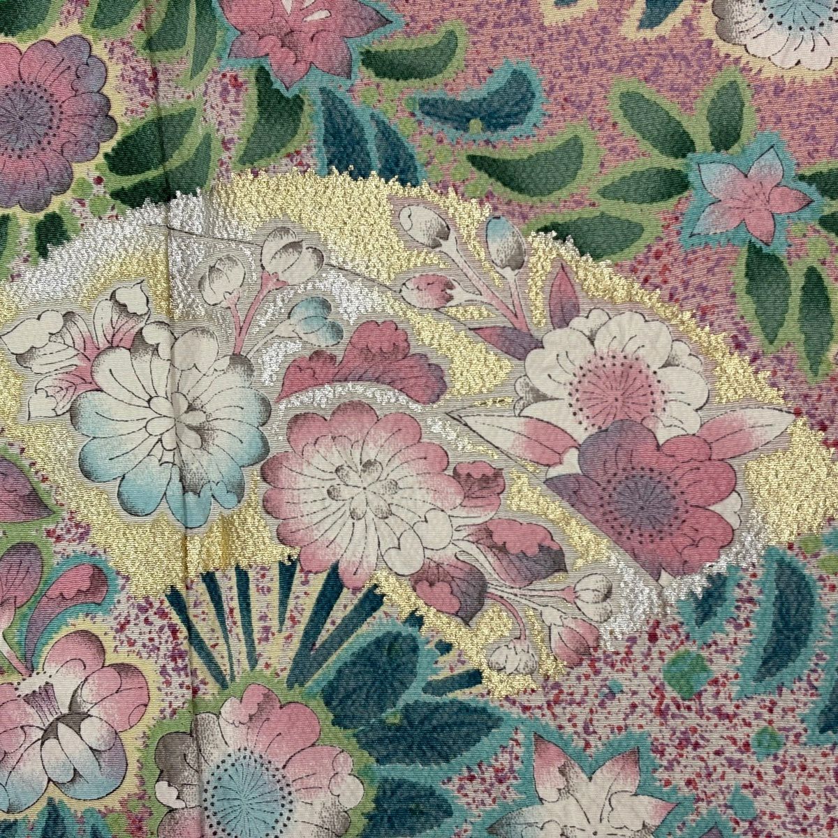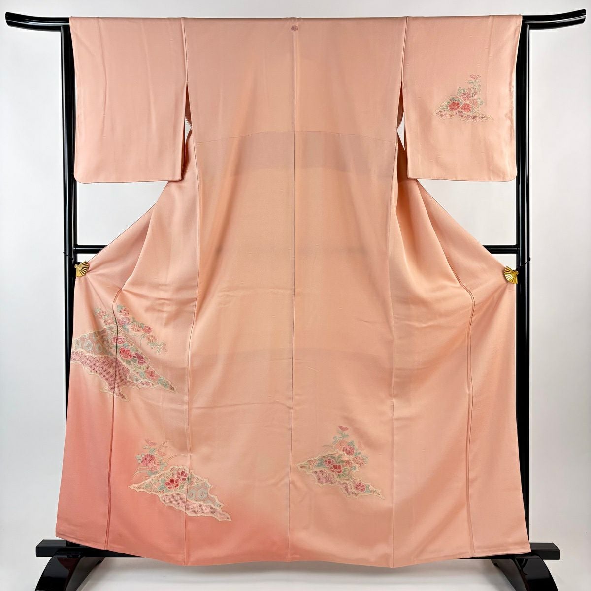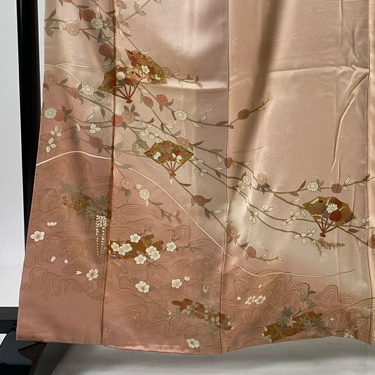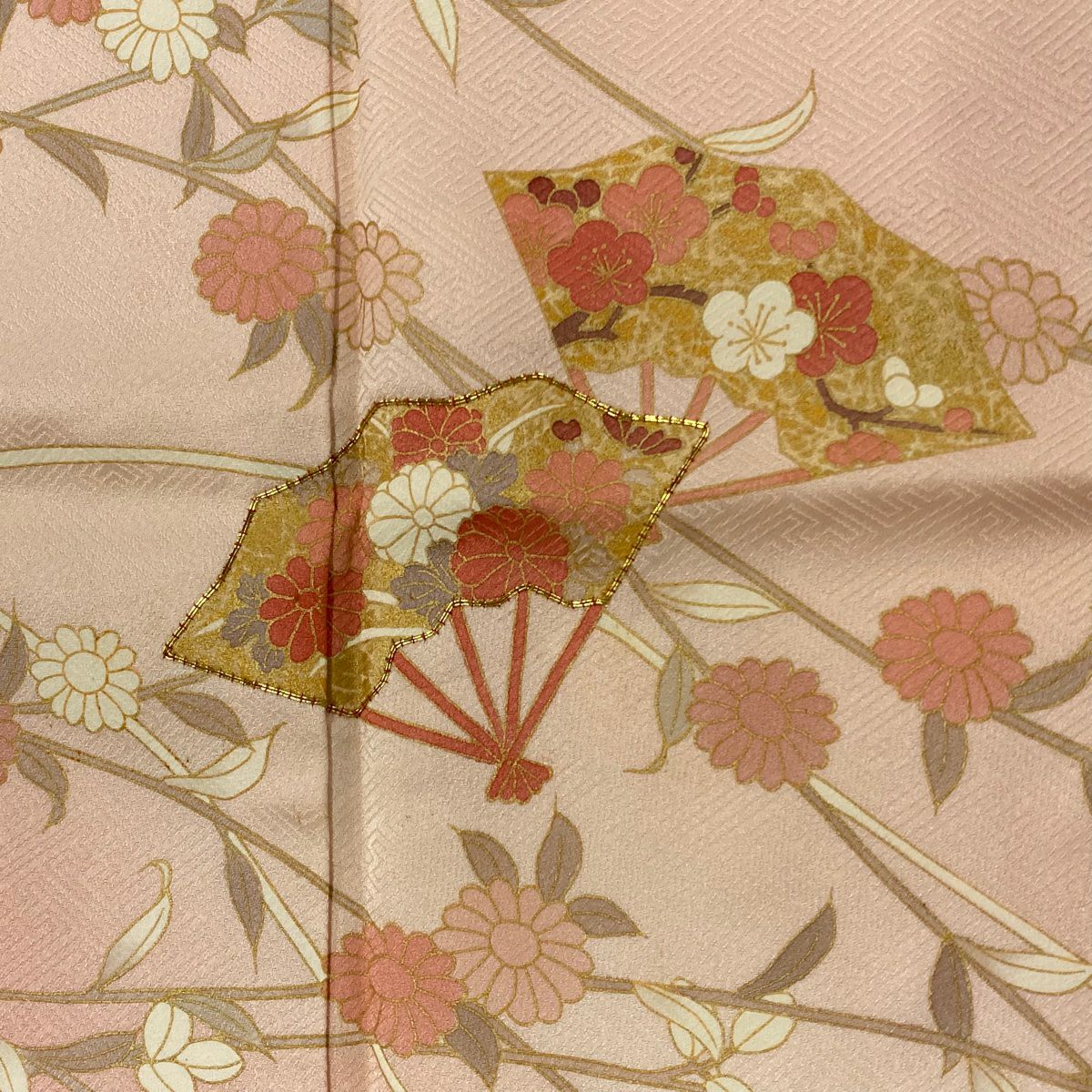 【在庫一掃】 訪問着 身丈161.5cm 裄丈66.5cm M 袷 扇 花筏 金糸 金彩 サーモンピンク 正絹 秀品