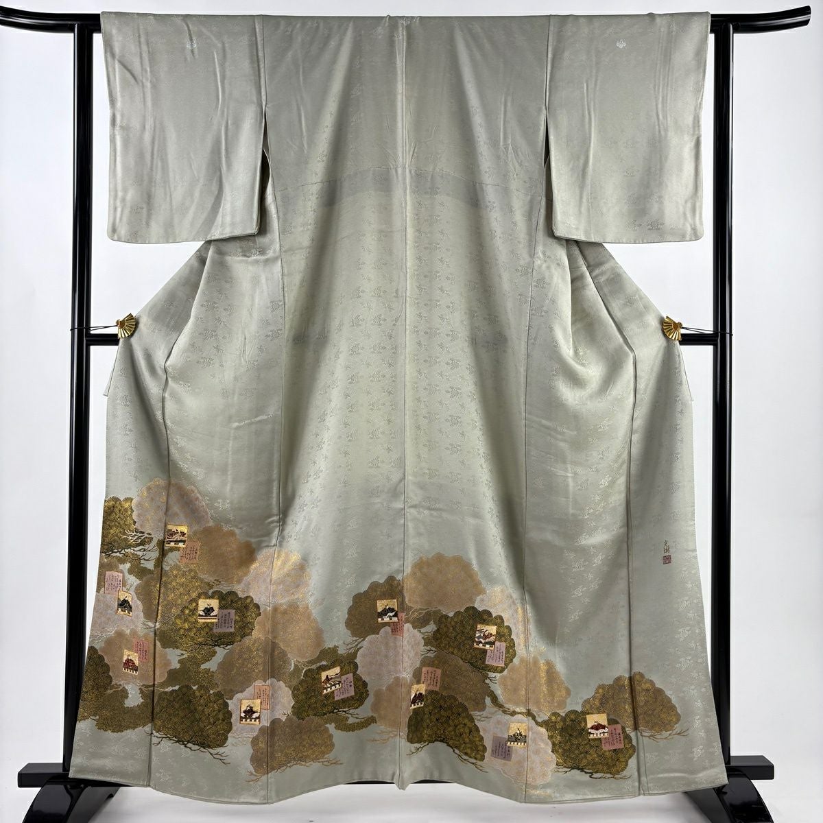【在庫一掃】 訪問着 身丈155.5cm 裄丈62.5cm S 袷 落款あり 家屋 松竹梅 ぼかし 灰紫 正絹 秀品