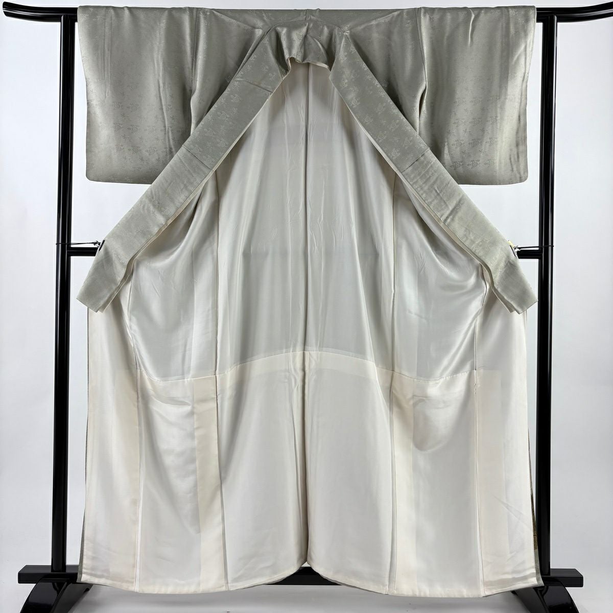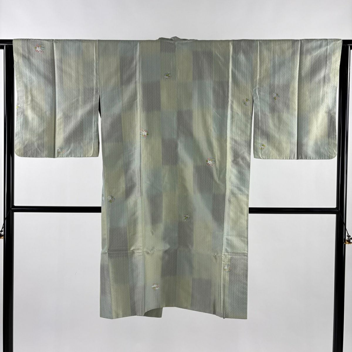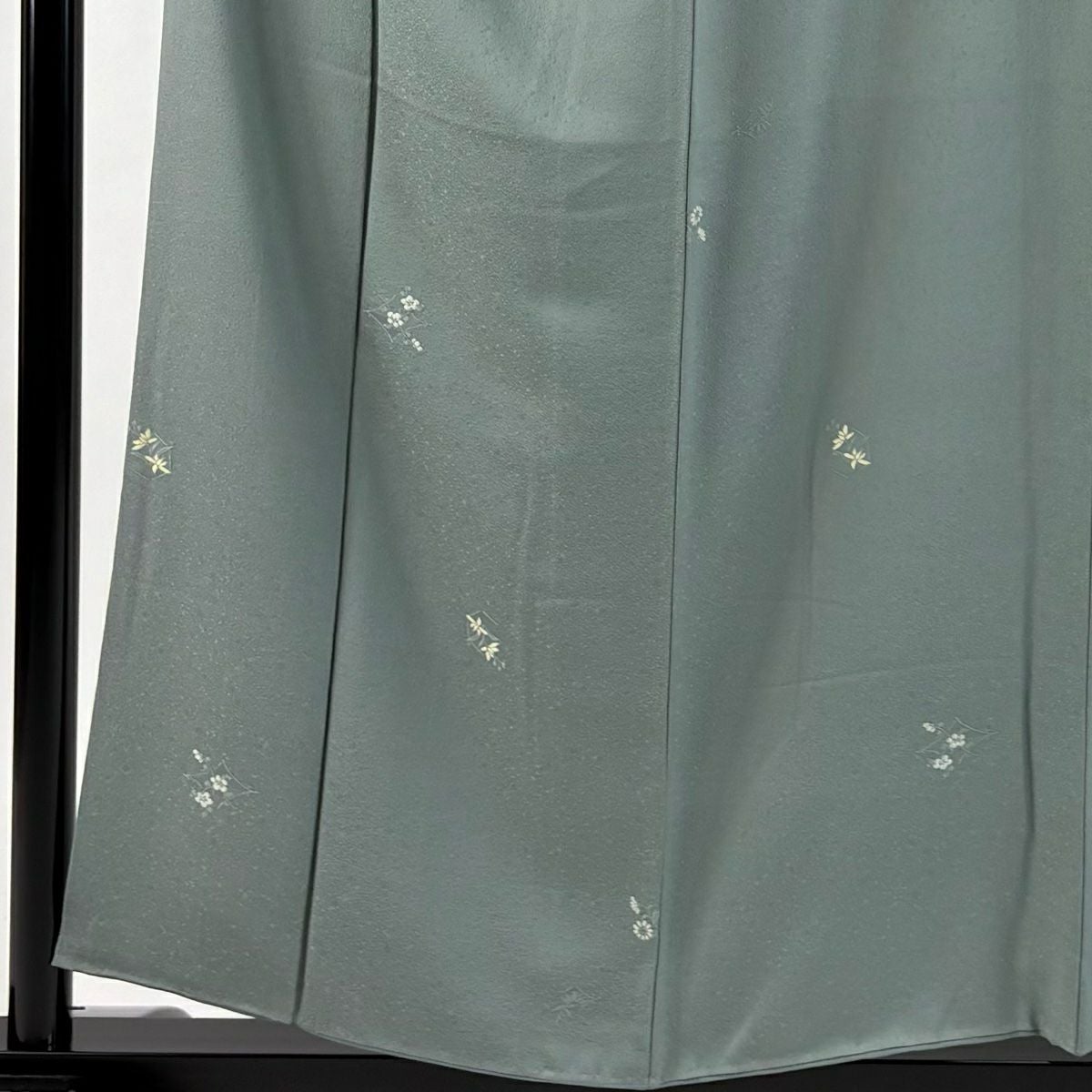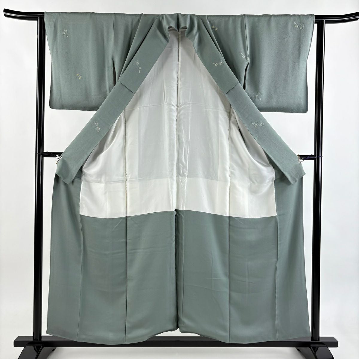 【在庫一掃】 付下げ 身丈154.5cm 裄丈62cm S 袷 草花 波 刺繍 金銀彩 灰緑 正絹 秀品 一つ紋