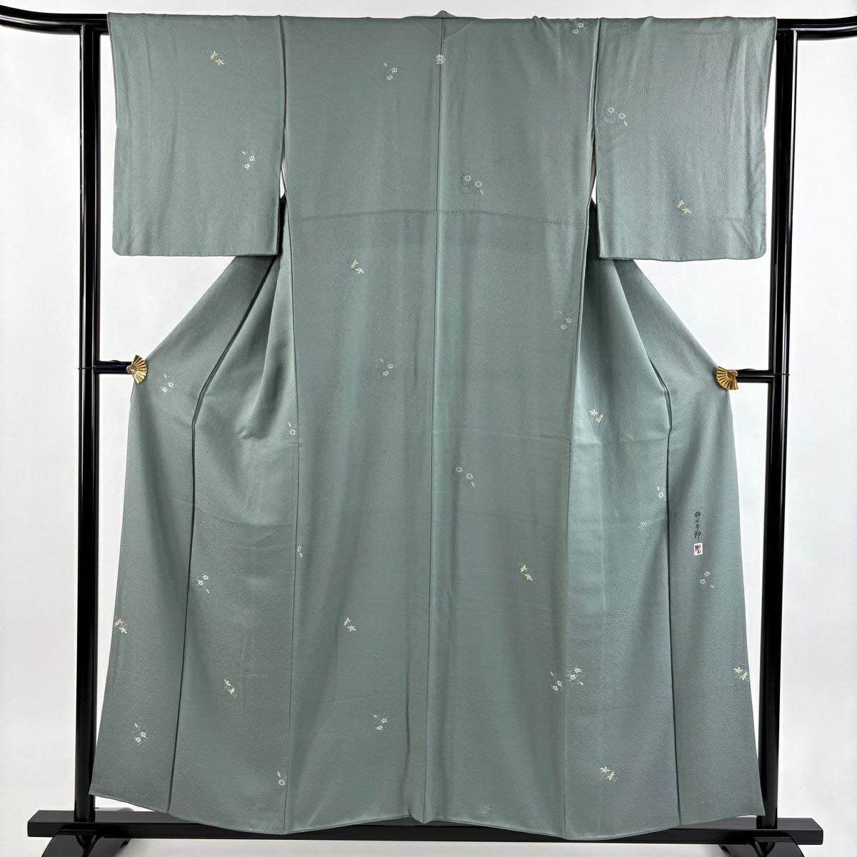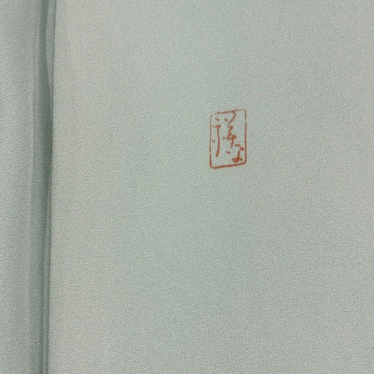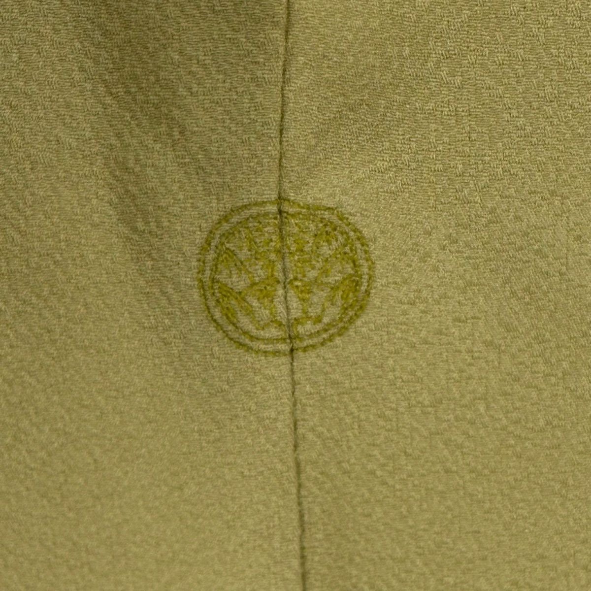 【在庫一掃】 小紋 身丈156cm 裄丈62cm S 袷 柿本市郎 落款あり 草花 枝梅 緑 正絹 秀品 一つ紋