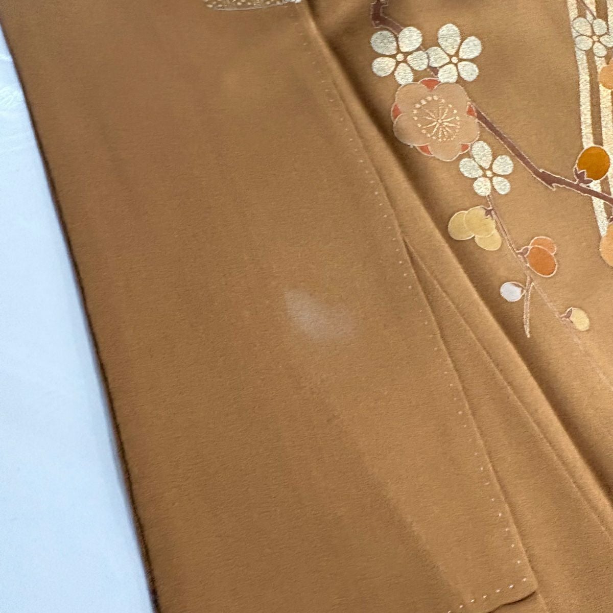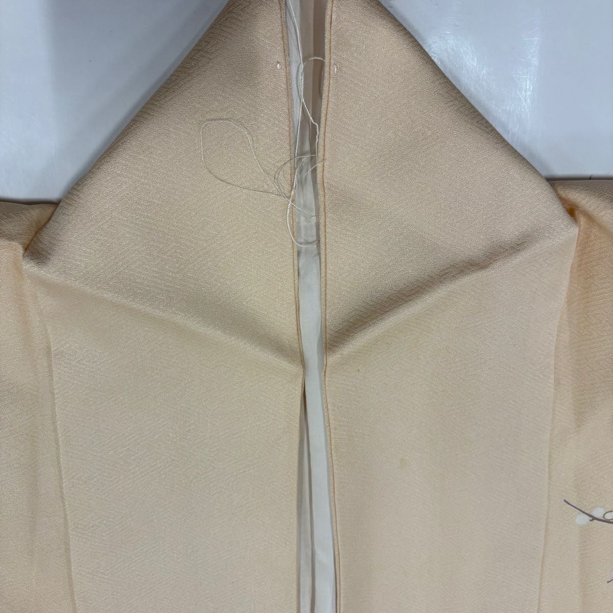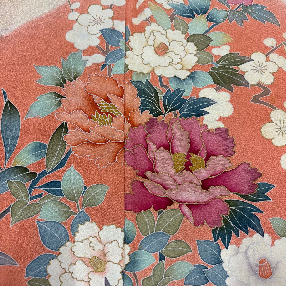 【在庫一掃】 訪問着 身丈153cm 裄丈64.5cm M 袷 牡丹 枝梅 刺繍 金彩 薄オレンジ 正絹 秀品