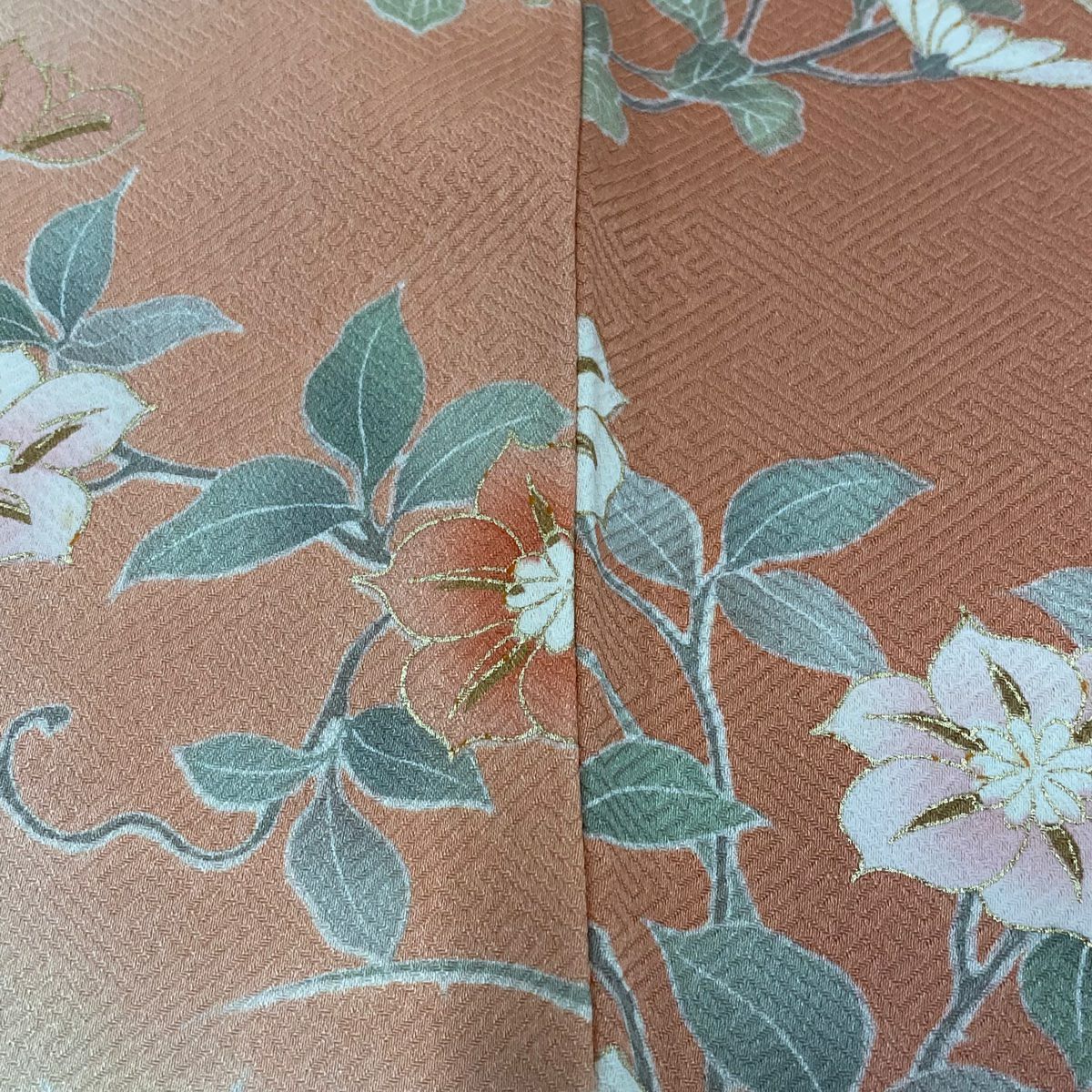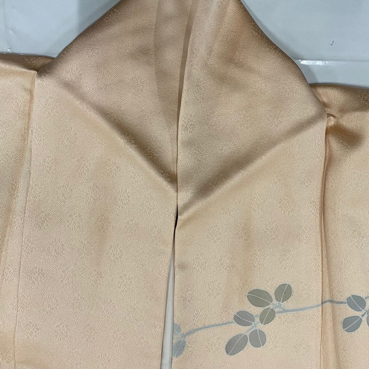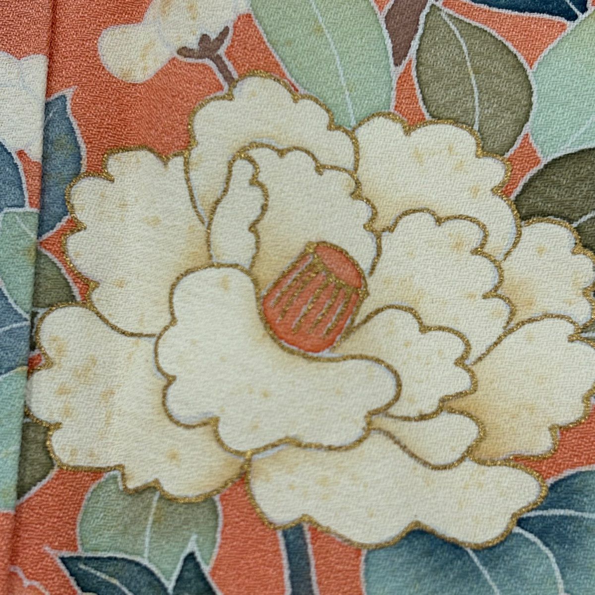 【在庫一掃】 訪問着 身丈153cm 裄丈64.5cm M 袷 牡丹 枝梅 刺繍 金彩 薄オレンジ 正絹 秀品