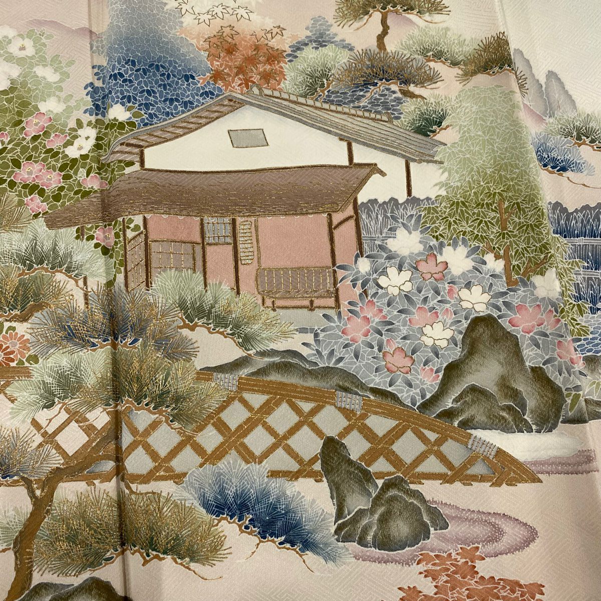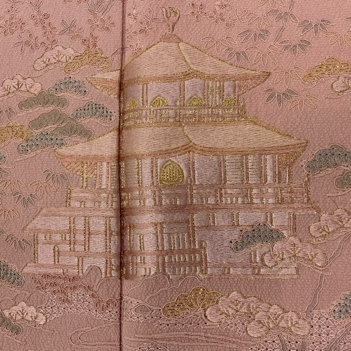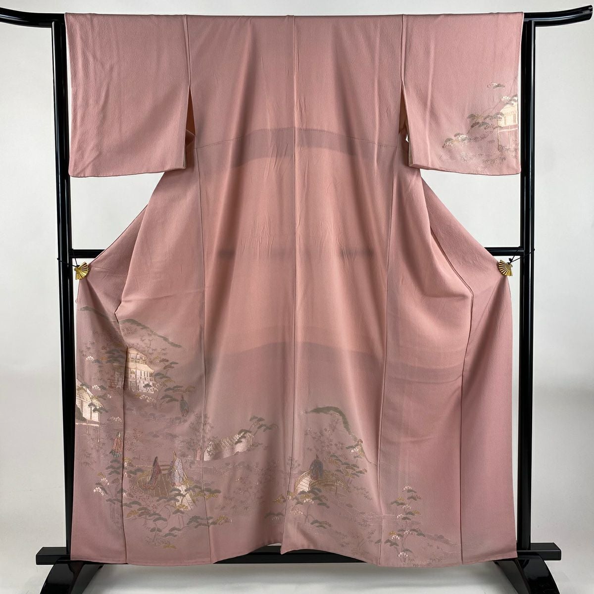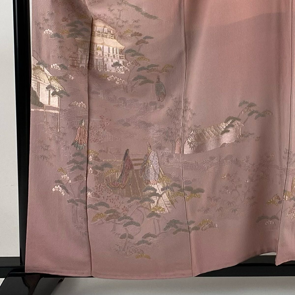 【在庫一掃】 付下げ 身丈159cm 裄丈64cm M 袷 鈴乃屋 建物 人物 刺繍 金糸 ピンク 正絹 秀品