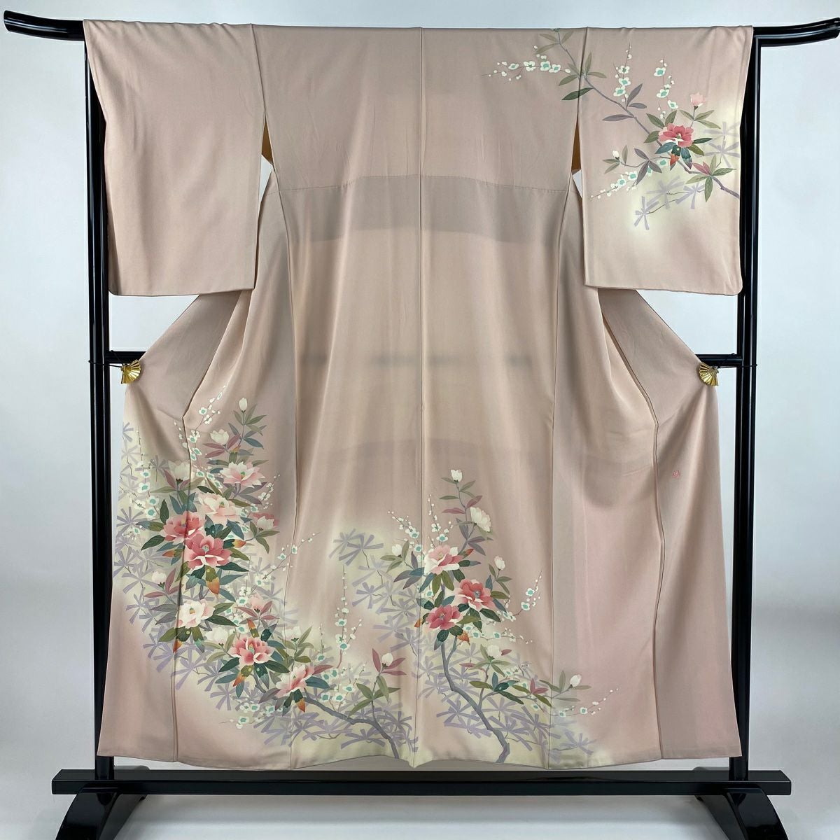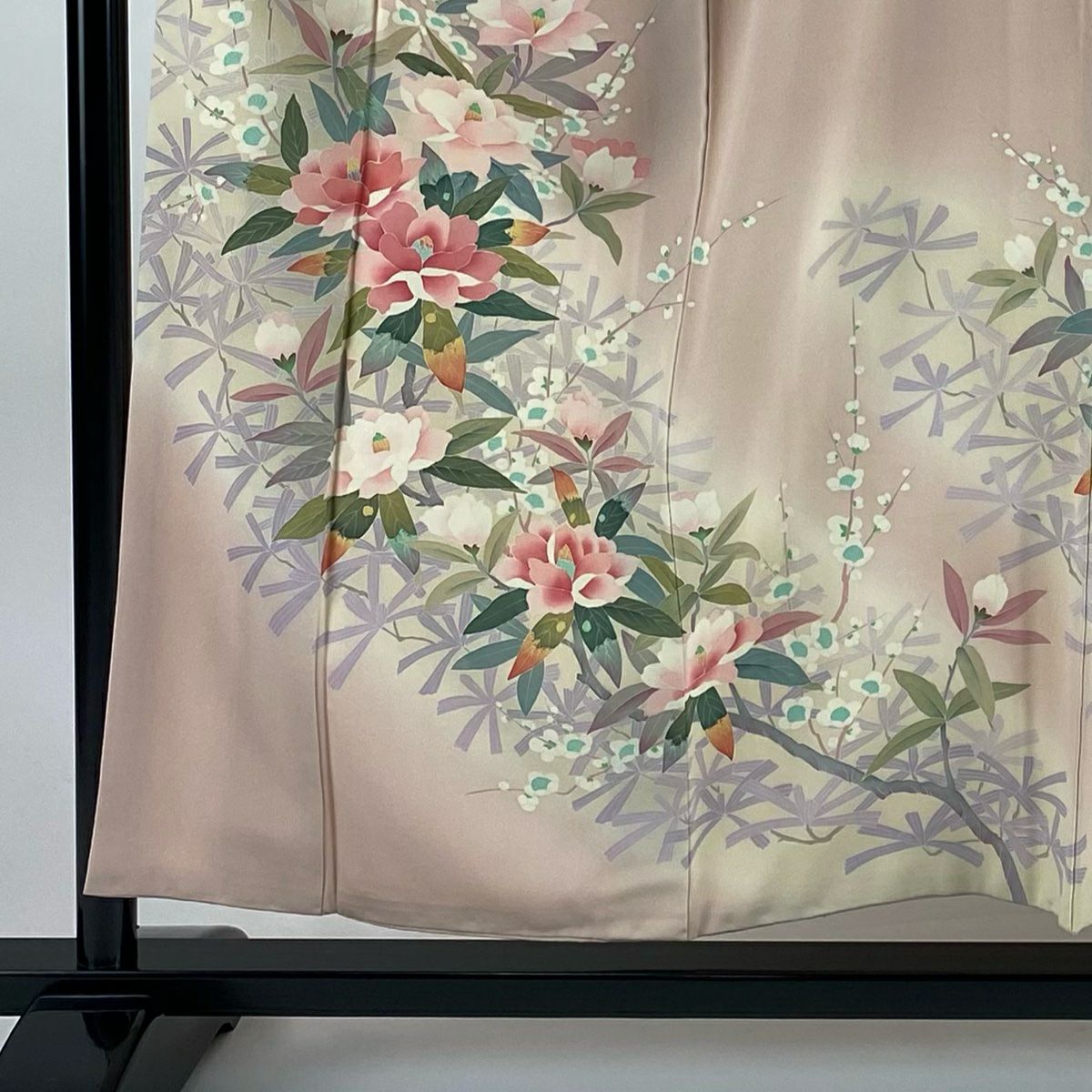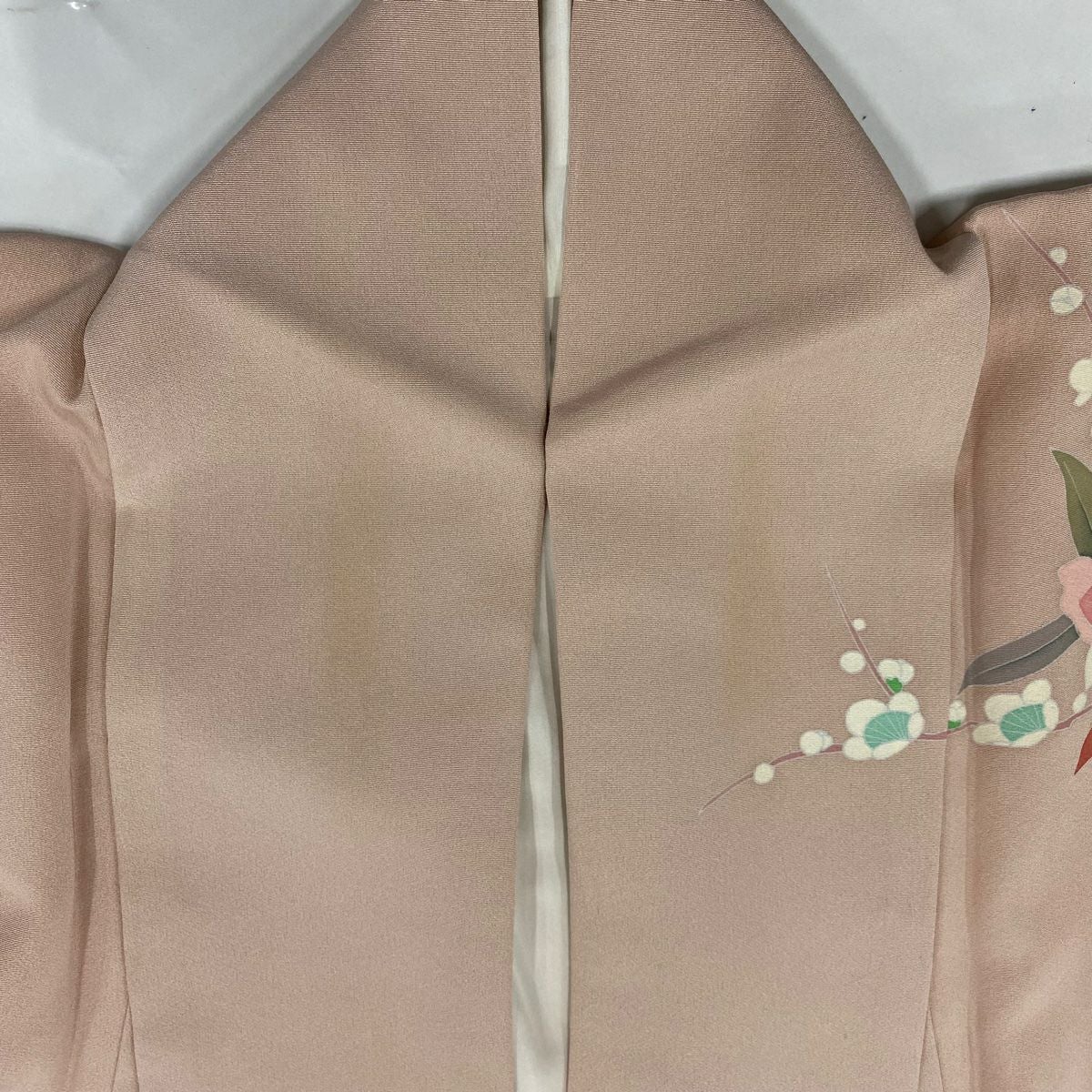【在庫一掃】 訪問着 身丈154.5cm 裄丈65cm M 袷 落款あり 椿 松梅 ぼかし 薄ピンク 正絹 秀品