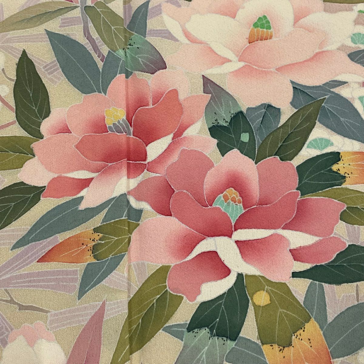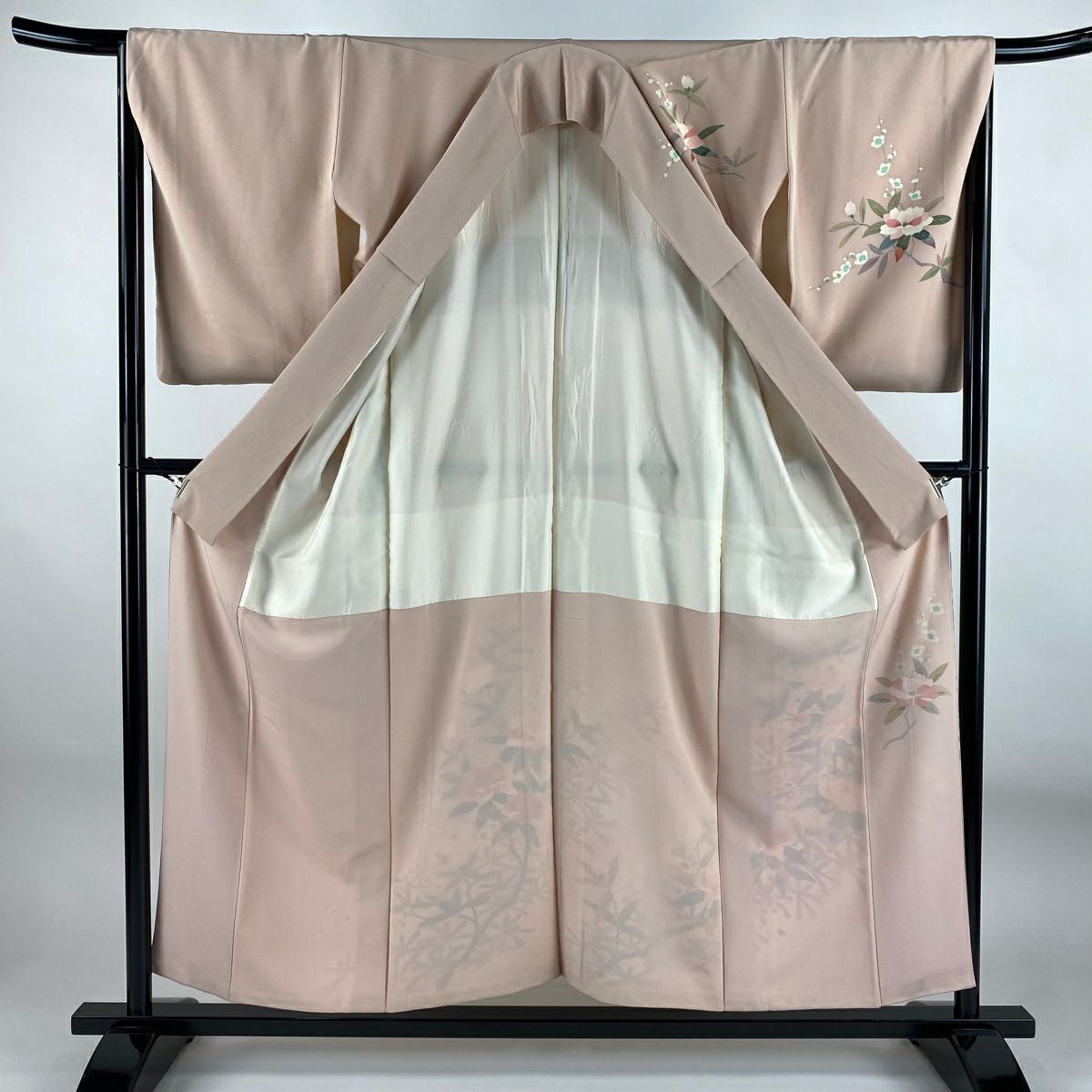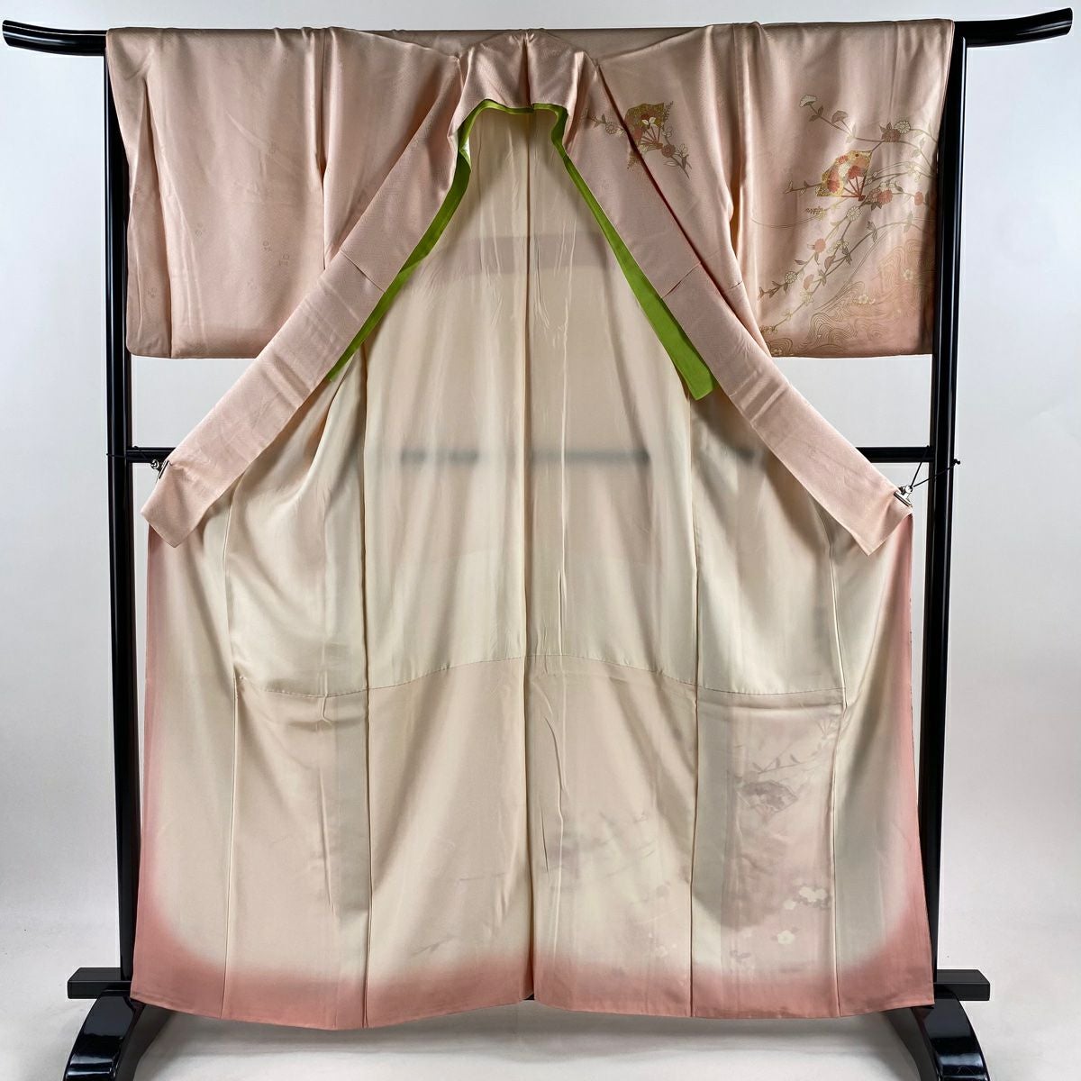 【在庫一掃】 付下げ 身丈153cm 裄丈62cm S 袷 椿 流水 染め分け ピンクベージュ 正絹 秀品