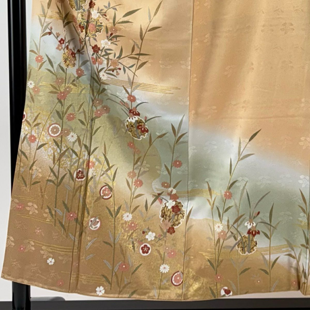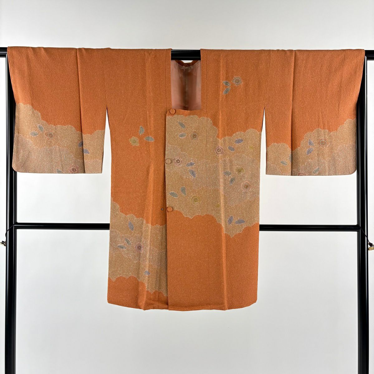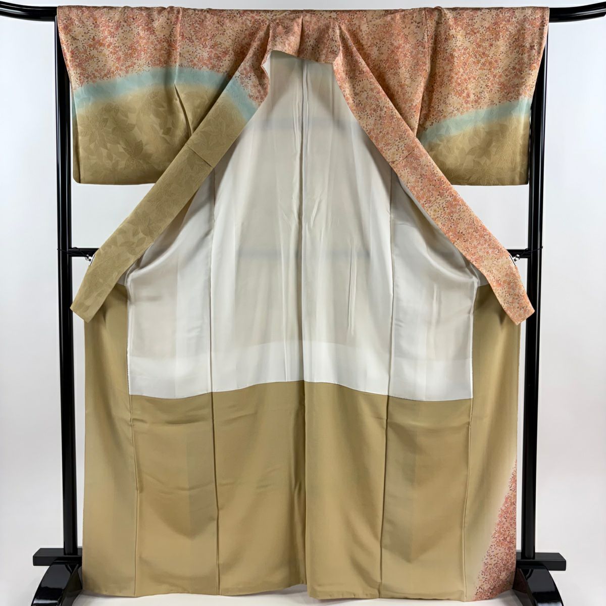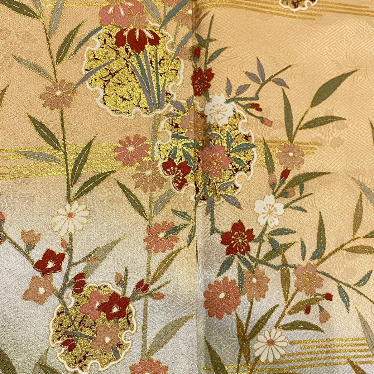 【在庫一掃】 訪問着 身丈155.5cm 裄丈66cm M 袷 雪輪 草花 金彩 ぼかし 薄オレンジ 正絹 秀品